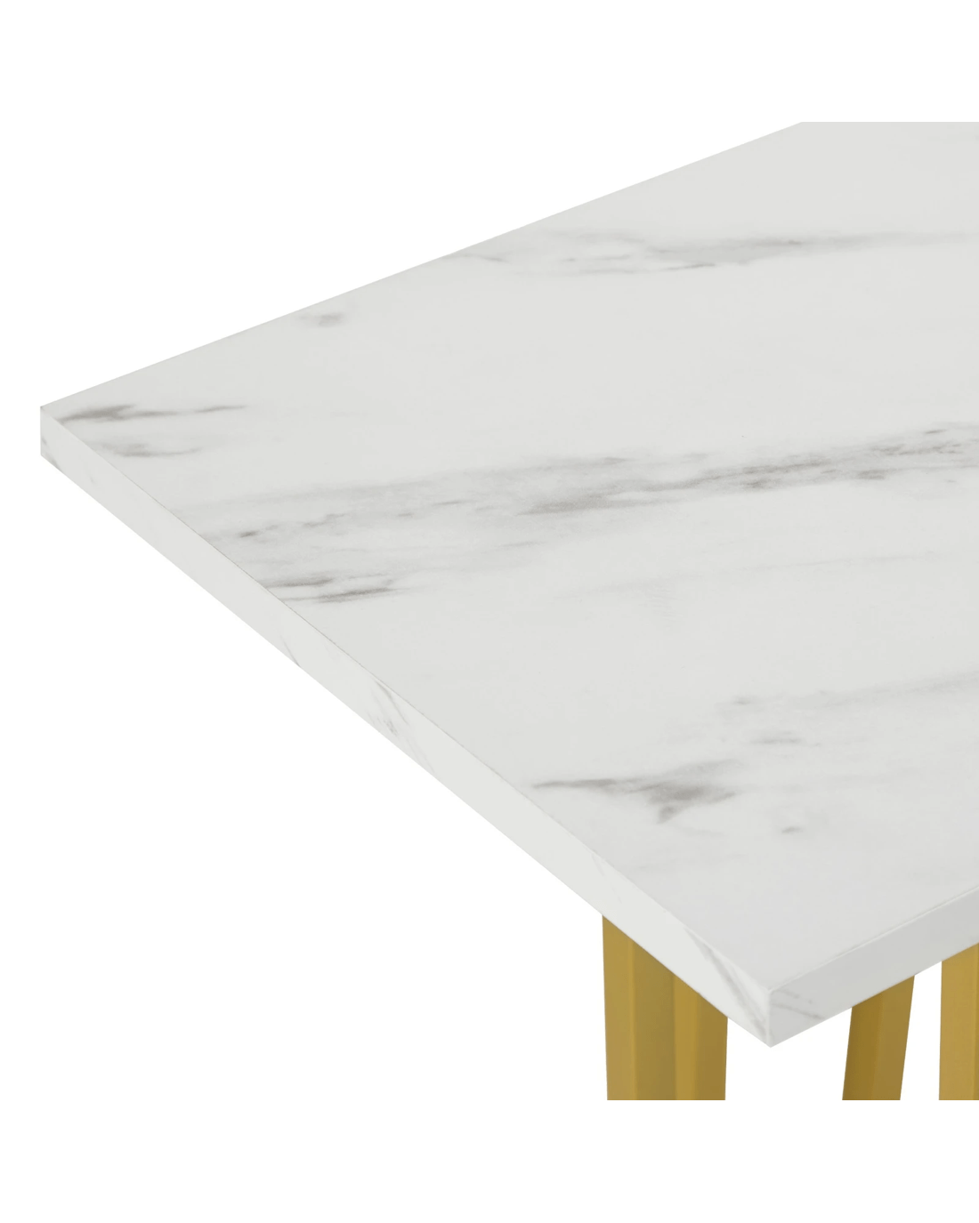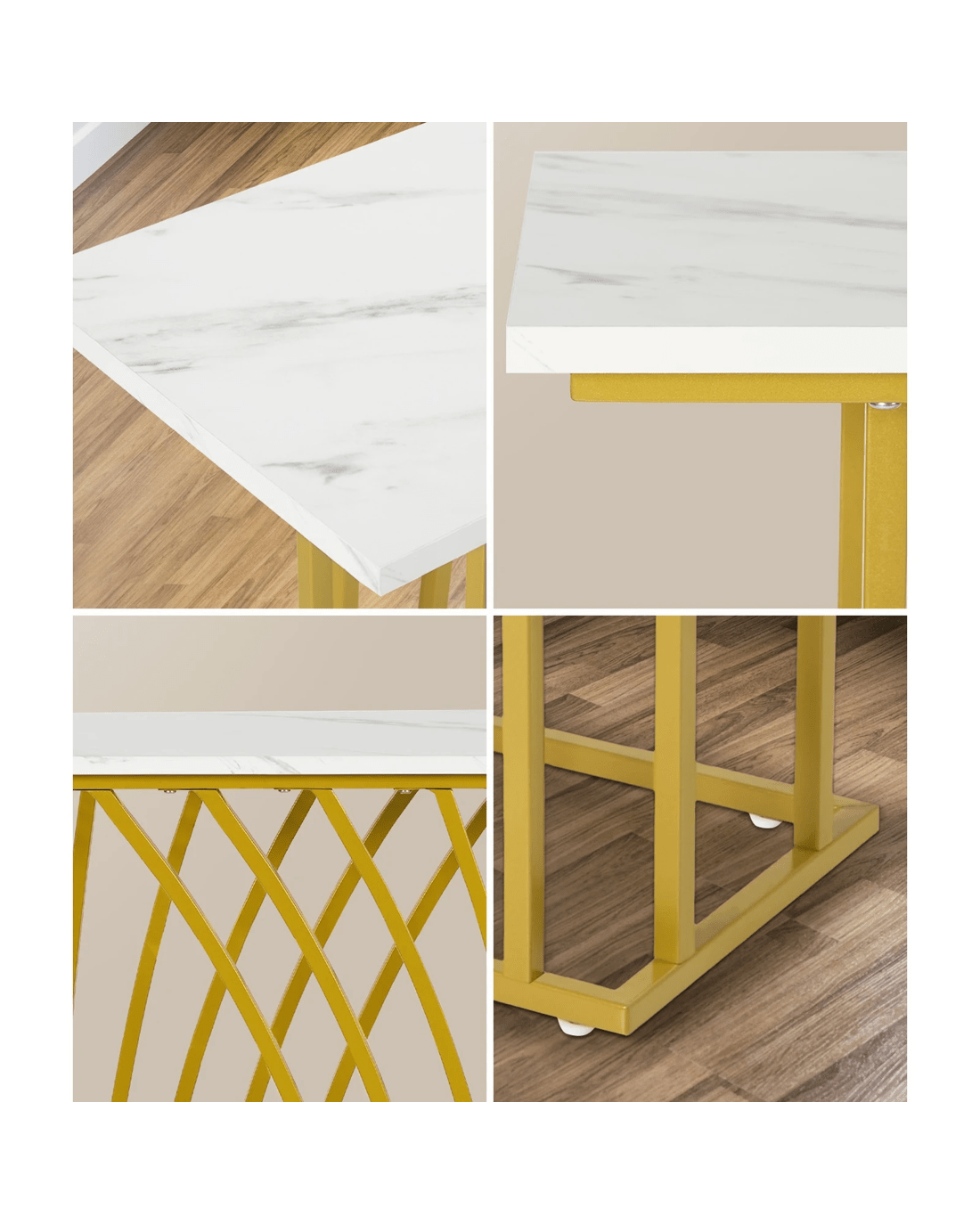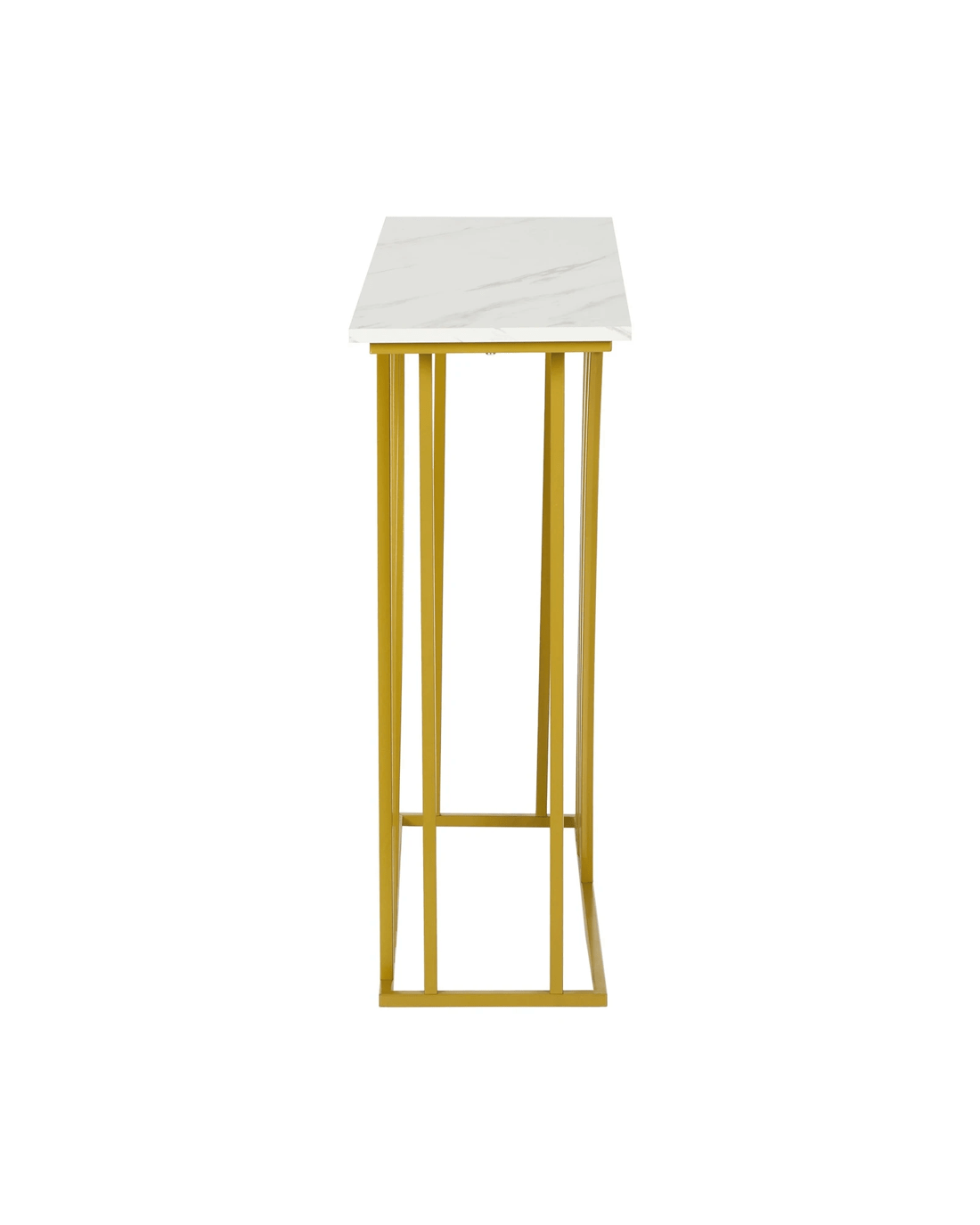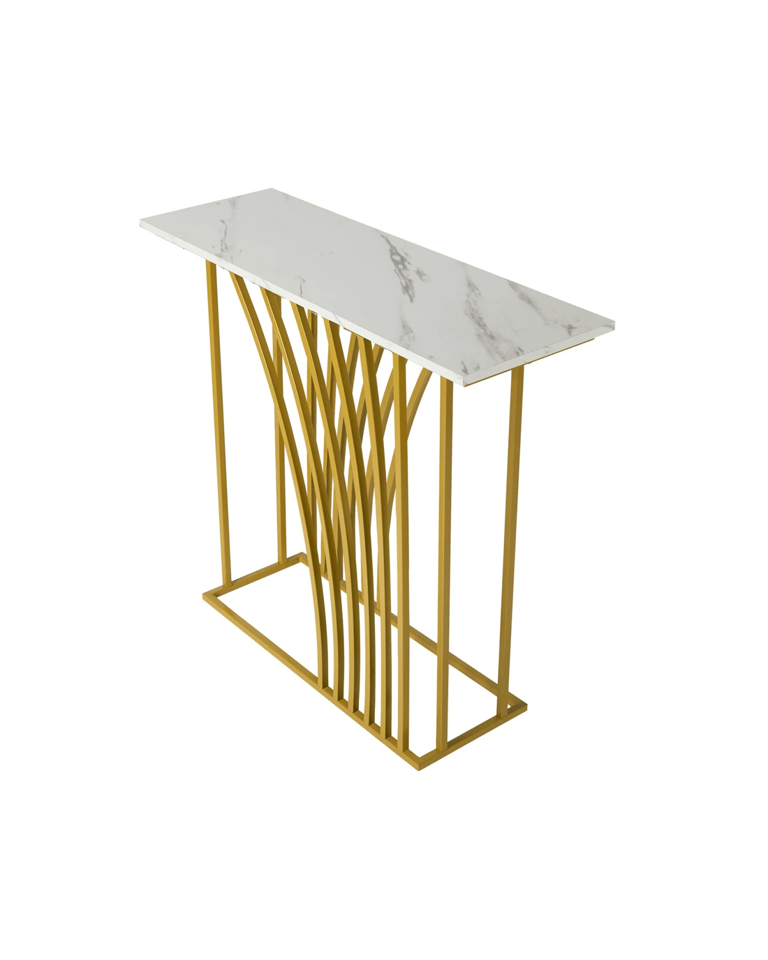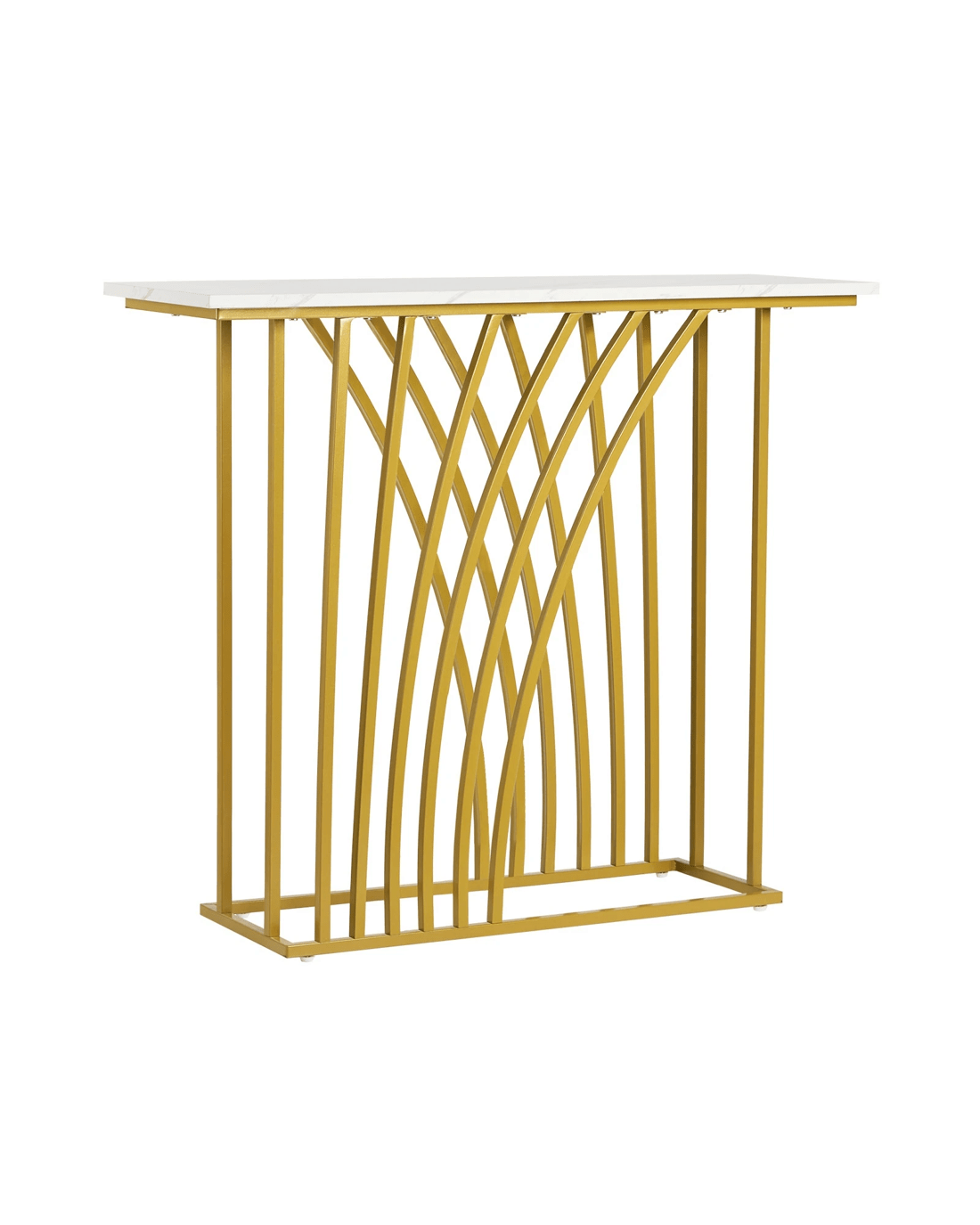 Crafted with high-quality materials with close attention to details, our console table is built to last. The unique curved gold-plated stand - an eye-catching feature that captures immediate attention - provides a solid structure for the console table, while the smooth and marble-like twin tabletop offers a sleek and sophisticated surface for displaying decorative items or everyday essentials. The clean lines and sleek design will complement any decor style with ease. Better still, its presence need not be at just the hallway but in every living space or room that warrants your creativity and imagination.