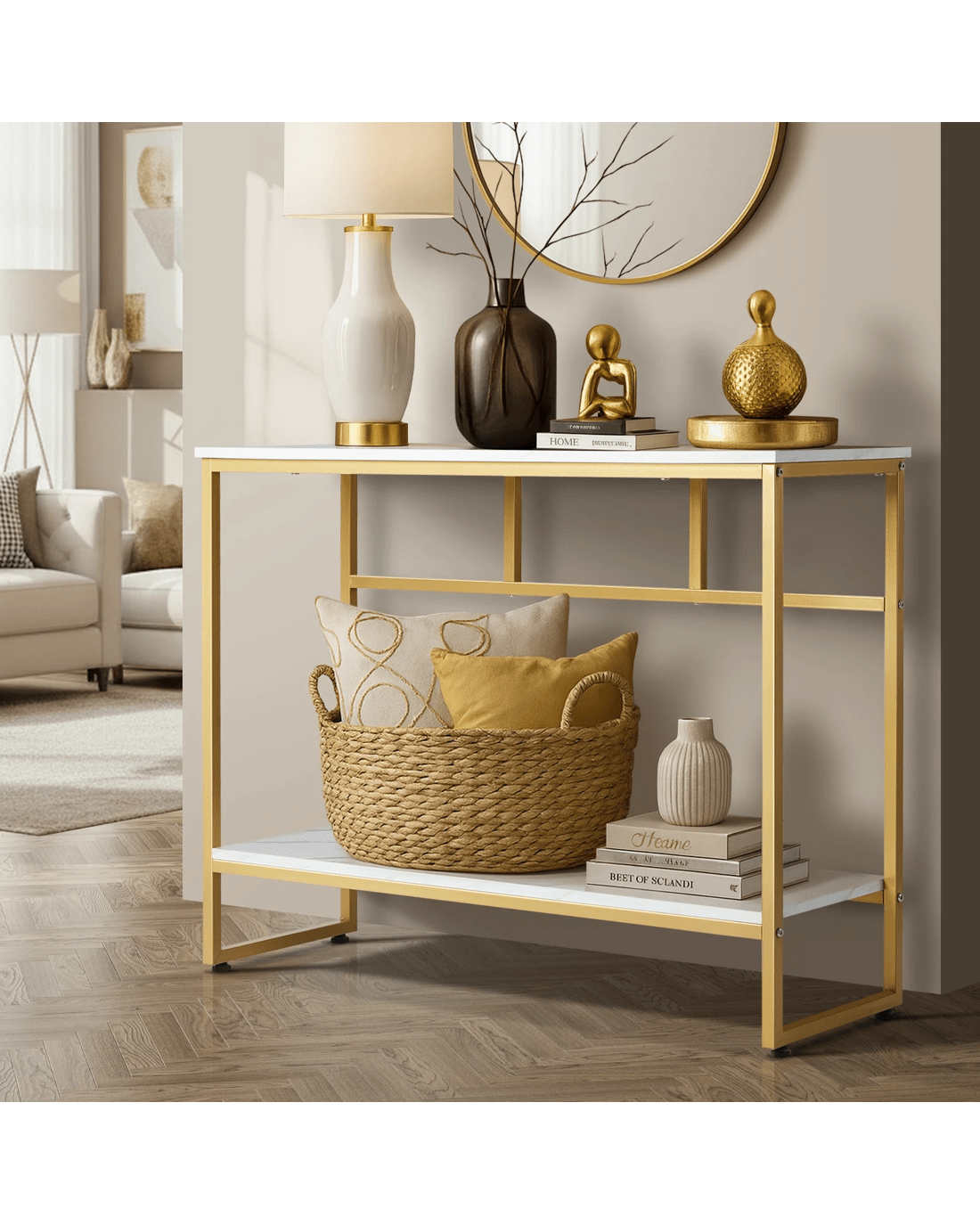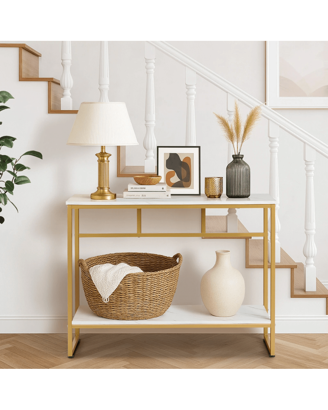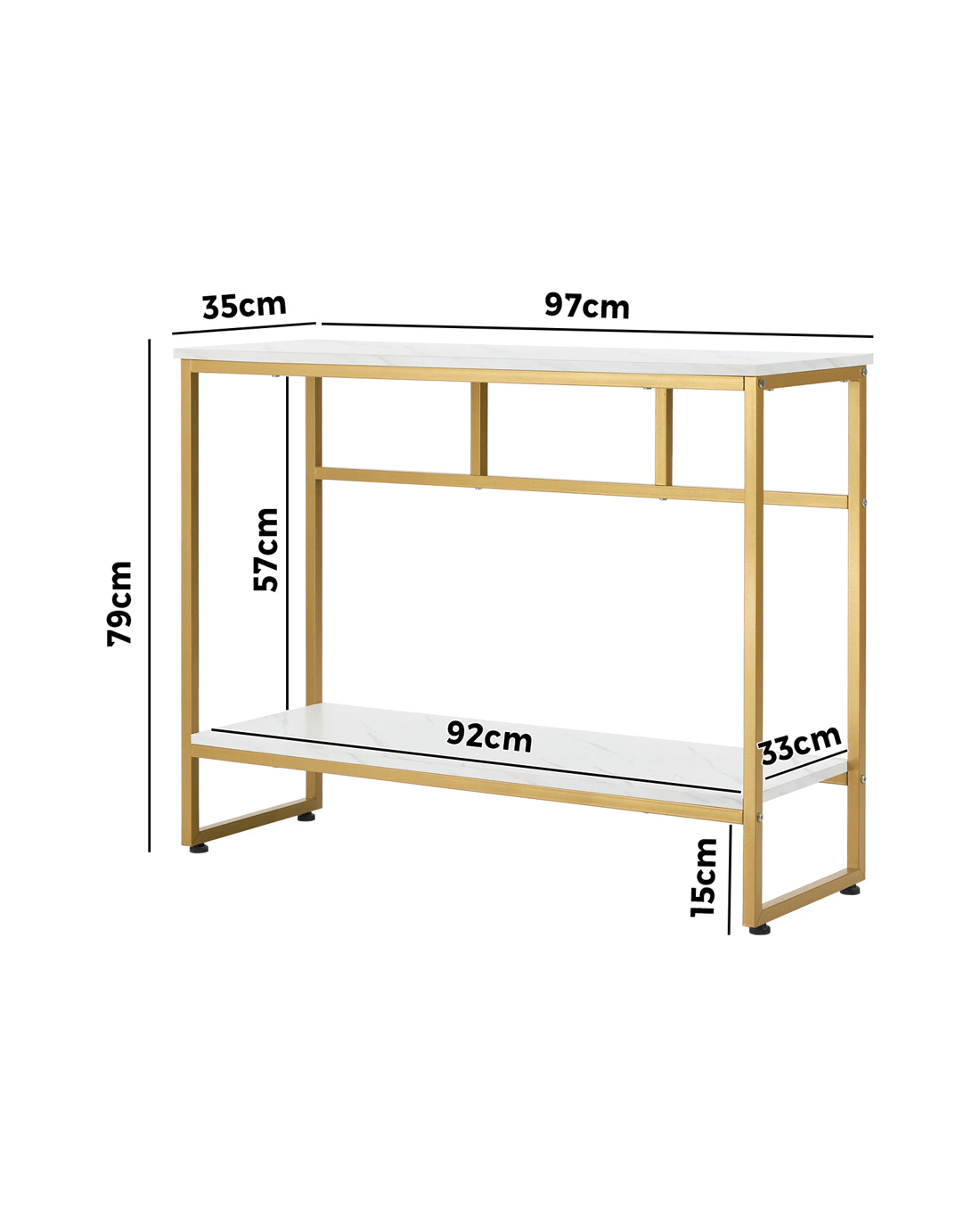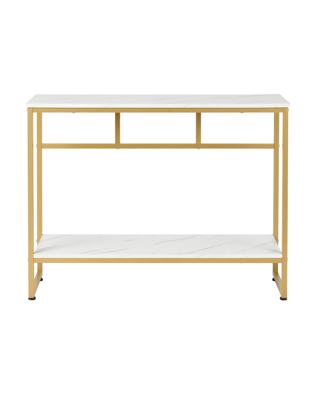 Crafted with high-quality materials with close attention to details, our console table is built to last. The sturdy powder-coated metal frame provides a solid structure for the console table, while the smooth and marble-like twin tabletops offer a sleek and sophisticated surface for displaying decorative items or everyday essentials. The clean lines and sleek design will complement any decor style with ease. Better still, its presence need not be at just the hallway but in every living space or room that warrants your creativity and imagination.