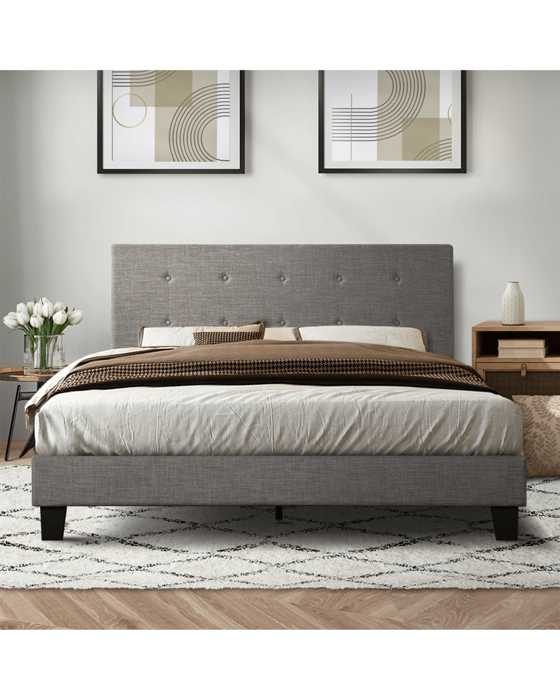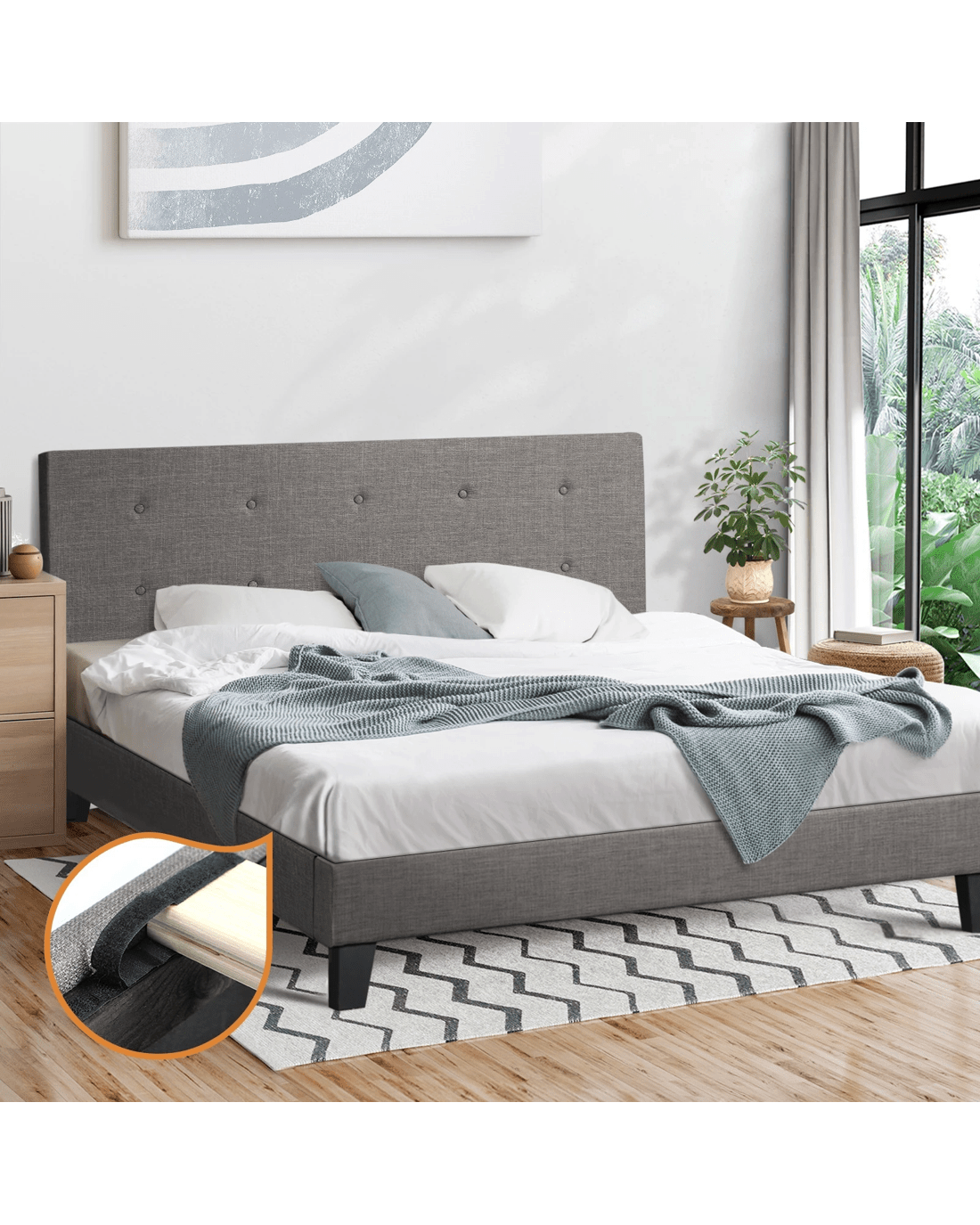 Featuring an expansive and quilted bedhead design, the Oikiture Polo Bed Frame oozes a blend of classic elegance and contemporary flair to add to any bedroom decor. And its form also merits its function. Lean back to read, watch TV or interact with your favourite media devices, the supportive bedhead ensures many hours of pleasure without encountering any stress or strain. All around, the plush grey faux fabric upholstery that covers the bed frame from head to end is soft to the touch and creates a swank and intimate aura to accompany your calm and restful sleep. And true to its character, the bed frame finishing is meticulous with exacting workmanship all round. Inside, the thick 13mm plywood reinforced slats provide end-to-end support for the mattress while the sturdy legs ensure that the bed frame stands up to durable use time and again. Better still, setting up the bed frame is hassle-free with Velcro-enabled slats that simply fasten to the bed frame for better grip and stability. In fact, the entire bed frame assembly can be completed in less than 30 minutes. The Oikiture Polo Bed Frame is compatible for use with most Australian-sized mattresses and is available in King Single, Double, Queen and King sizes.