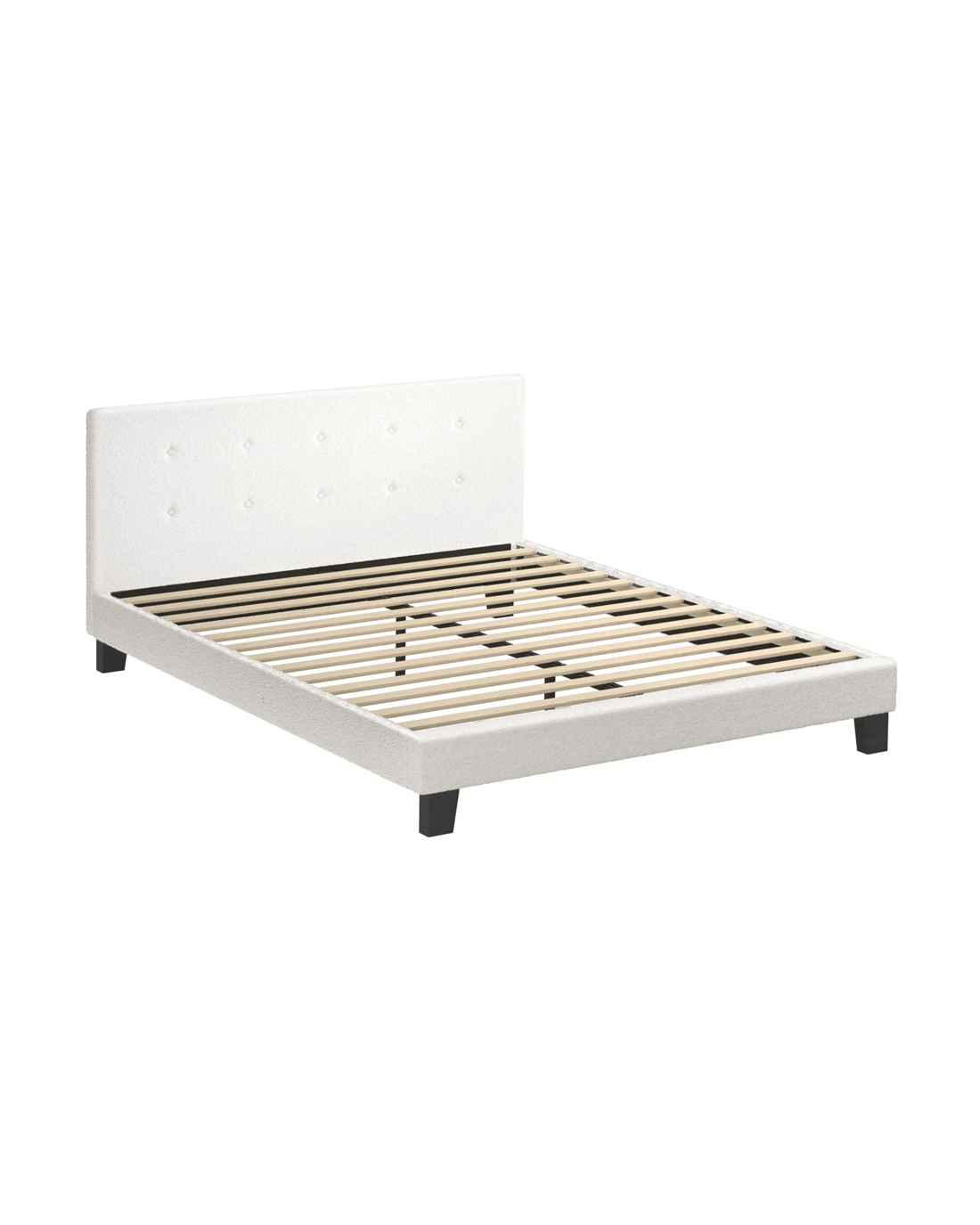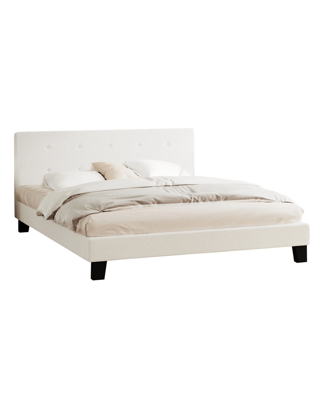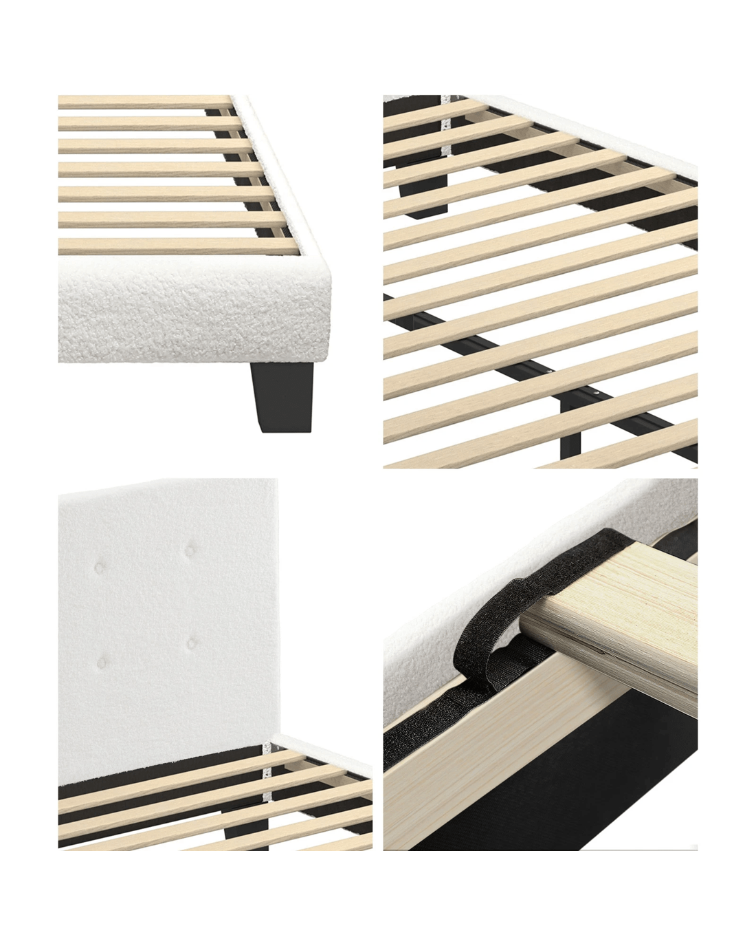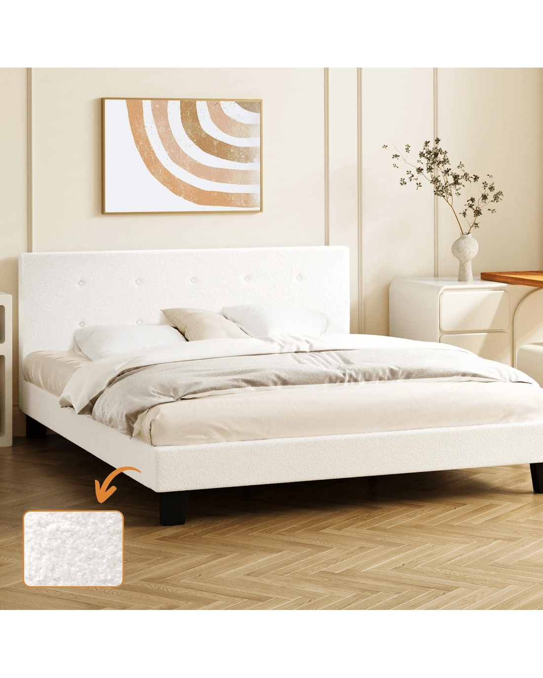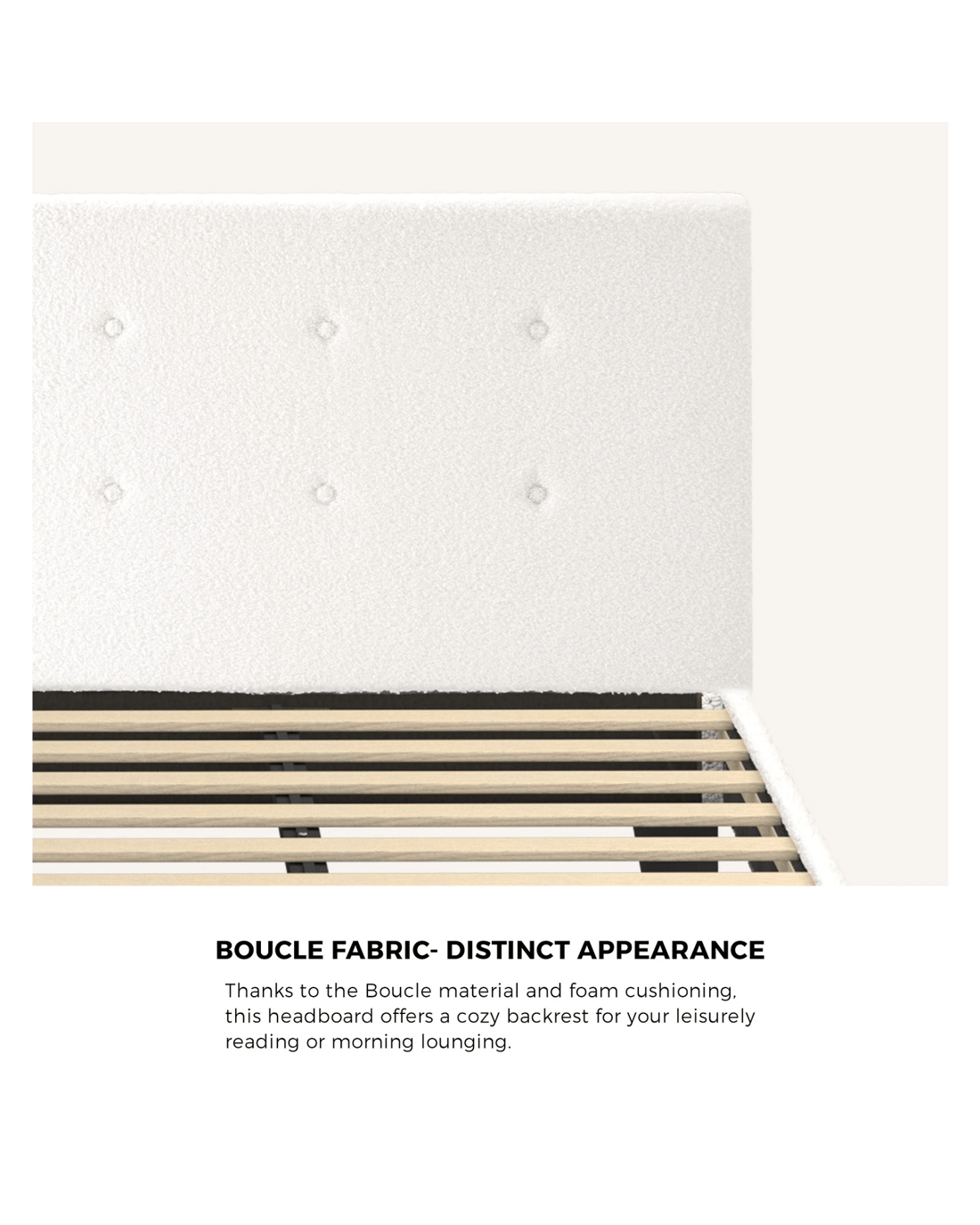 Featuring an expansive and quilted bedhead design, the Oikiture Polo Bed Frame oozes a blend of classic elegance and contemporary flair to add to any bedroom decor. And its form also merits its function. Lean back to read, watch TV or interact with your favourite media devices, the supportive bedhead ensures many hours of pleasure without encountering any stress or strain. All around, the chic white Boucle fabric upholstery that covers the bed frame from head to end is soft to the touch and creates a swank and intimate aura to accompany your calm and restful sleep. And true to its character, the bed frame finishing is meticulous with exacting workmanship all round. Inside, the thick 13mm plywood reinforced slats provide end-to-end support for the mattress while the sturdy legs ensure that the bed frame stands up to durable use time and again. Better still, setting up the bed frame is hassle-free with Velcro-enabled slats that simply fasten to the bed frame for better grip and stability. In fact, the entire bed frame assembly can be completed in less than 30 minutes. The Oikiture Polo Bed Frame is compatible for use with most Australian-sized mattresses and is available in King Single, Double, Queen and King sizes.