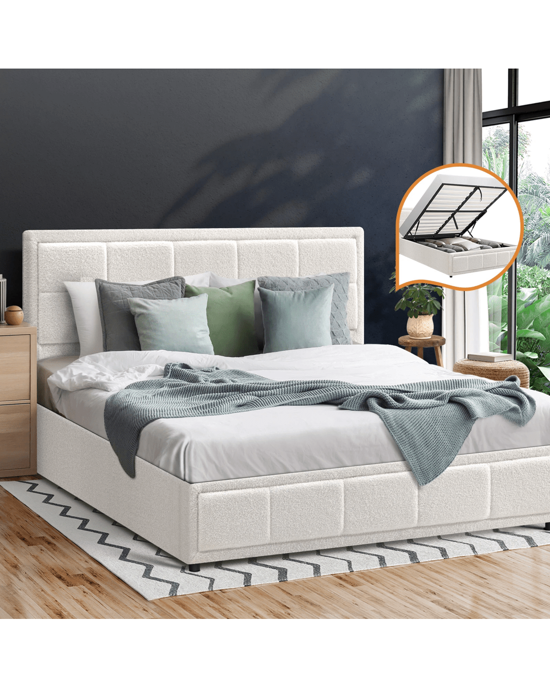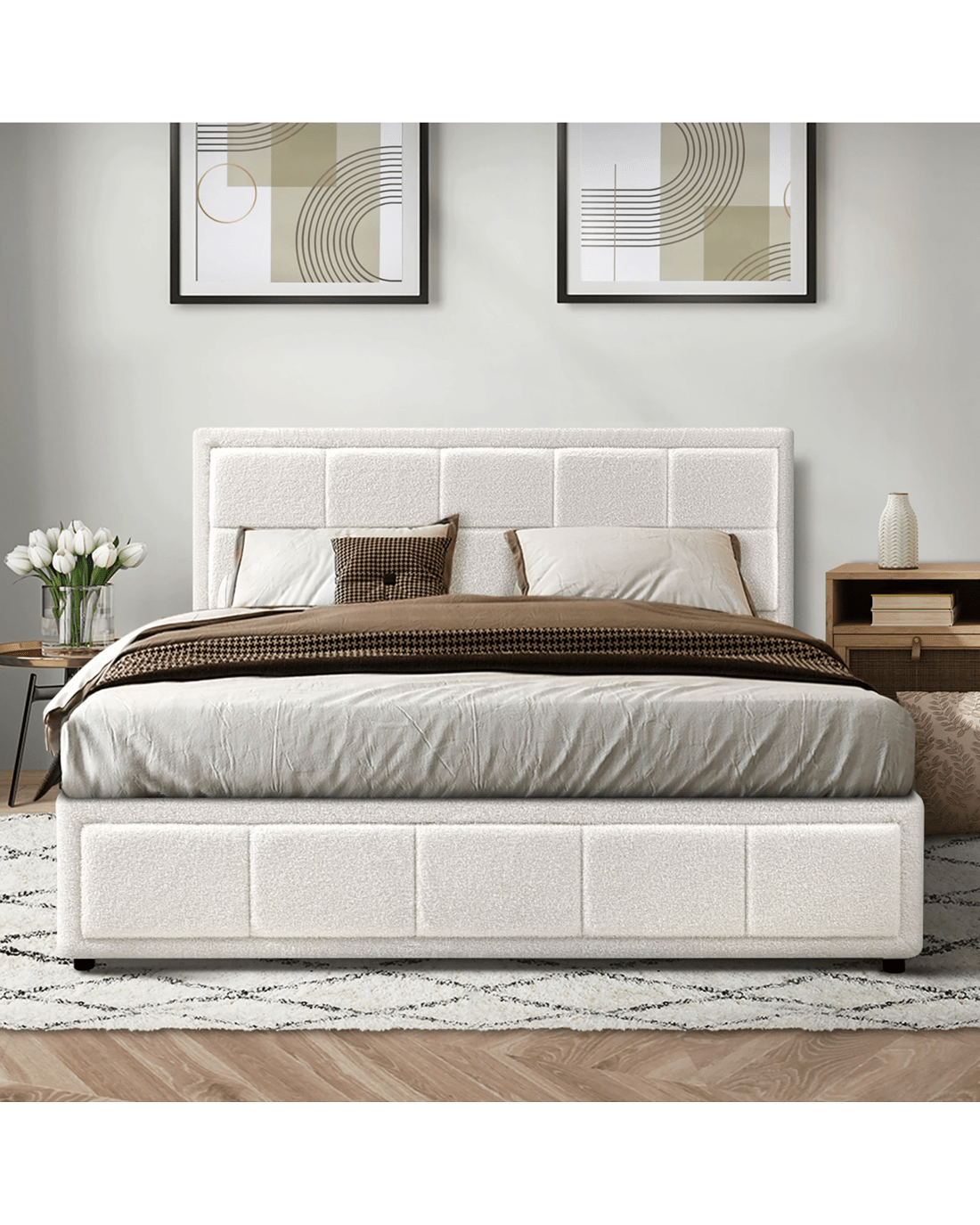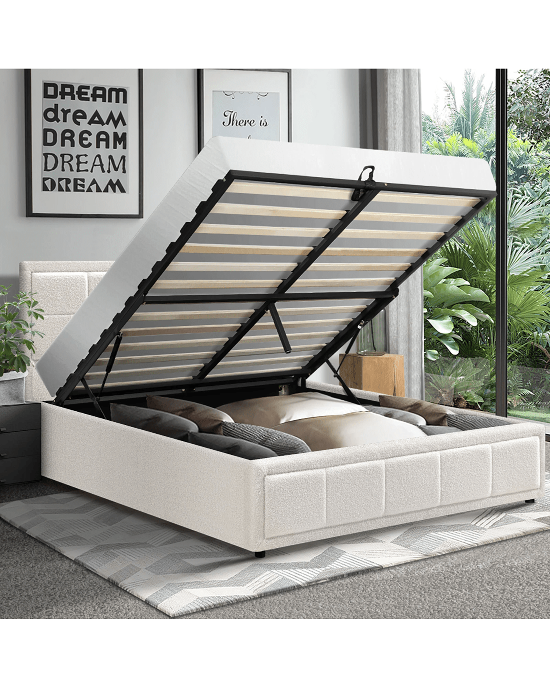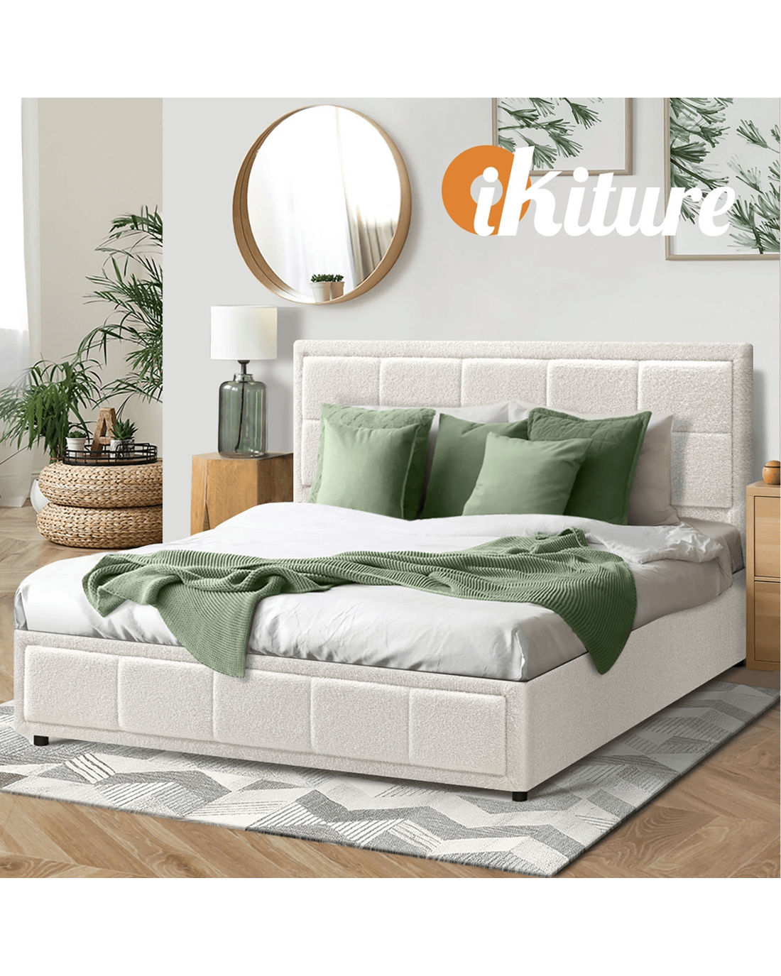 Sold by Kamprad's Oikos 1943Oikiture Double Bed Frame Gas Lift Storage Base Boucle Fabric - White