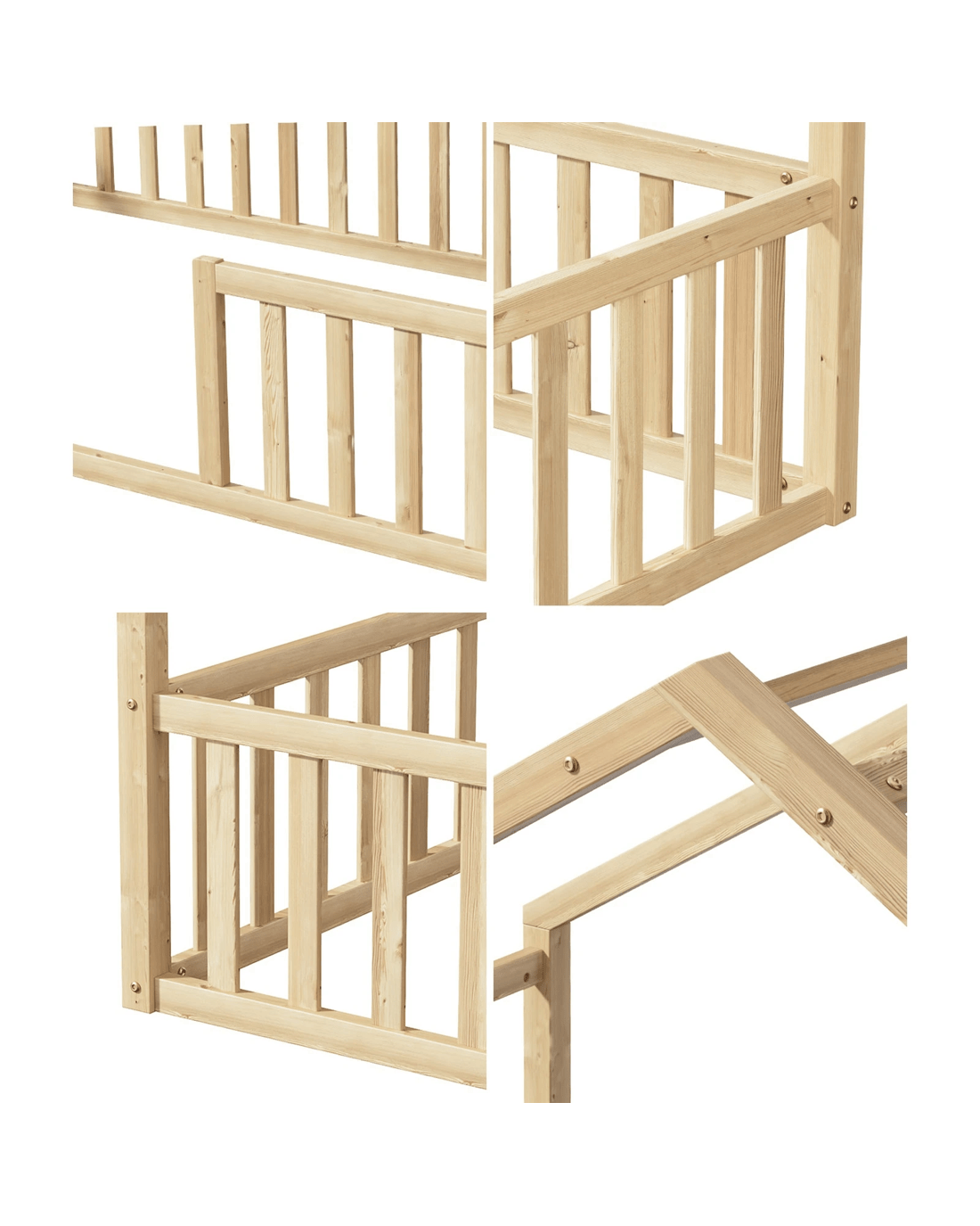 Constructed of solid pine wood and MDF, the sturdy frame is strong and durable with rounded corners, and smooth edges and joints. The finishing is meticulous with non-toxic and SGS-approved paintwork to ensure your child is never at risk with any undesirable substances. And the bed frame boundary fence also helps to provide a safe zone for sleep and play.