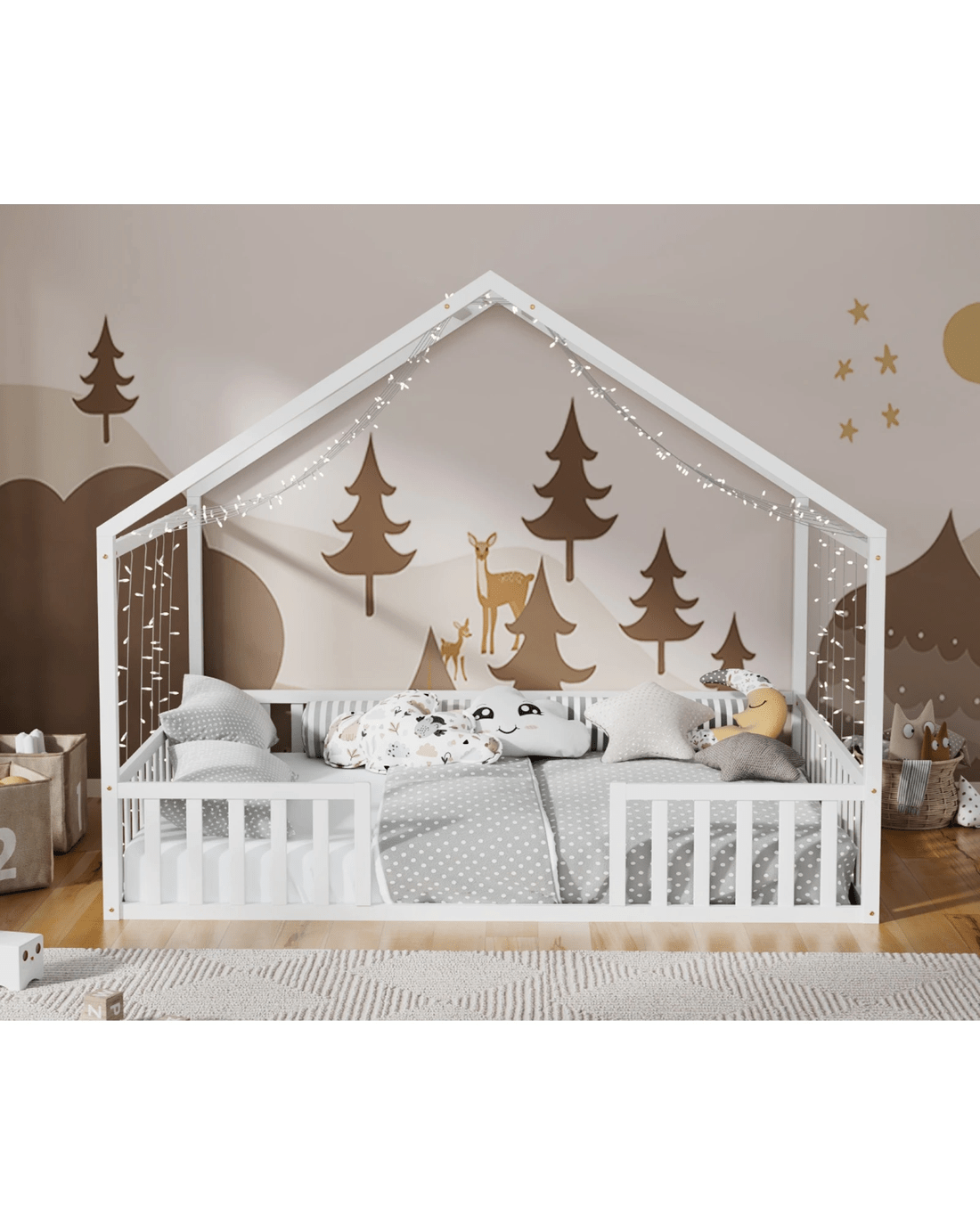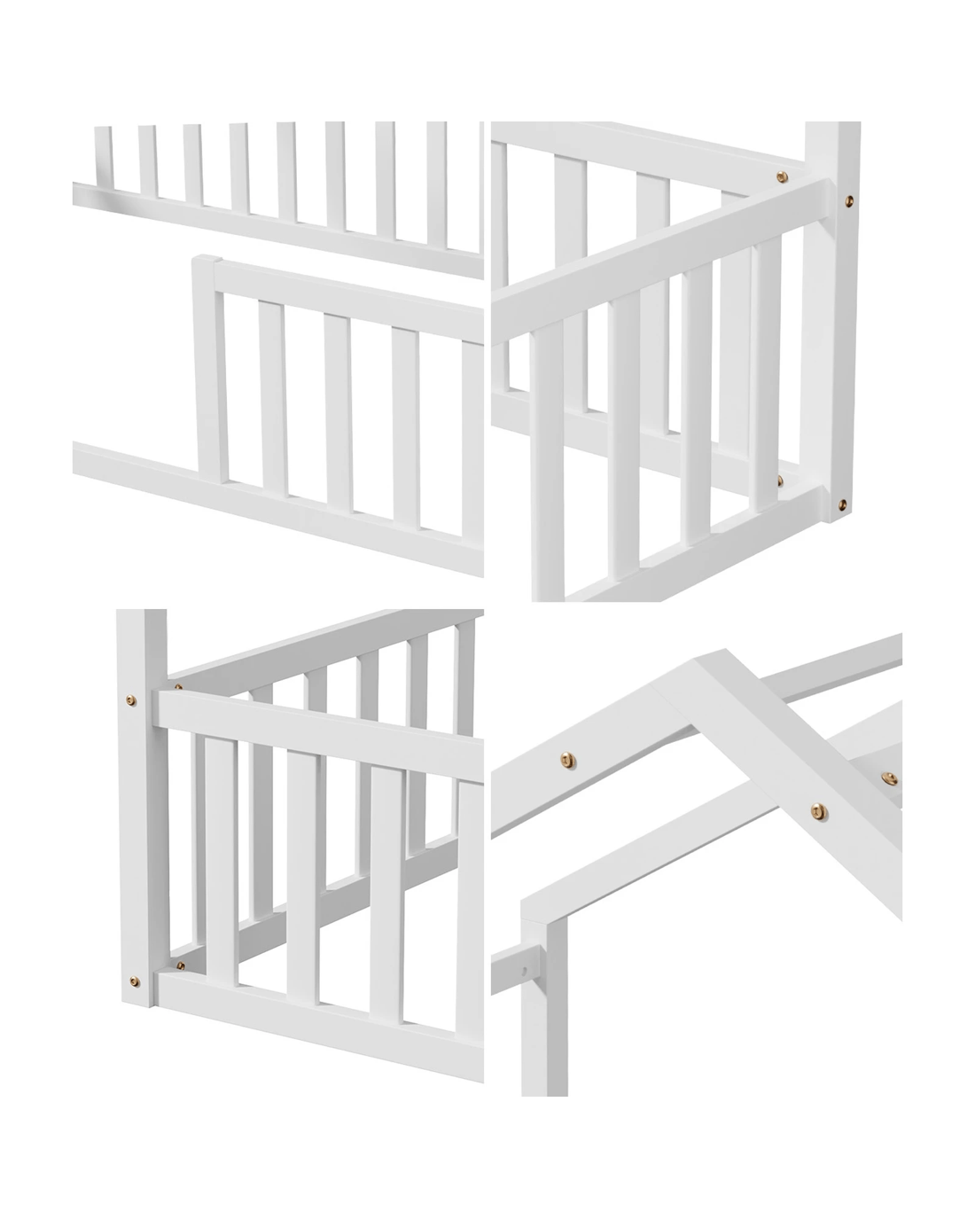Constructed of solid pine wood and MDF, the sturdy frame is strong and durable with rounded corners, and smooth edges and joints. The finishing is meticulous with non-toxic and SGS-approved paintwork to ensure your child is never at risk with any undesirable substances. And the bed frame boundary fence also helps to provide a safe zone for sleep and play.