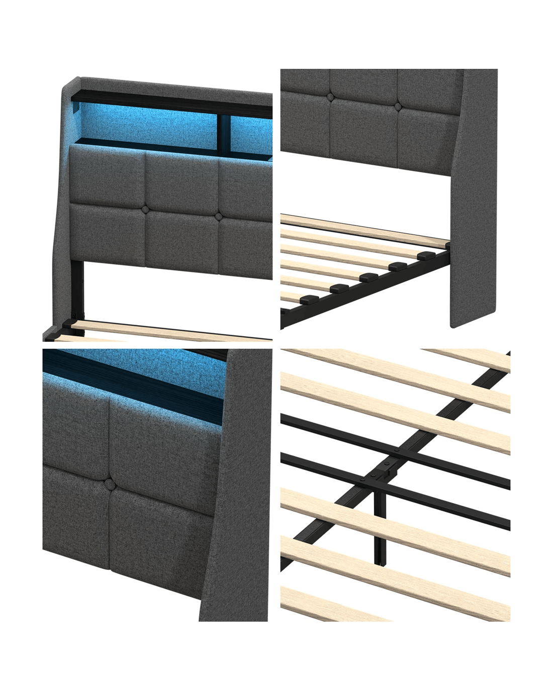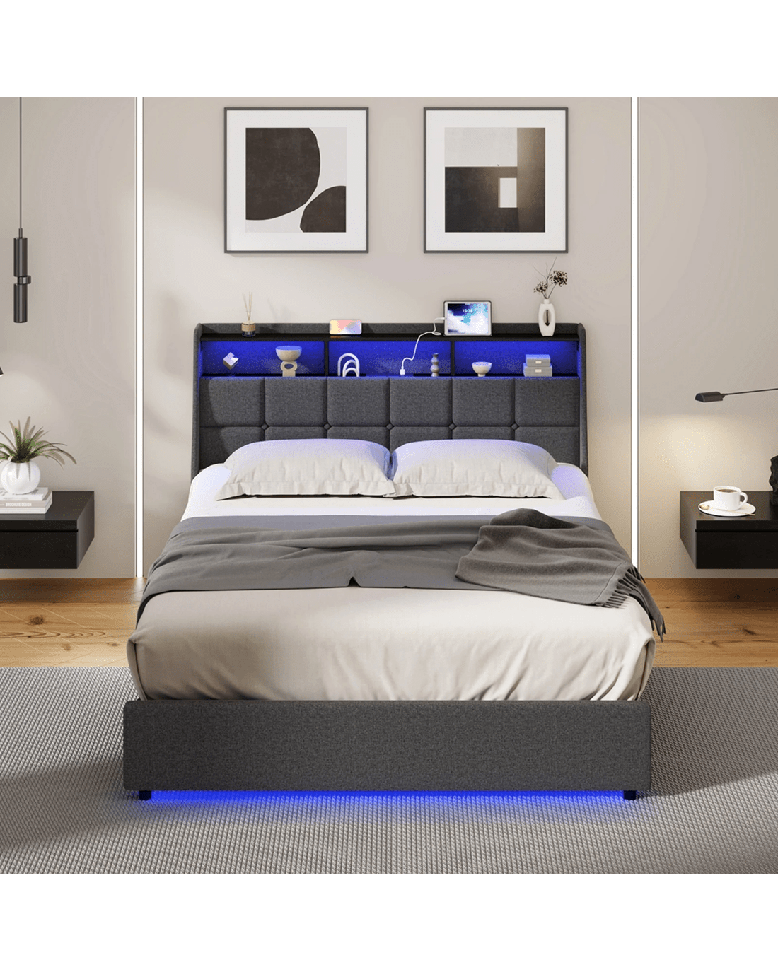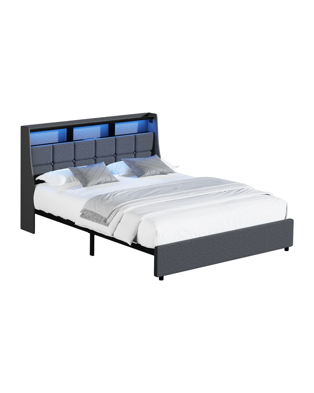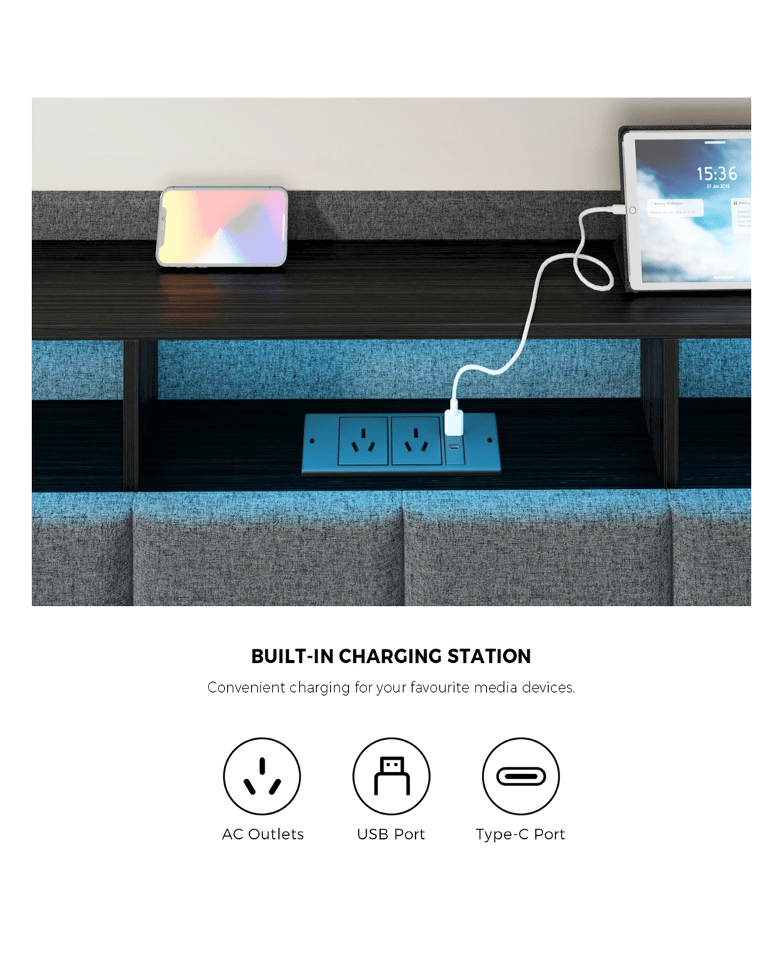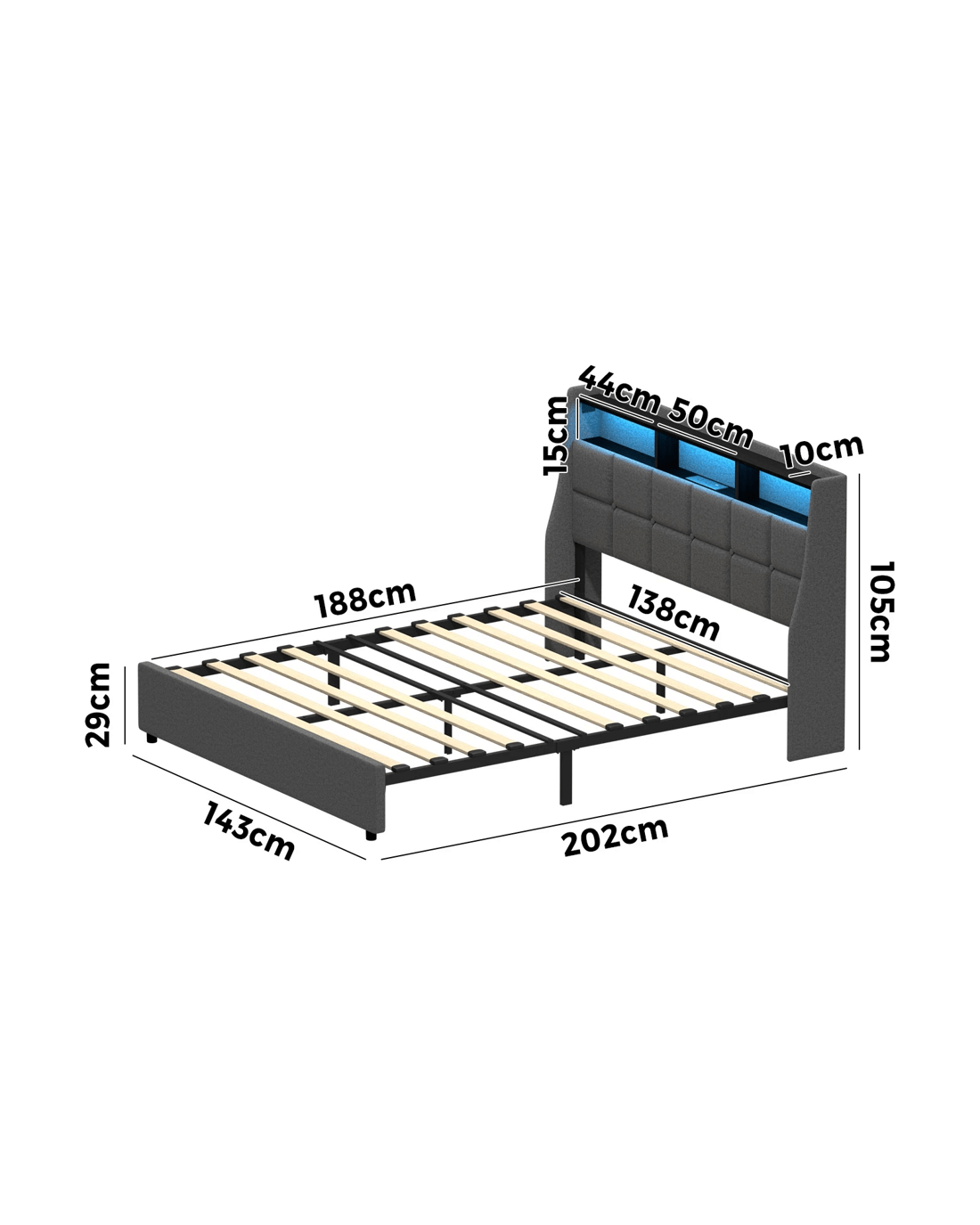 Sold by Kamprad's Oikos 1943Oikiture Double Size Bed Frame LED Storag Headboard & Charging Station - Grey