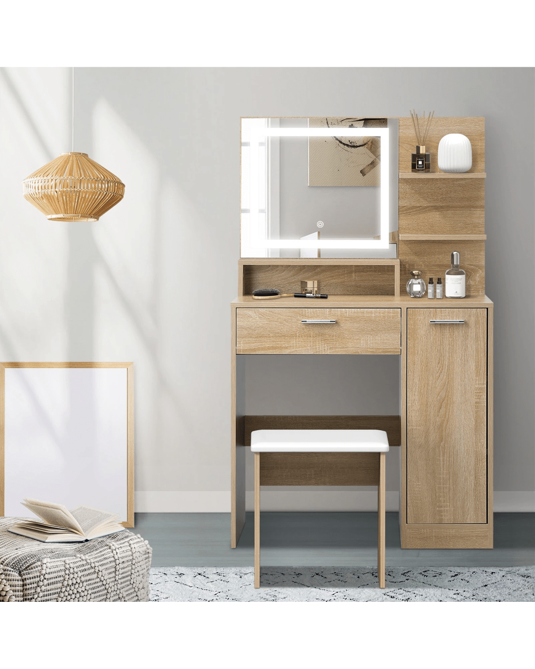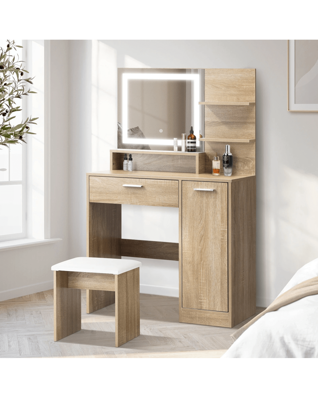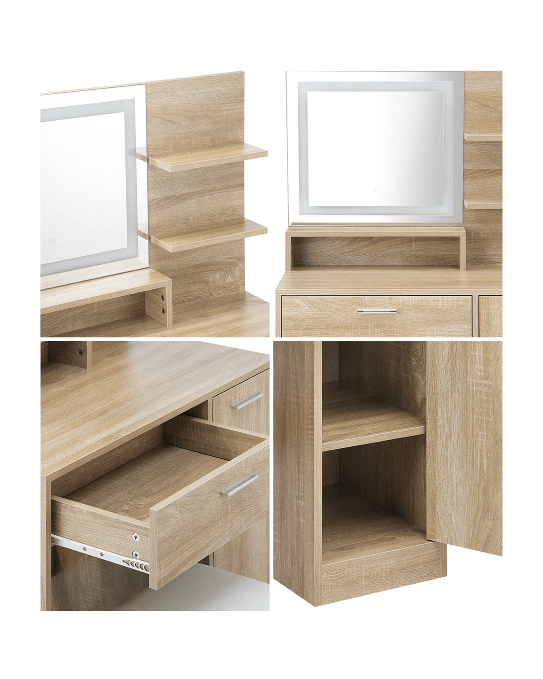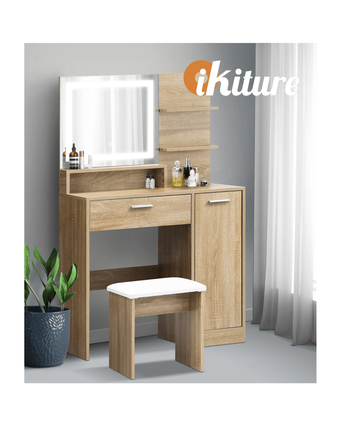 Sold by Kamprad's Oikos 1943Oikiture Dressing Table Stool Set Makeup Mirror Led Light Large Cabinet - Natural