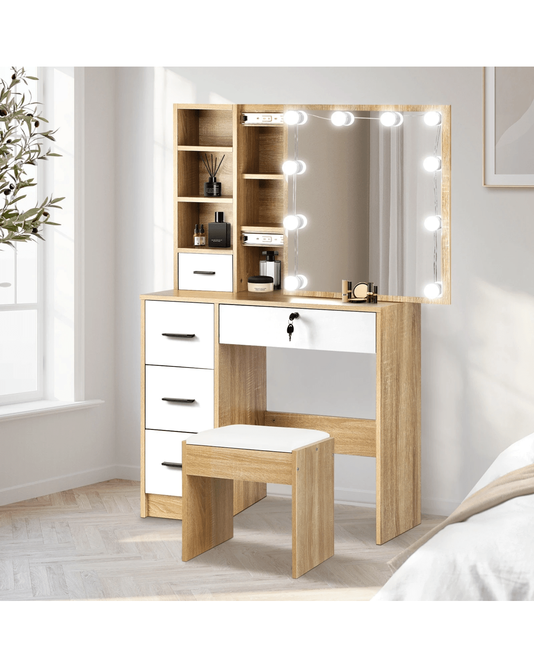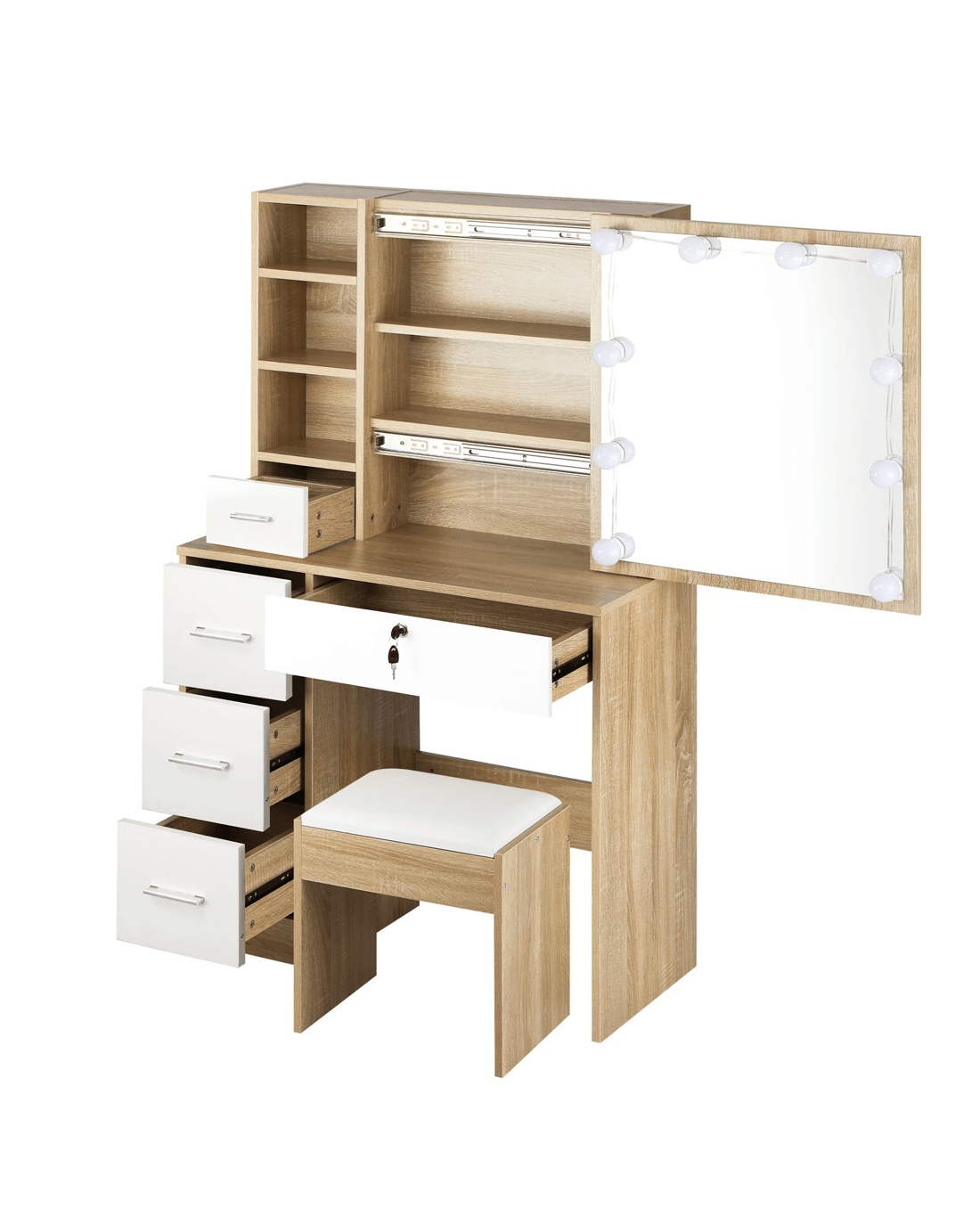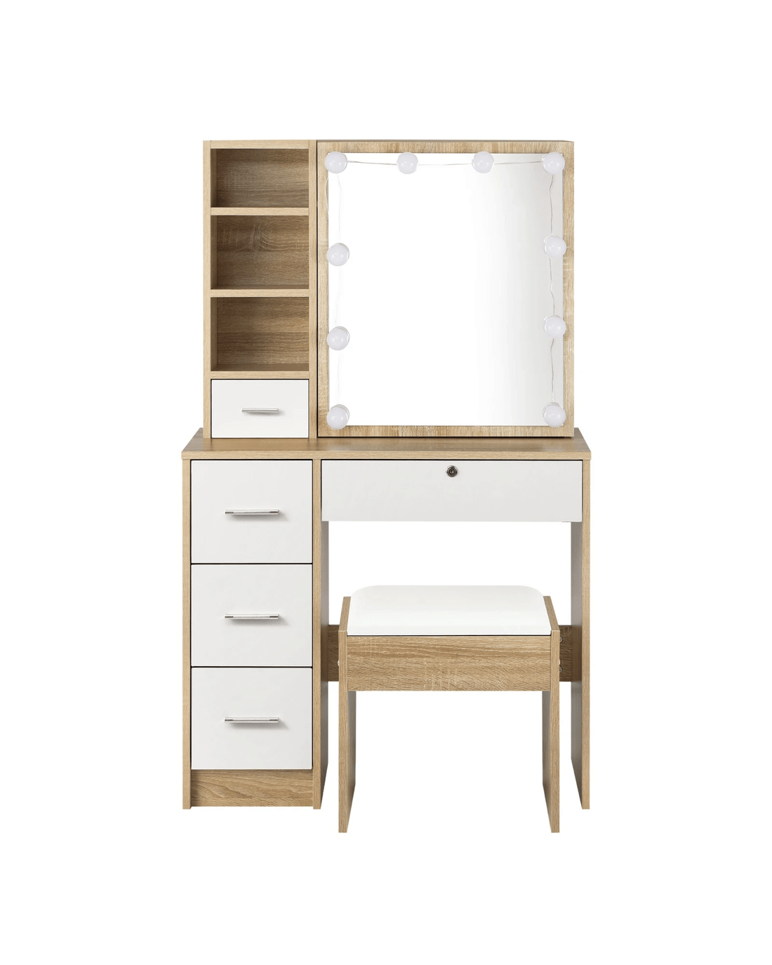 Sold by Kamprad's Oikos 1943Oikiture Dressing Table Stool Set Slide Mirror Drawer 10 Led Bulbs - Multi