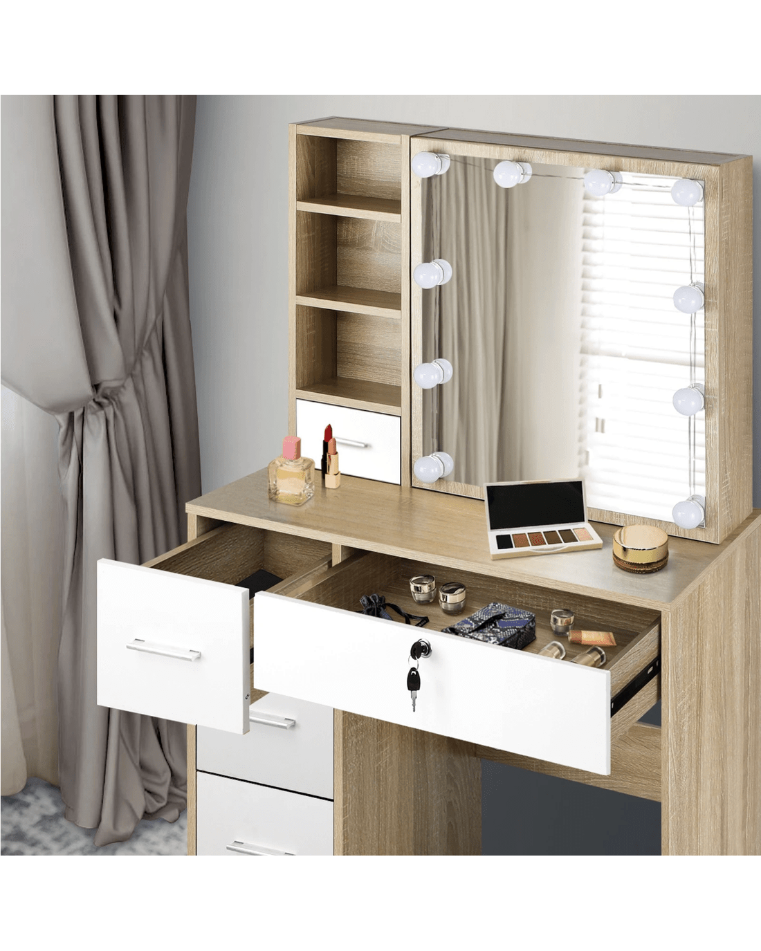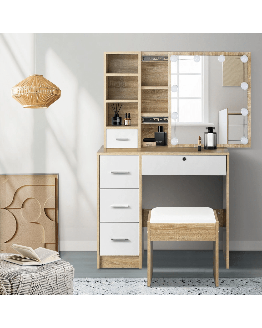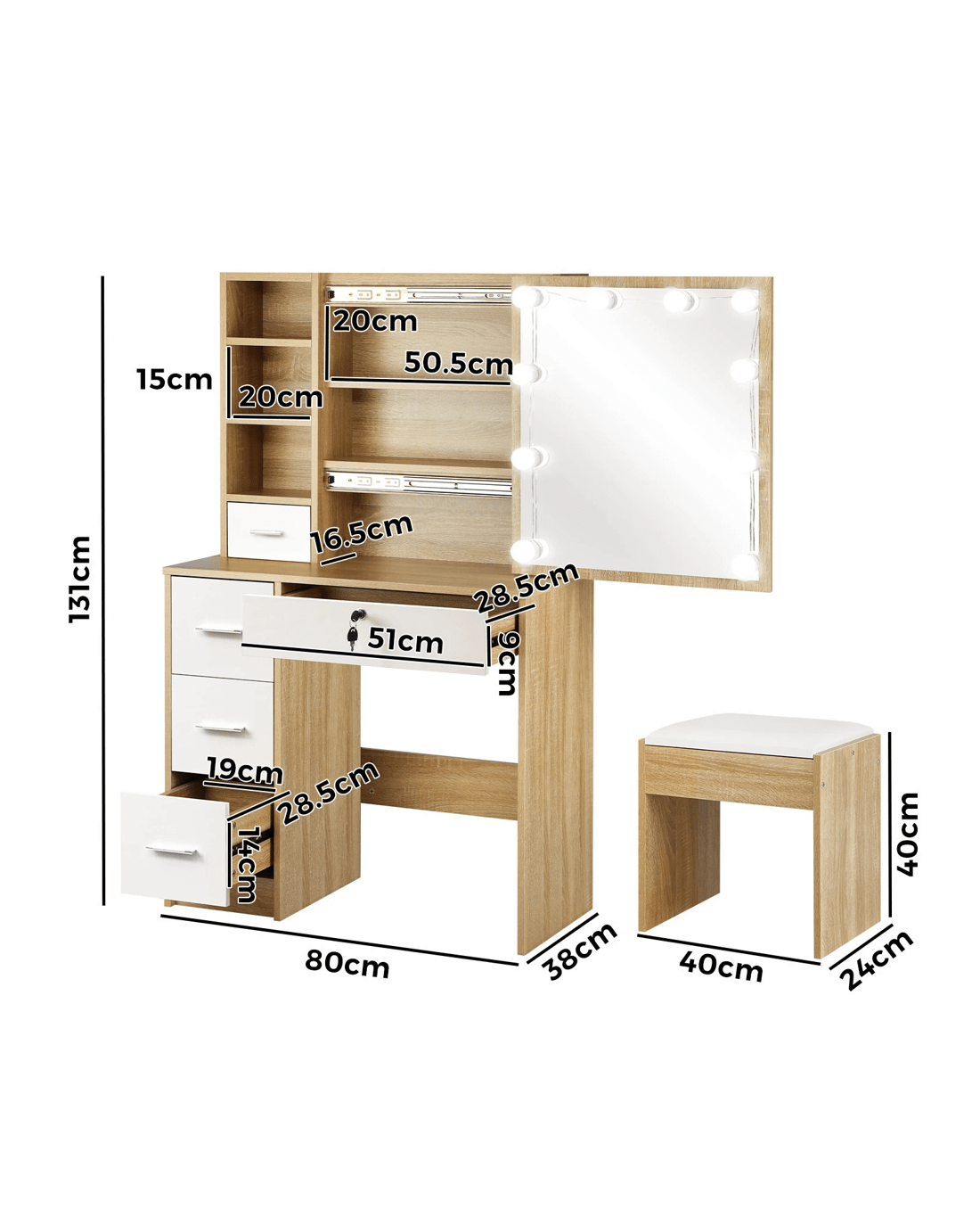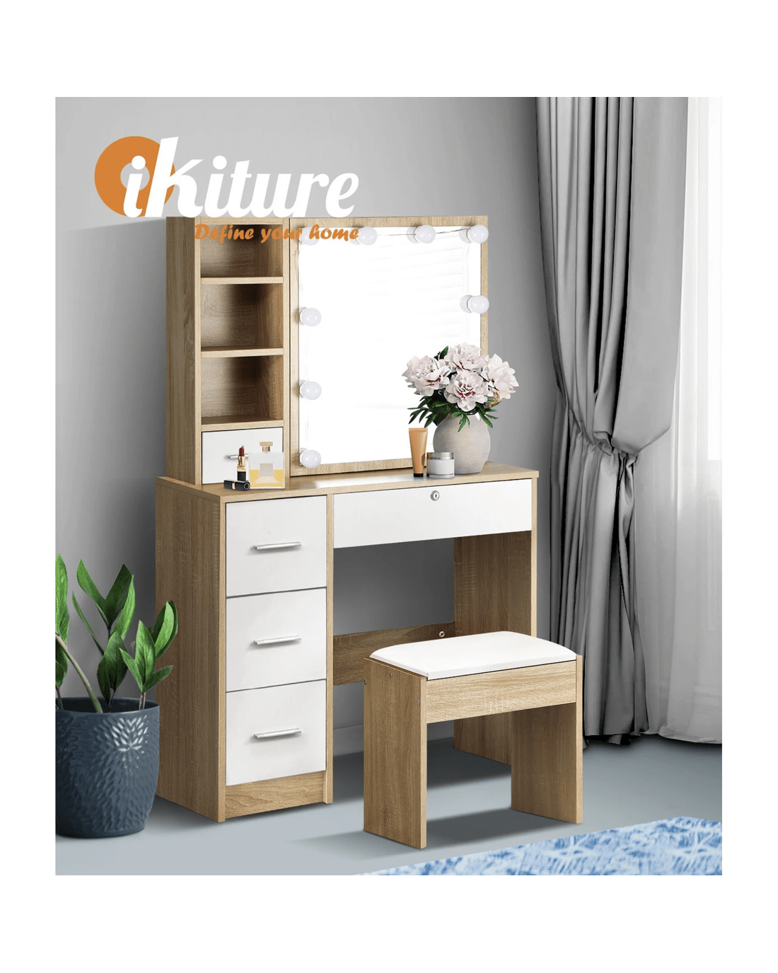 Sold by Kamprad's Oikos 1943Oikiture Dressing Table Stool Set Slide Mirror Drawer 10 Led Bulbs - Multi