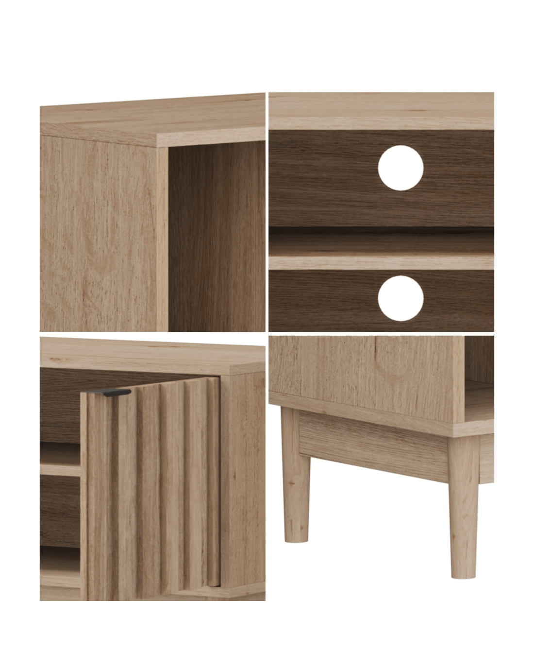Storage wise, the unit offers both closed and opened options. The former features a twin-door cabinet with a large two-tier storage space. The sculpted doors simply add to the character of the unit with a unique presence. Likewise, the open two-tier shelving is equally cavernous with built-in cable openings behind it for easy connection of your media devices as well as ensuring neat and tidy cable management. Not least, a vertical open slot at the far end is just perfect for taller items (perhaps some great vinyls for your turntable) to occupy.