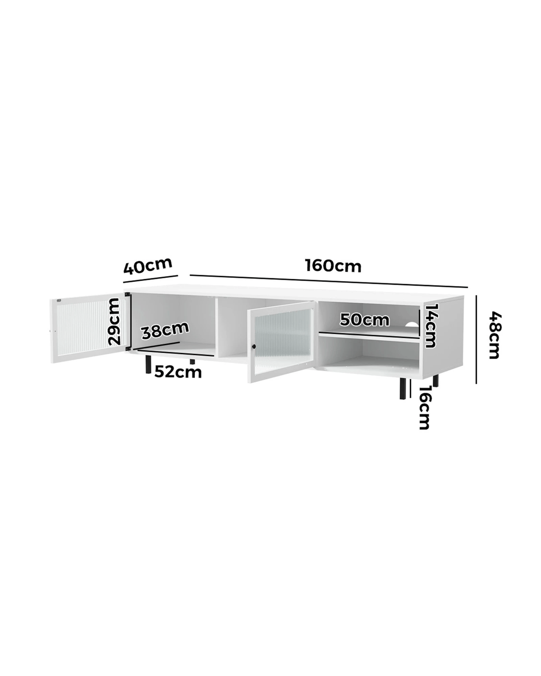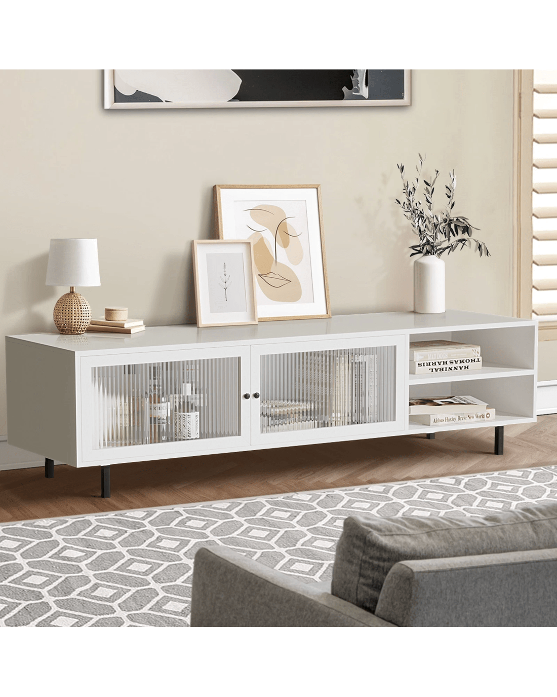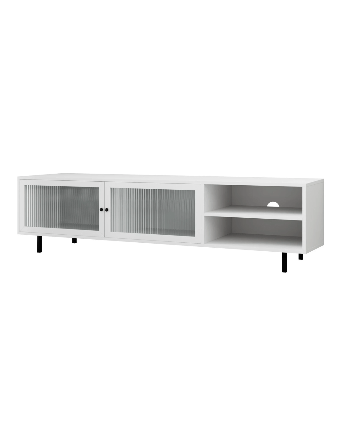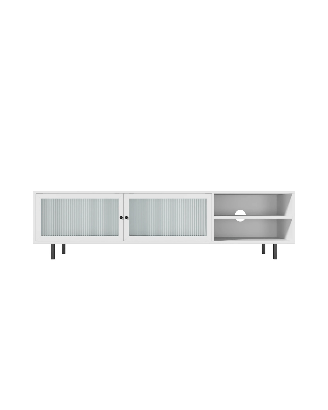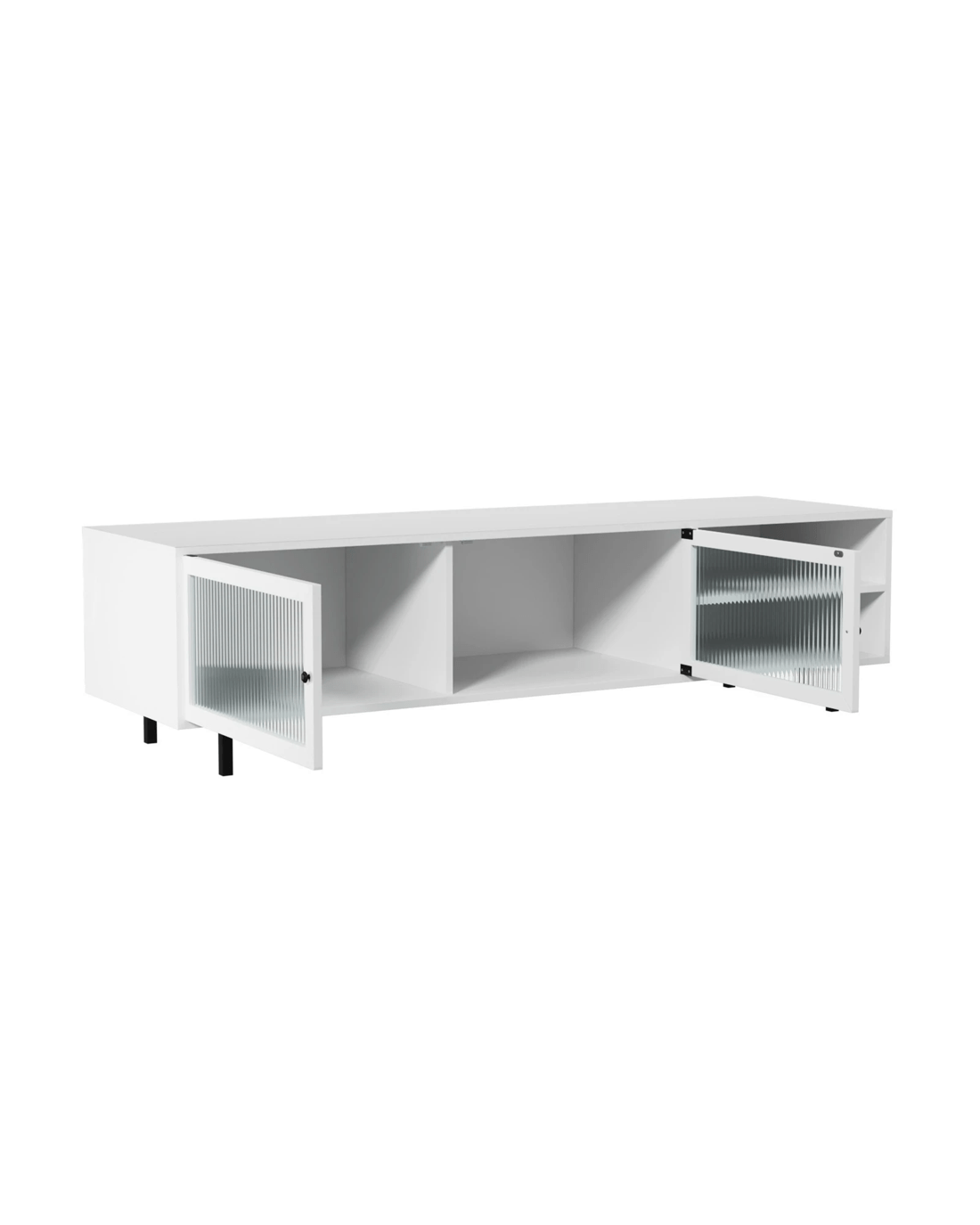 The closed interior spaces with large tempered-glass cabinet doors are cavernous with plenty of room for all your entertainment paraphernalia while the two open shelves add complementary storage with equally spacious offerings.