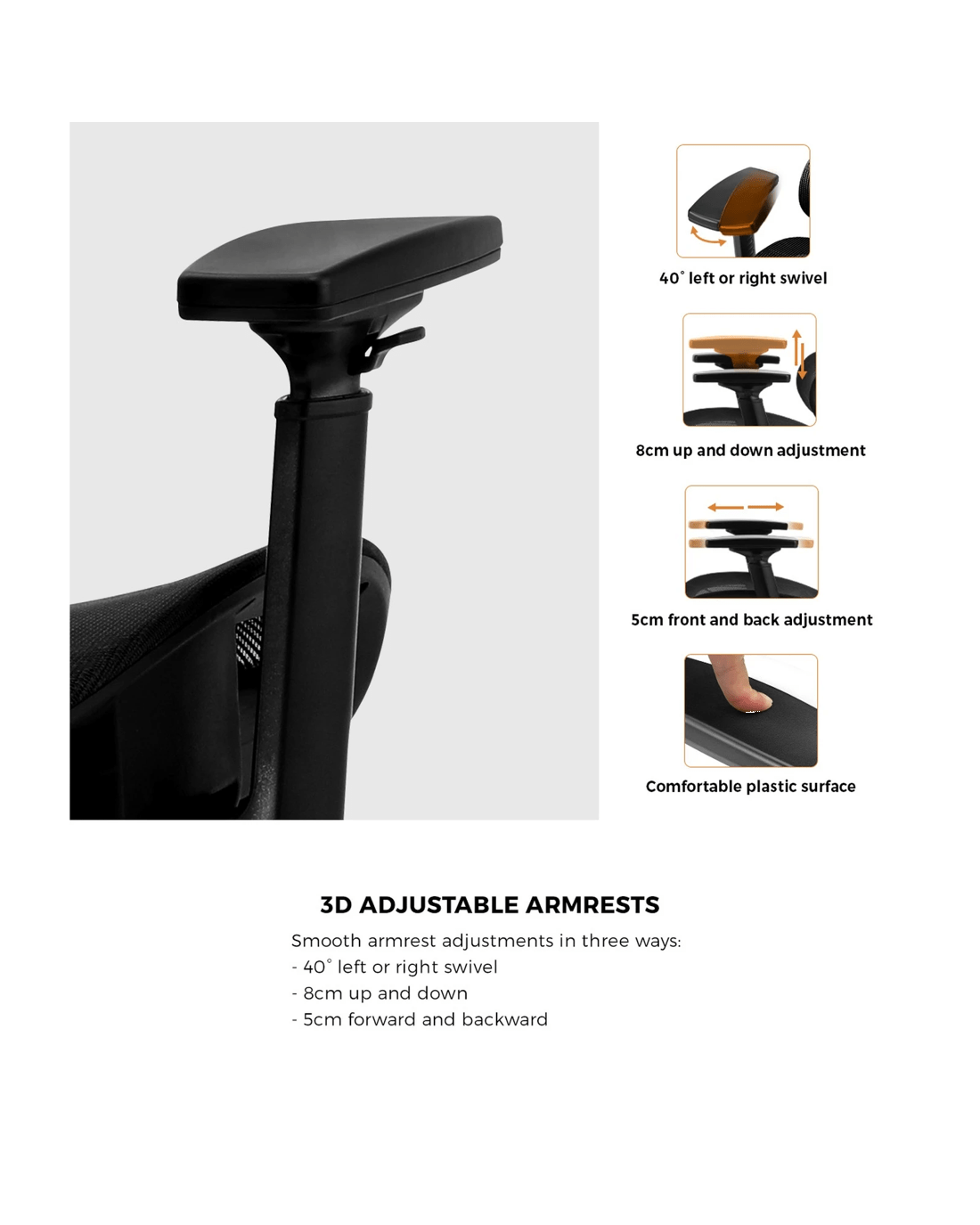 3D adjustable armrests with comfortable plastic surface