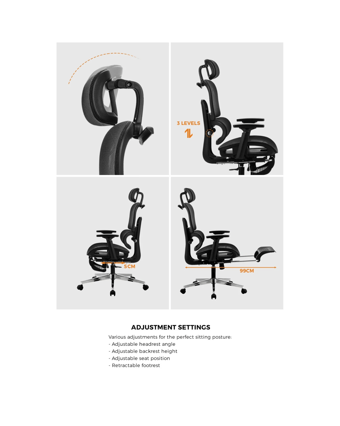 3-step height adjustable backrest