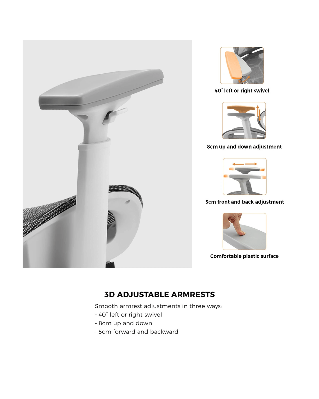 3D adjustable armrests with comfortable plastic surface
