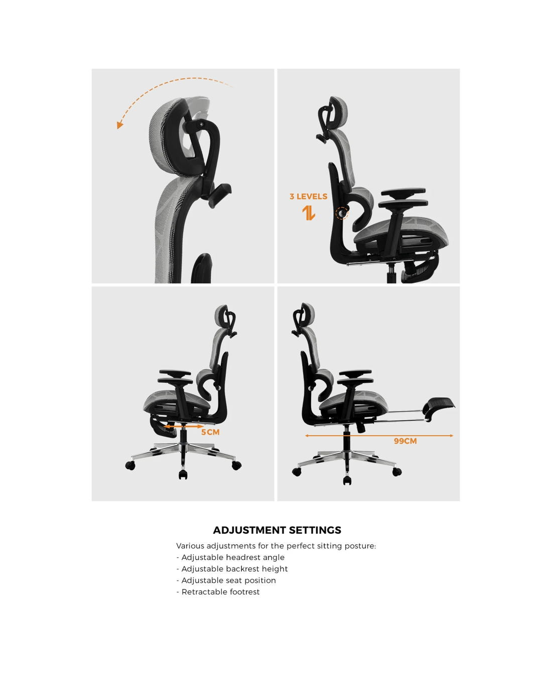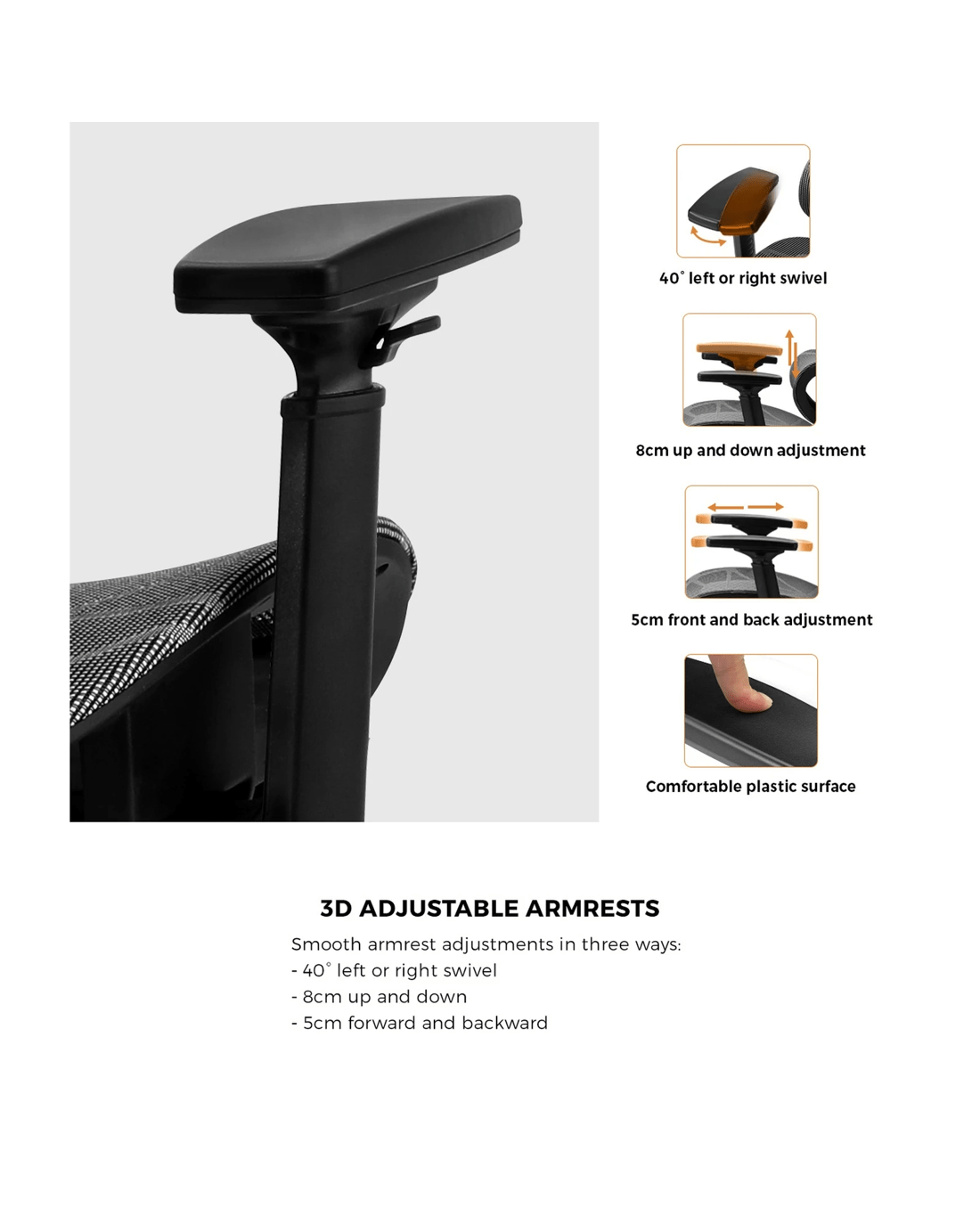 Feeling the need for more support? Just rig the backrest to any of the three pre-set positions or move the lumbar support to find the best spot for your spinal comfort. Adjust the 3D armrests for left or right swivel, up and down and forward and backward settings to suit. Meanwhile, line up your preferred longitudinal seat position with the dedicated pull handle. Plus, set the headrest angle for the most ergonomic fit for your neck and head and you'll good for the next few hours sitting behind your favourite desk.