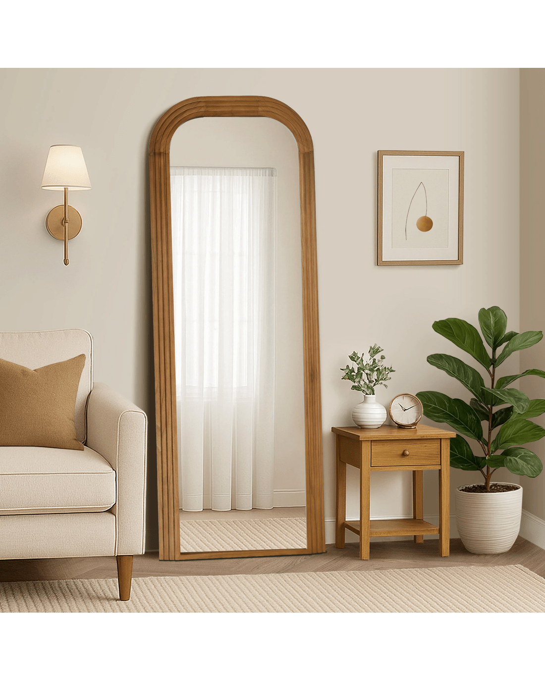 Crafted with meticulous workmanship, our full-length mirror, with its distinctive arched frame and deep borders, adds a touch of mesmerising aura to any bedroom and showcases your personal style in distinctive elegance. Its 3mm thick tempered glass also makes it safe for use around kids and pets.