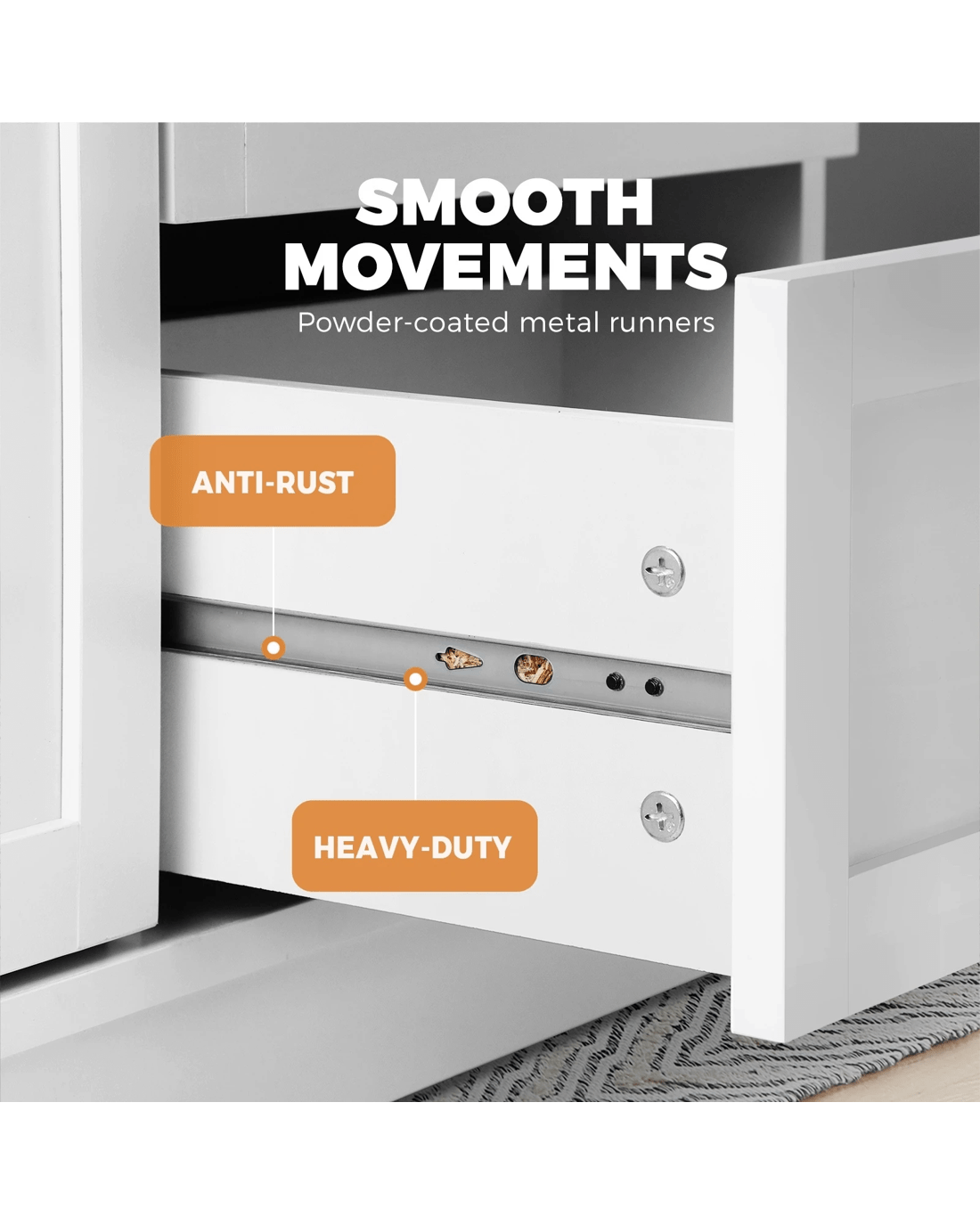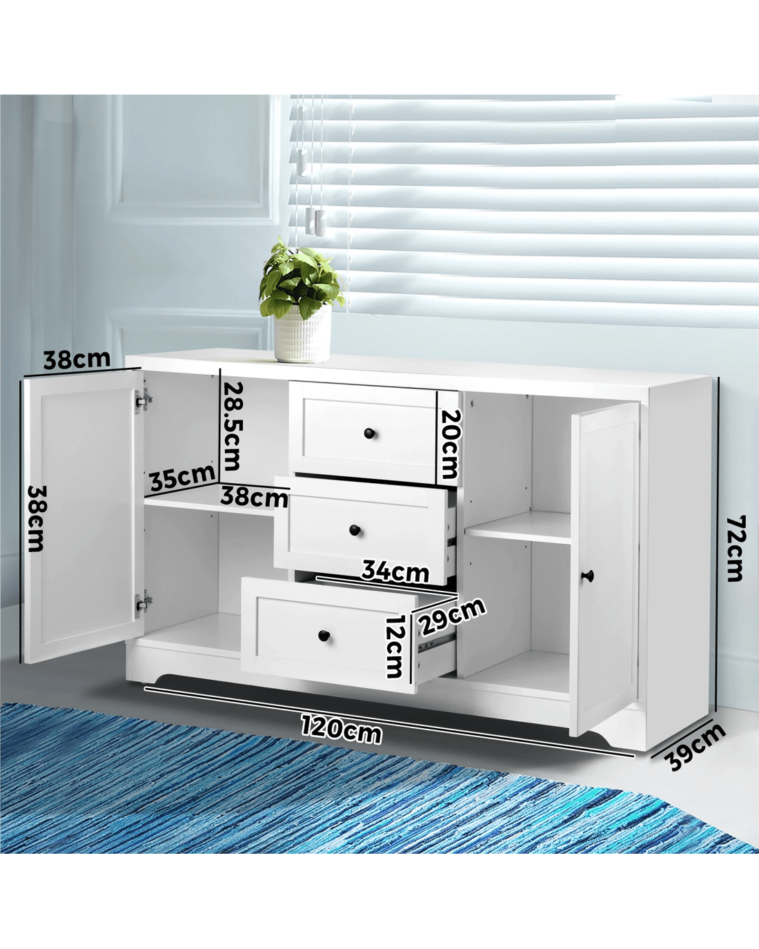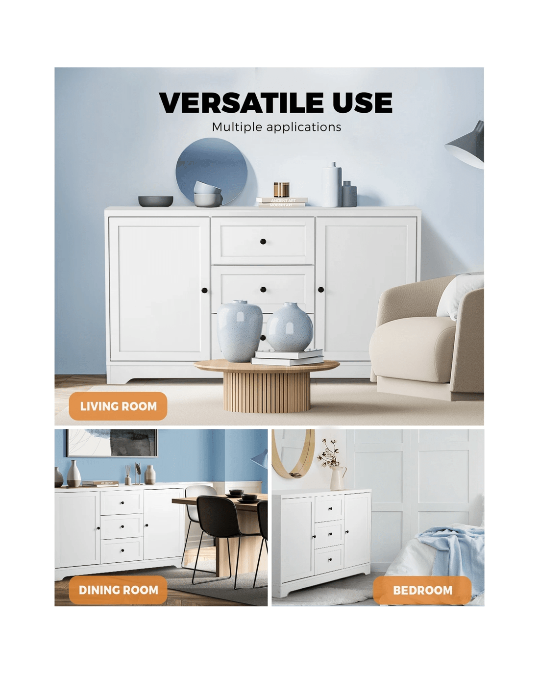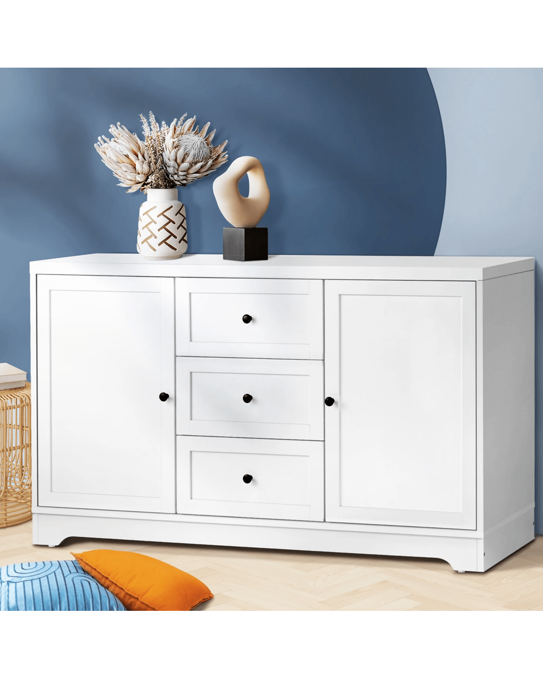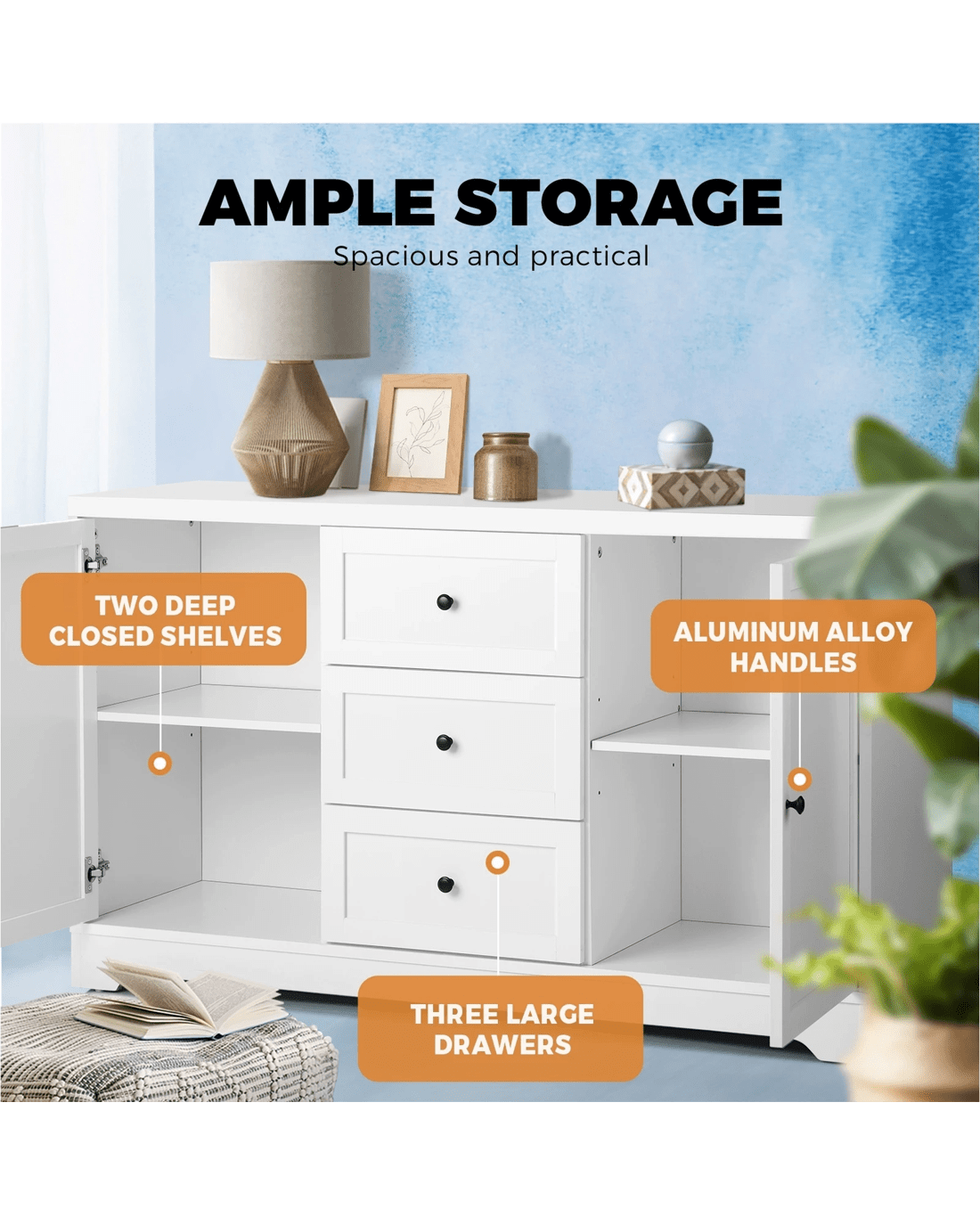 Inside, spacious storage spaces let you keep a myriad of items neat and organized. Crafted from durable particle board, the sideboard is built to last and embellished with aluminium alloy handles for long-lasting usage. Use it in the dining room, bedroom or any other room, our Oikiture Sideboard is always ready to add to your favourite collection of furniture.