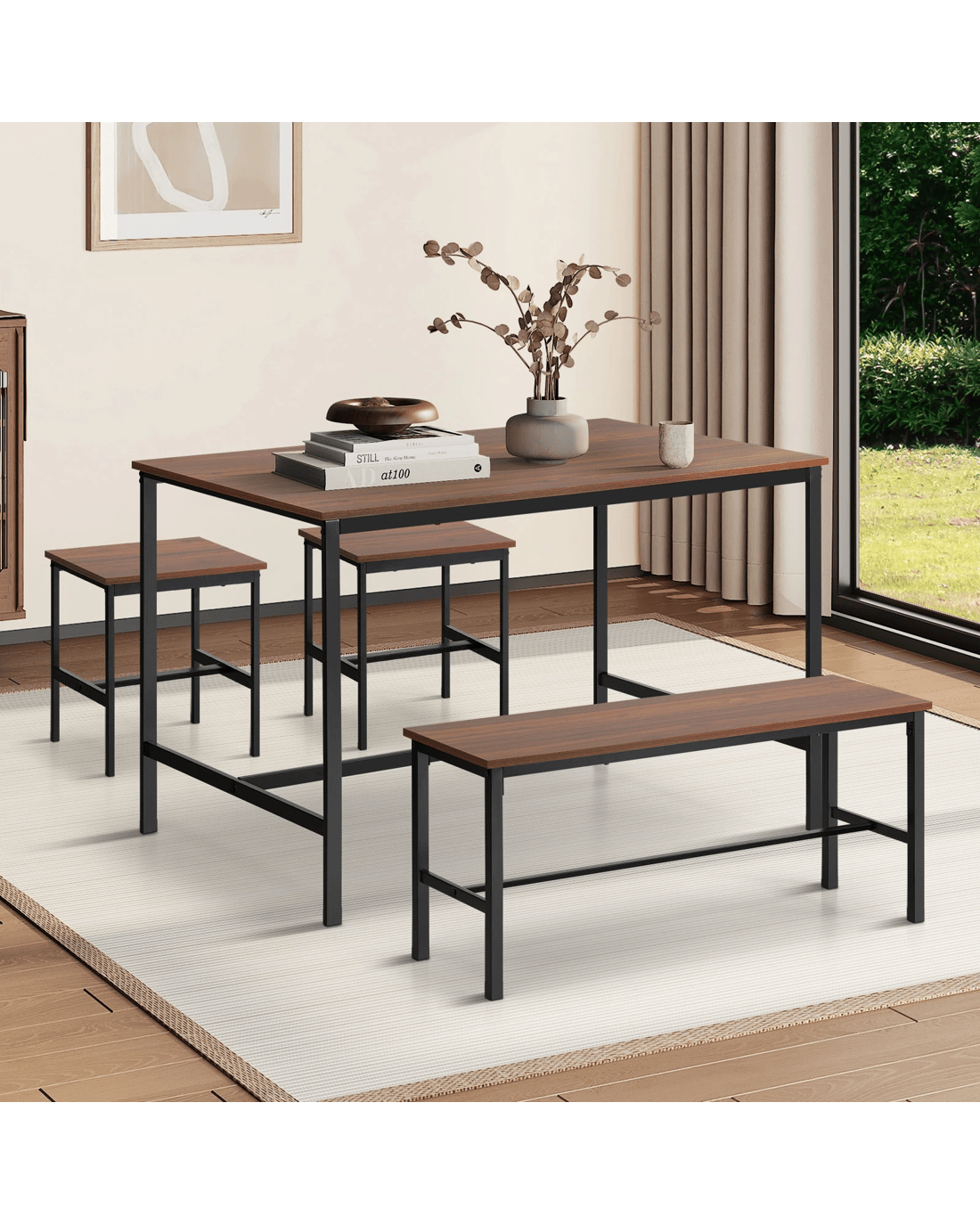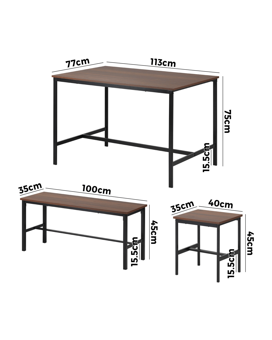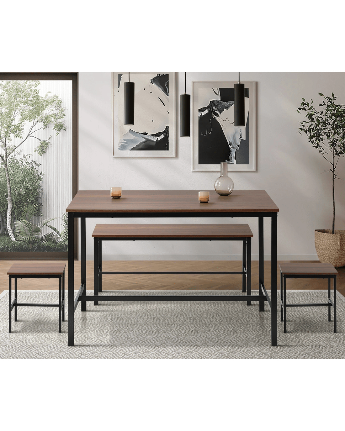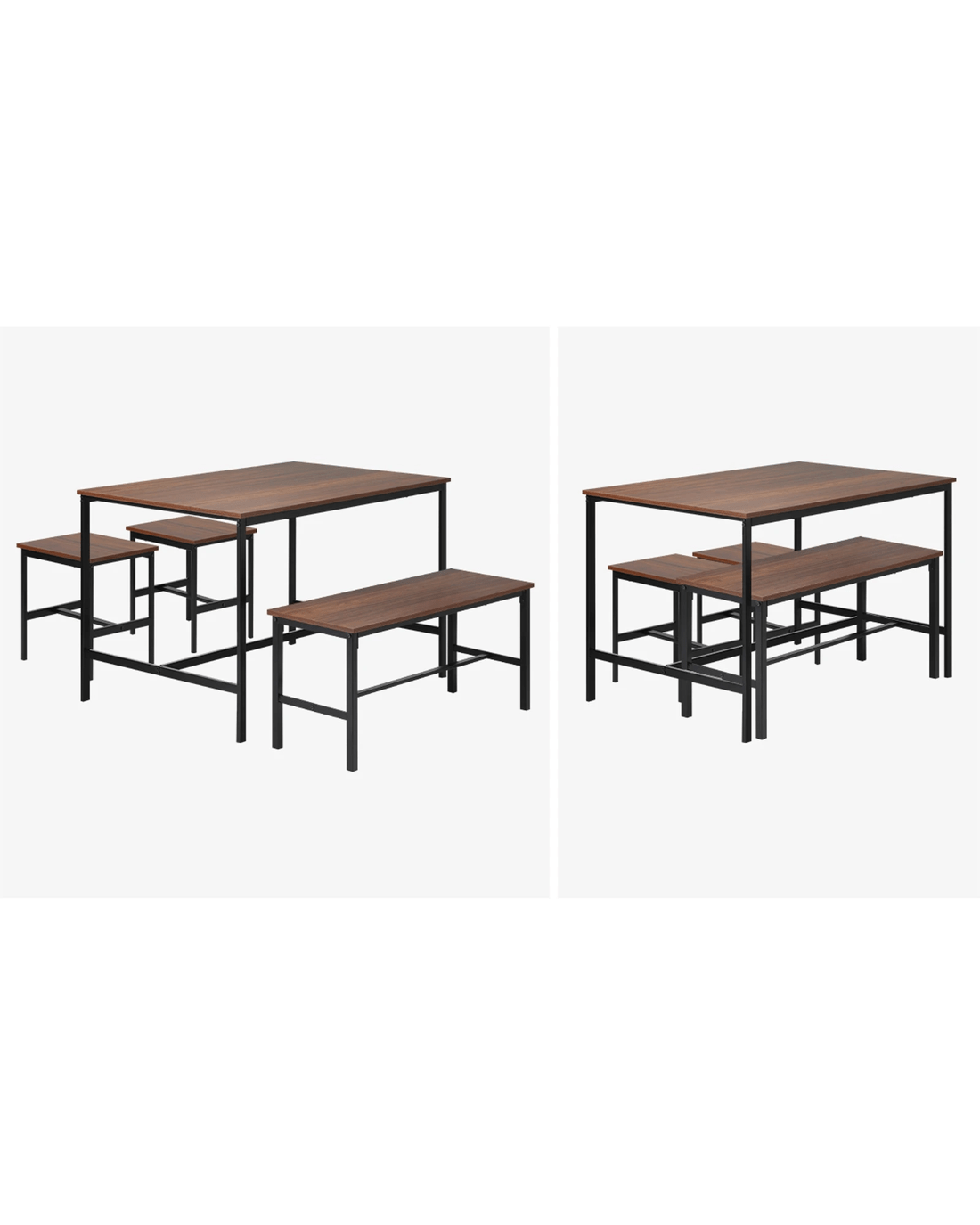 The spacious dining table is crafted with a woodgrain texture tabletop that simply looks and feels amazing. And when matched with the black powder-coated frame and legs, the design stands out with stylish imagery. Likewise, the similarly crafted single and two-seater benches make for a perfect combination of practical functionality and space efficiency.