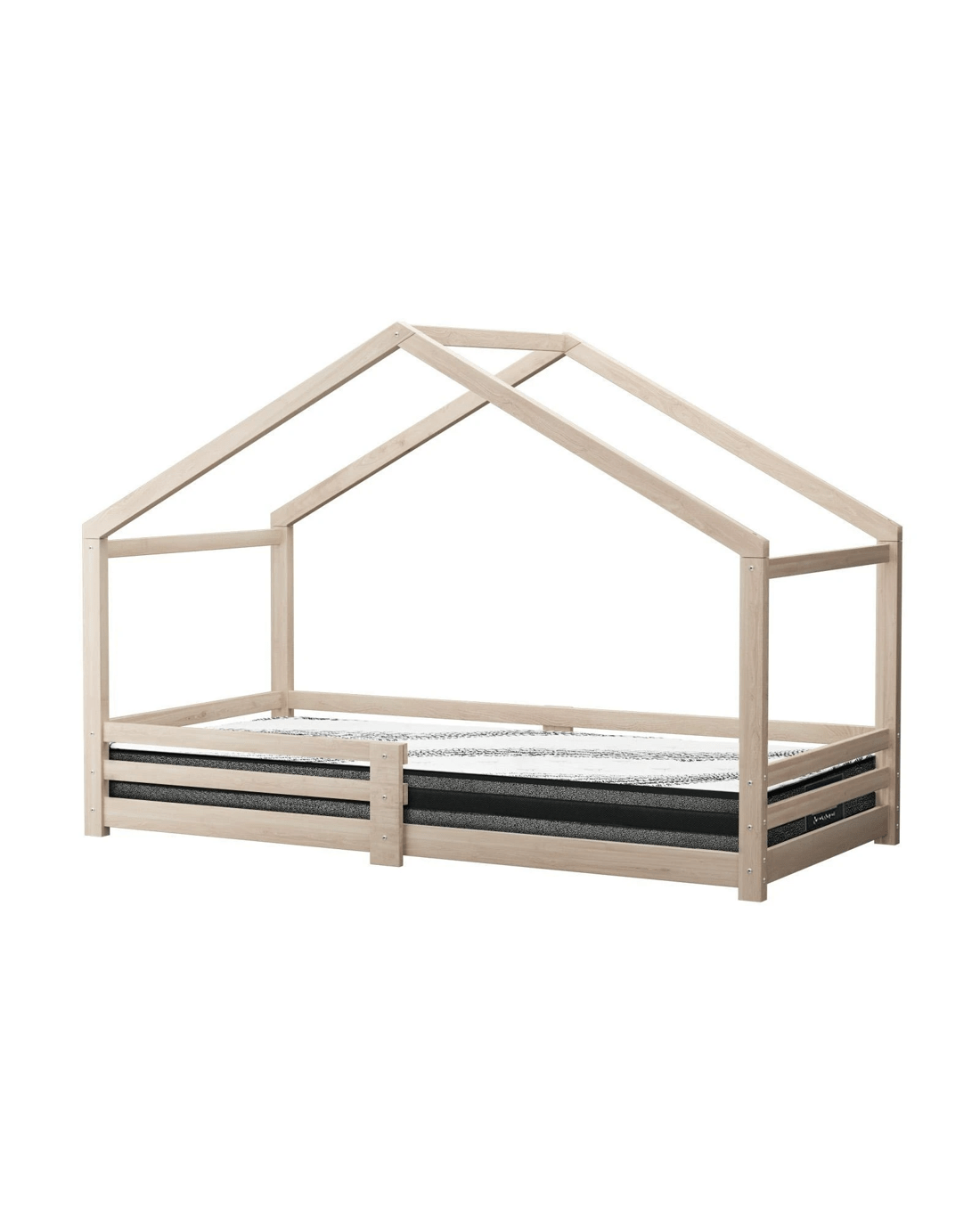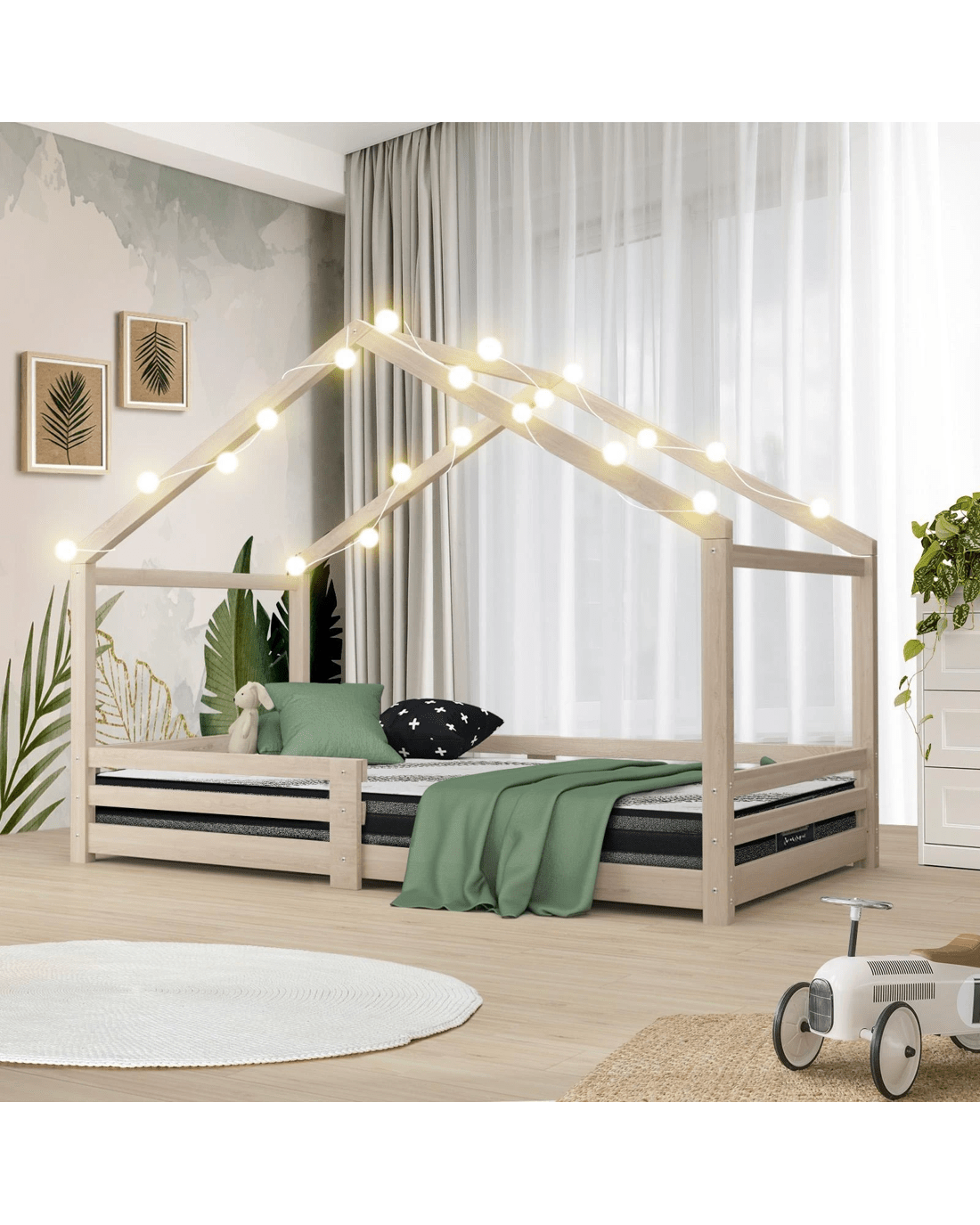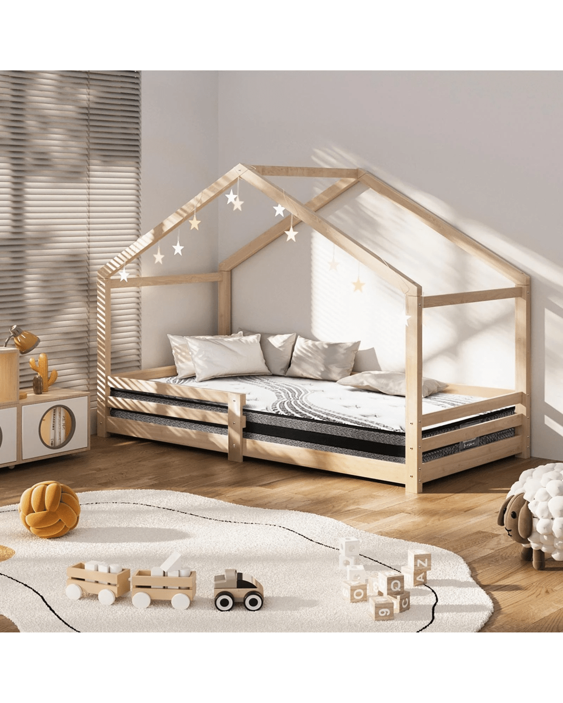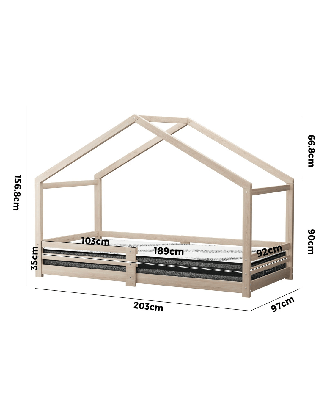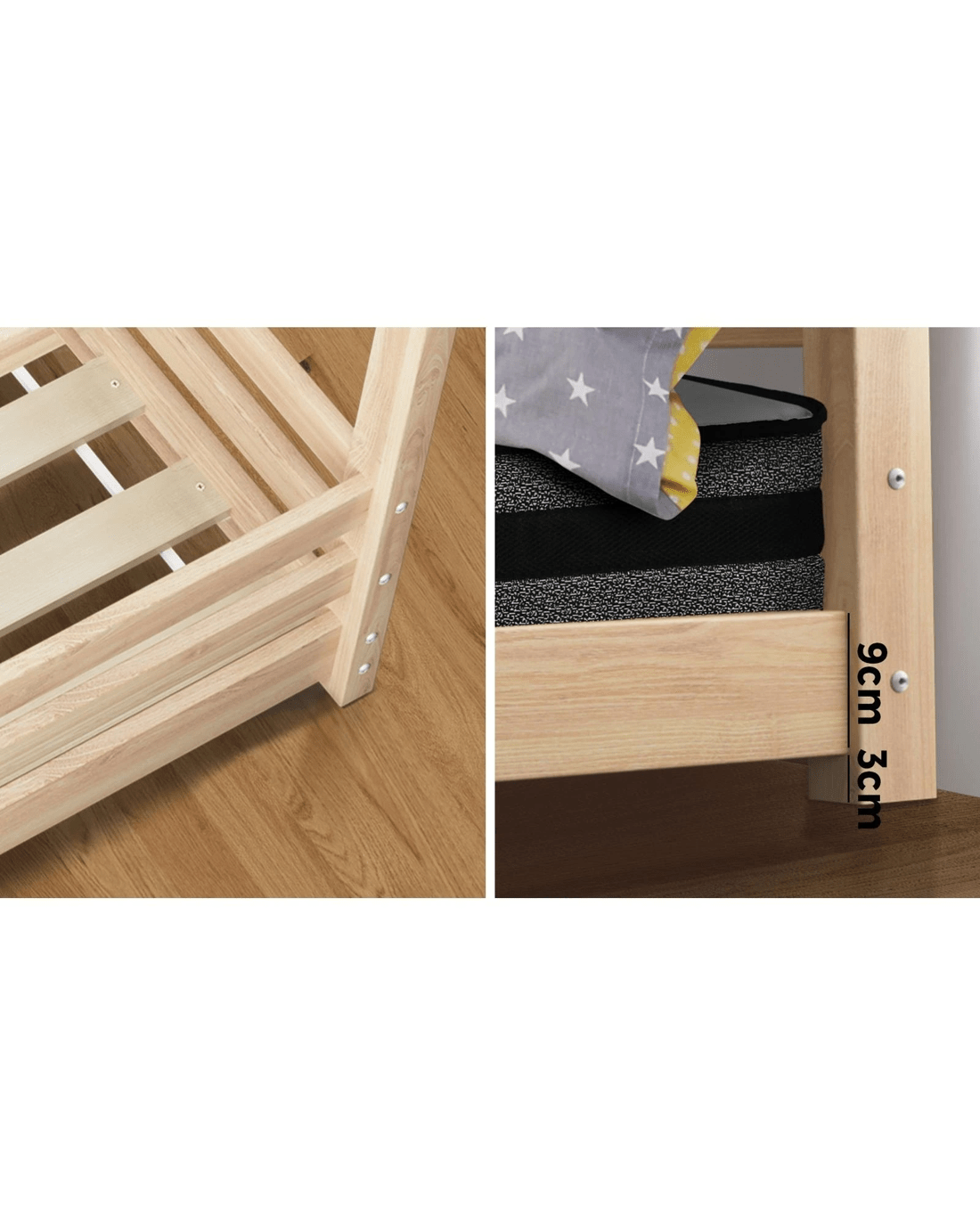 Oikiture Kids Bed Frame And Mattress Wooden Timber Toddler House Montessori Base - Natural