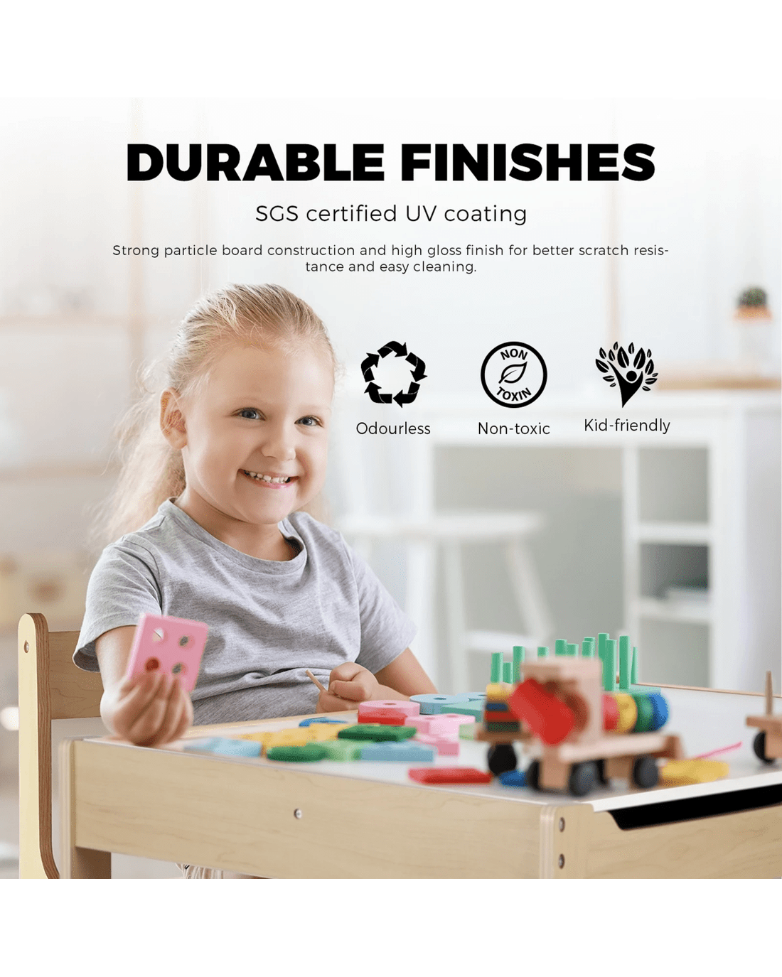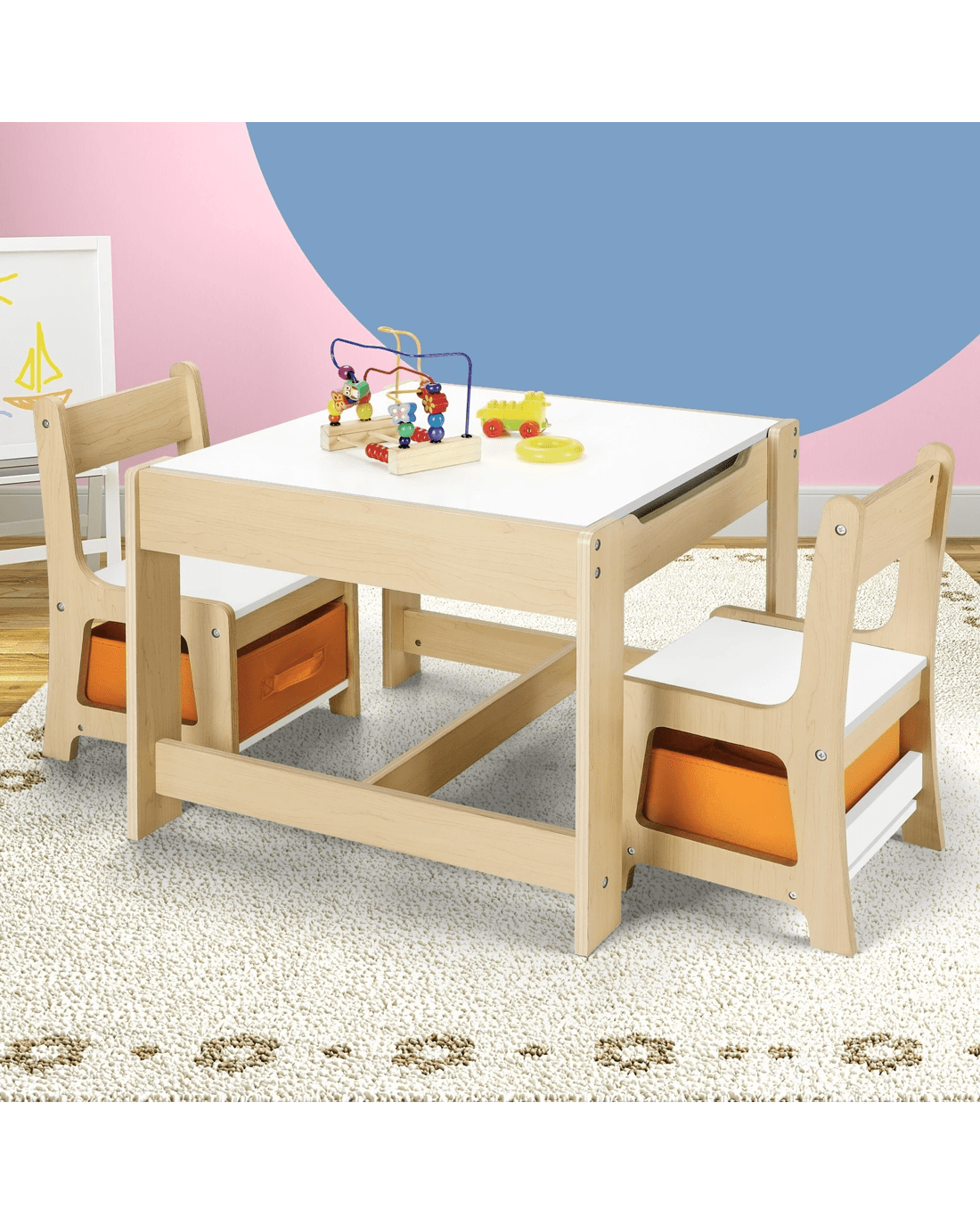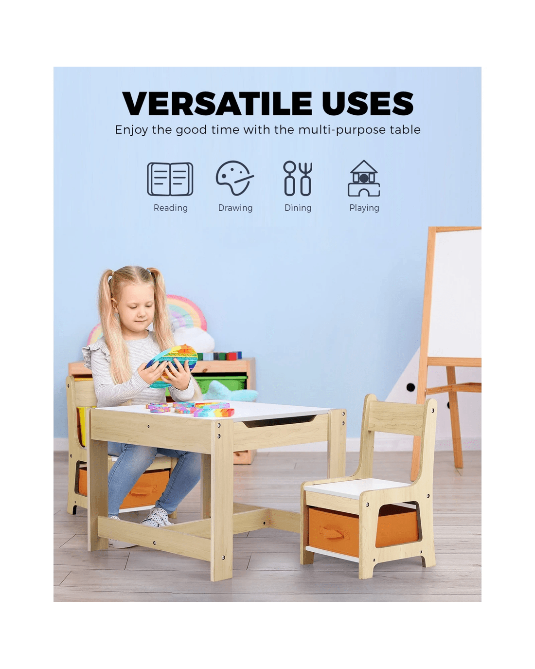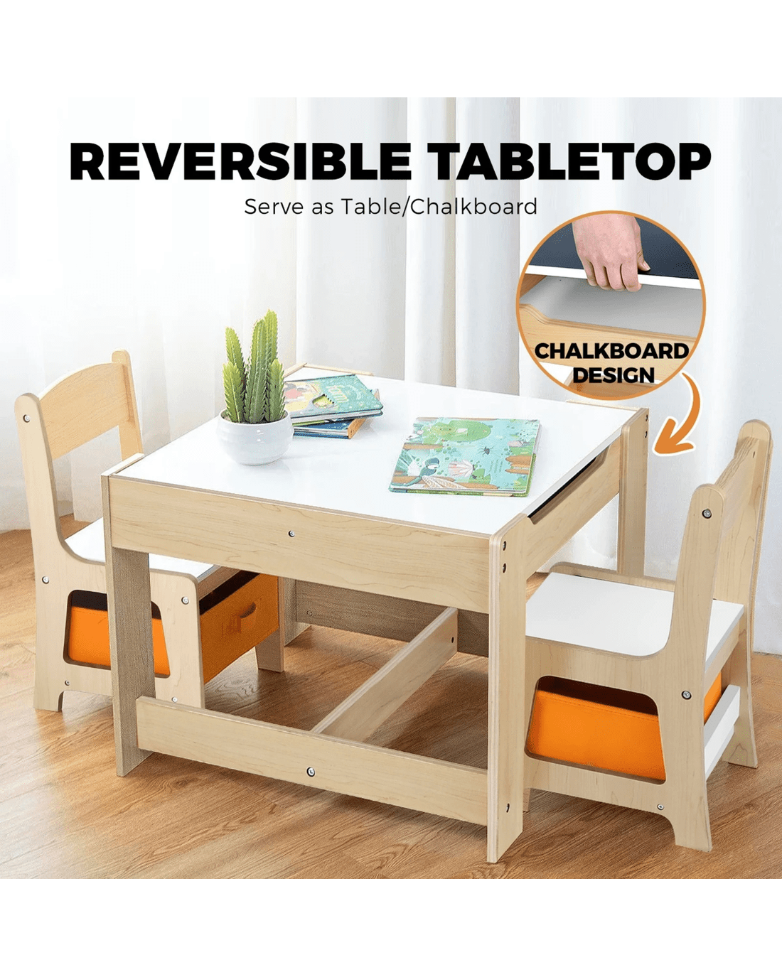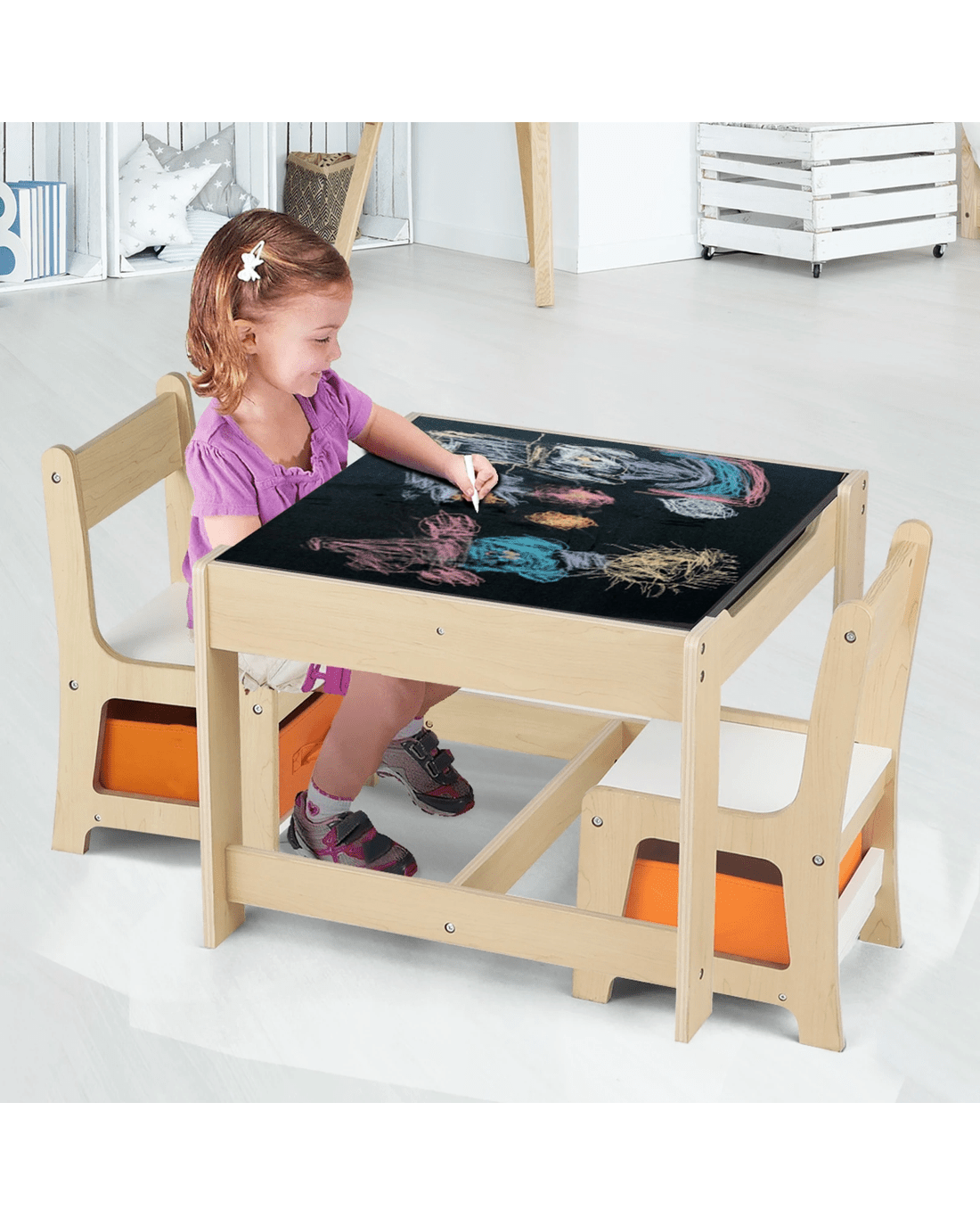 Oikiture 3-in-1 (Kids Table Chair Set) is a must-have for kids aged 3+. The thoughtfully-designed tabletop has two sides, one flat surface for dining and reading and the other chalkboard surface for drawing and playing. Beneath the easy-turn-over tabletop, there hide large storage compartments, ideal for kids to stow away their blocks, storybooks, chalk, crayons and other things. With sleek and stylish design, it's fit for living room, playroom, or kids' bedroom. This table and chair set is made from eco-friendly and non-toxic sturdy MDF board that offers solid support and long-lasting durability. It is also easy to assemble and clean. Oikiture, the perfect gift for your kids!