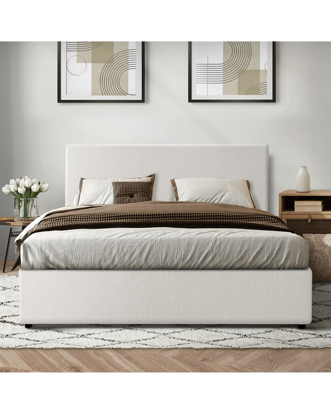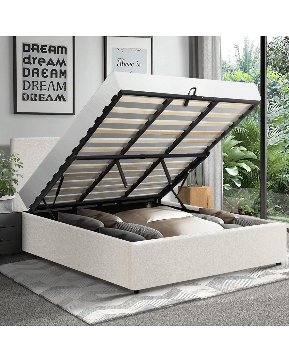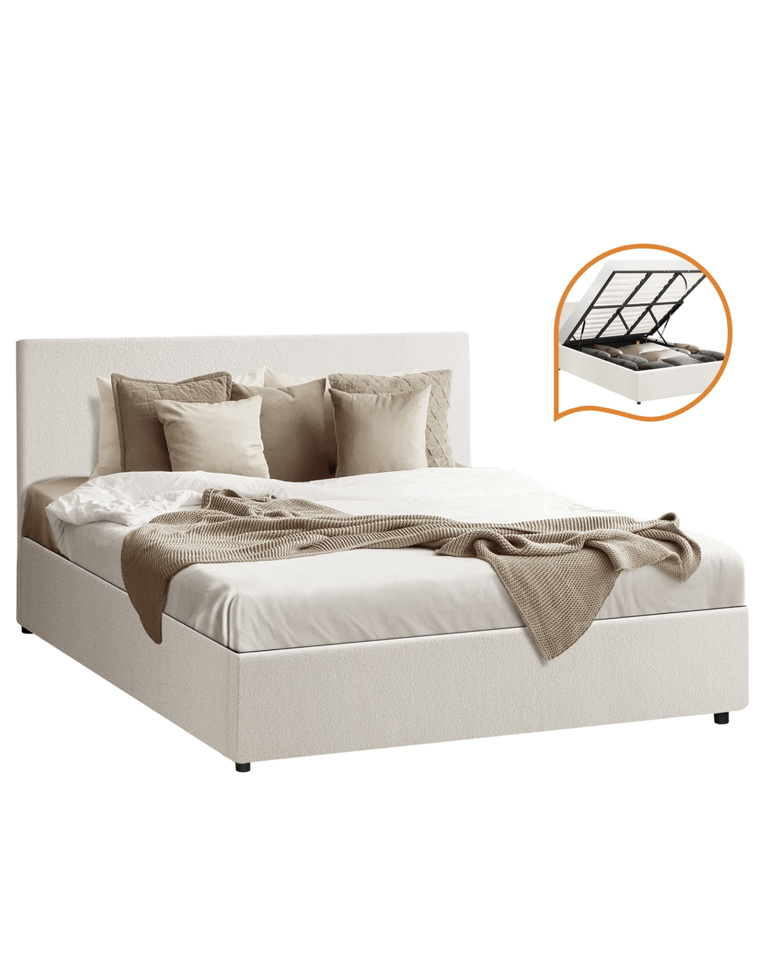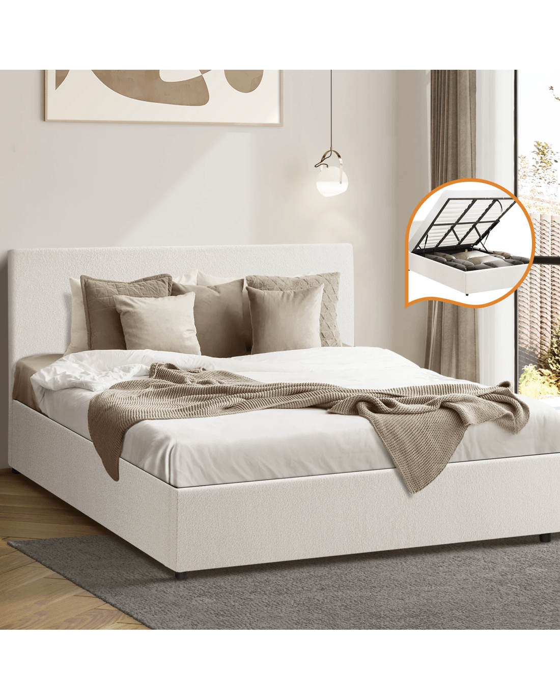 Get the ultimate space saver with Oikiture Gas Lift Bed Frame that is a contemporary and classic piece that give you room an instant lift of elegance and style. Upholstered with premium boucle fabric and great attention to details, it's going for the perfect designer look.