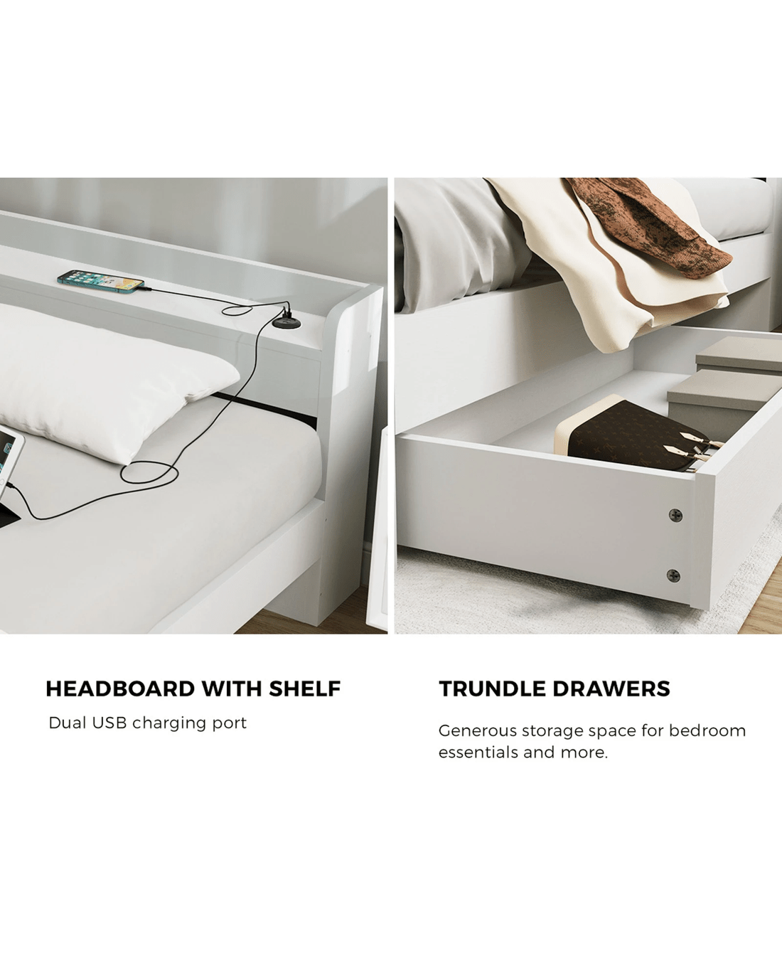 Time to liven things up in bed. And the Oikiture Trundle Bed Frame is just the perfect choice to spice up your sleepcapades. Its contemporary styling will certainly give your bed a good makeover to bring it in line with current trends. But what's really unique about this bed frame is the bed head shelf that makes it convenient for you to store personal items up close. And with 1 Type C & 1 USB charging port, you'll never have to leave your bed to charge up your favourite media devices with extended use. Plus, with two large trundle drawers fitted with castor wheels, the bed frame enables generous storage space for all your bedroom and other household essentials. A major plus especially where bedroom real estate is at a premium and any added functionality to the bed is always welcomed.