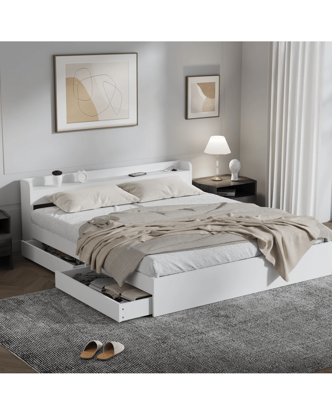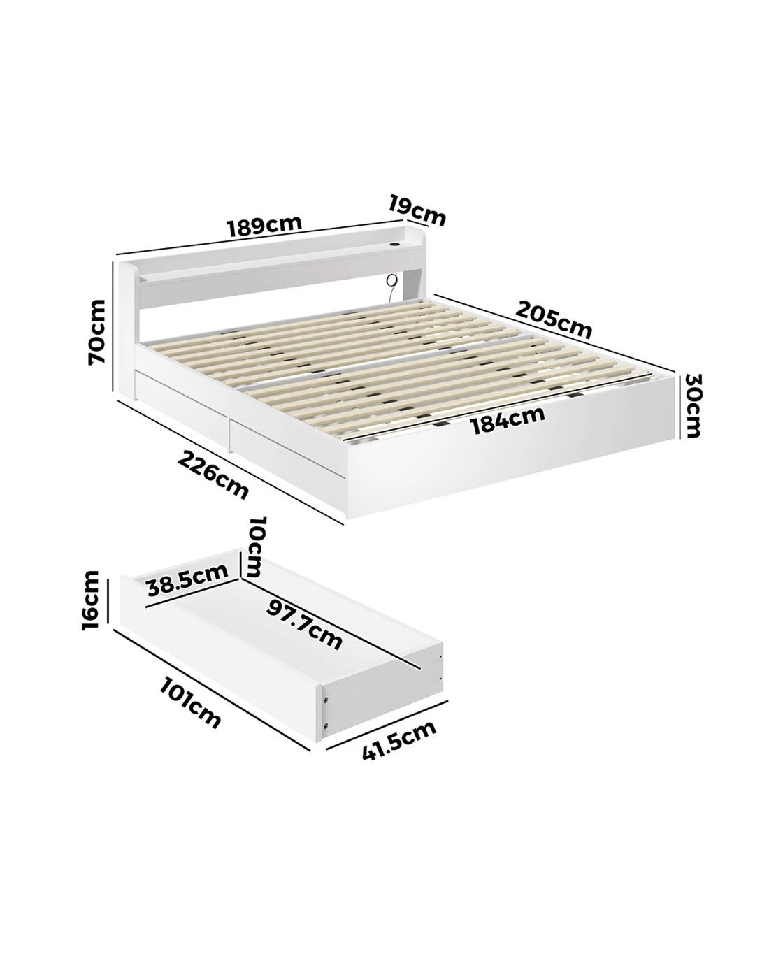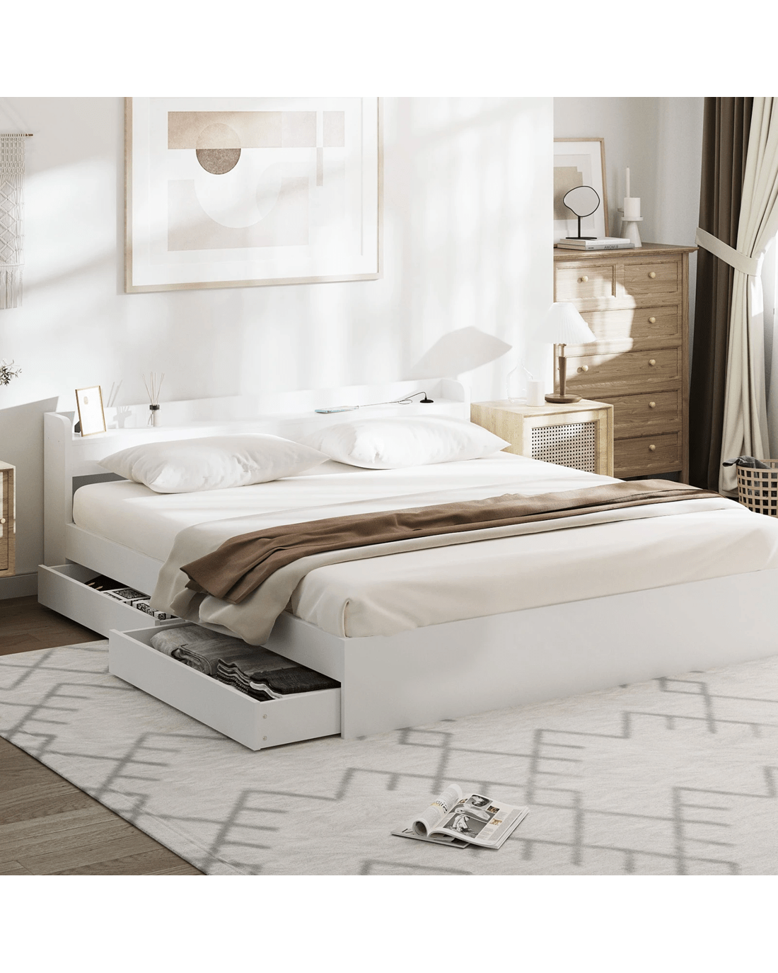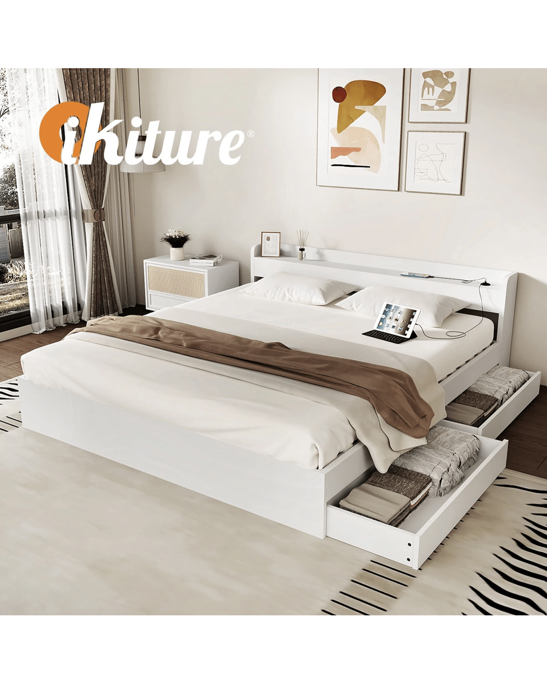 Sold by Kamprad's Oikos 1943Oikiture King Bed With Charging Ports & 2 Drawers Timber Bed Frame - White