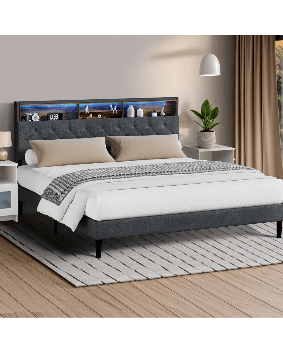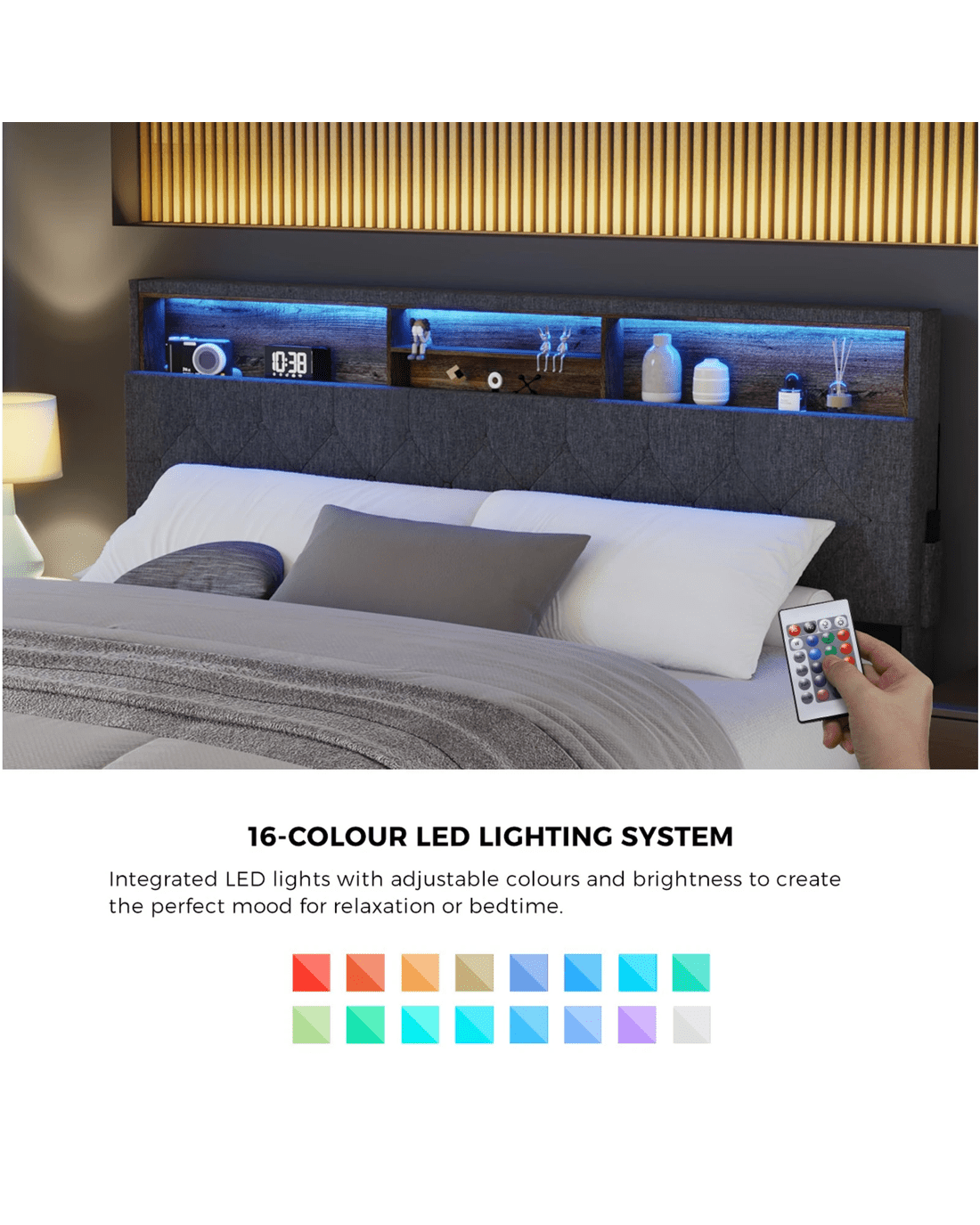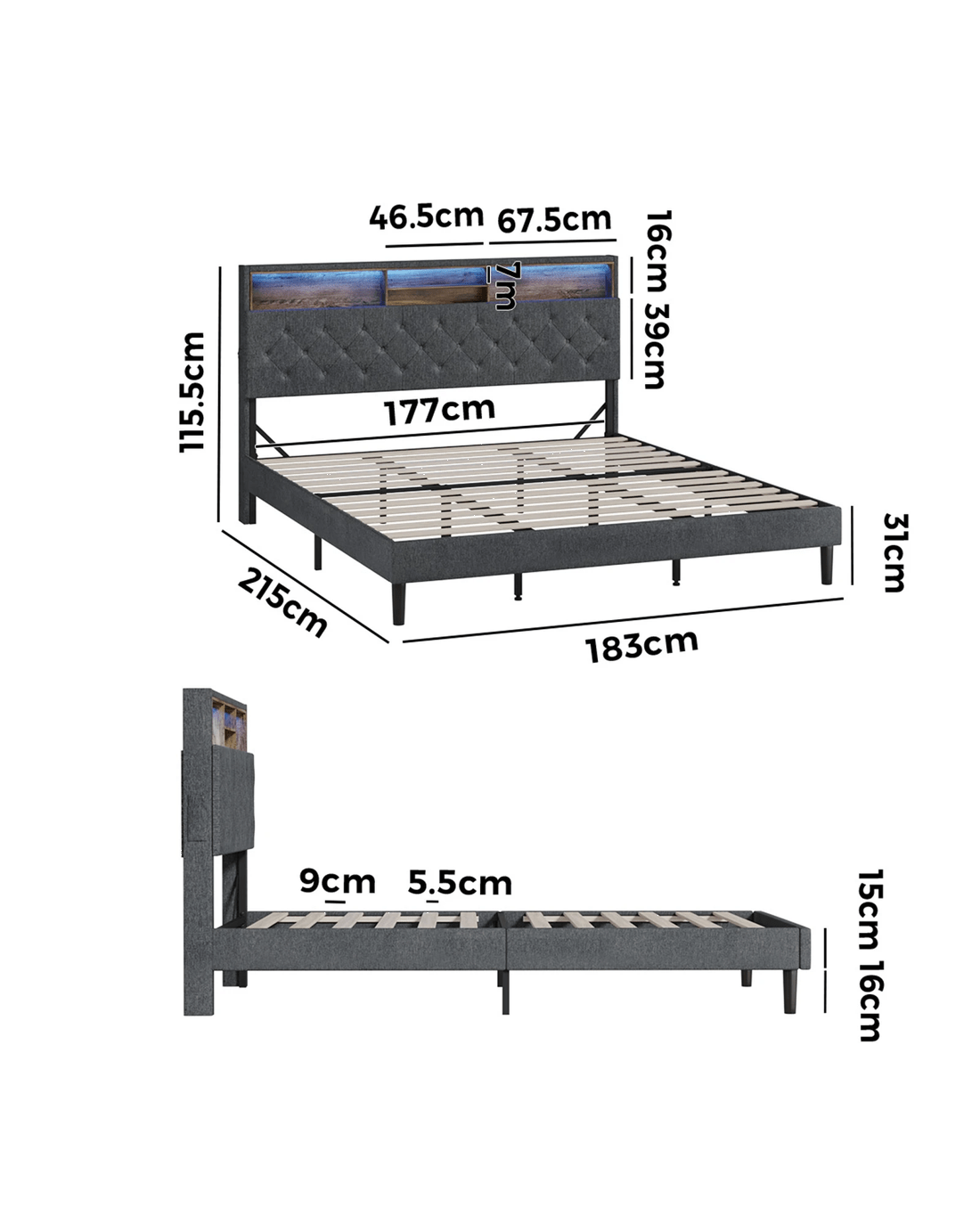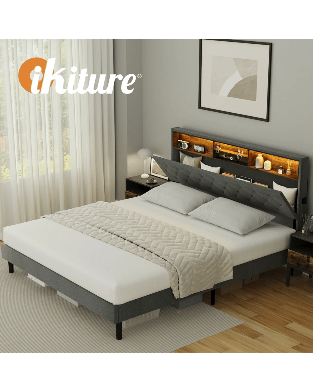 Sold by Kamprad's Oikos 1943Oikiture King Bed With Led Storage Bedhead Bed Frame - Grey