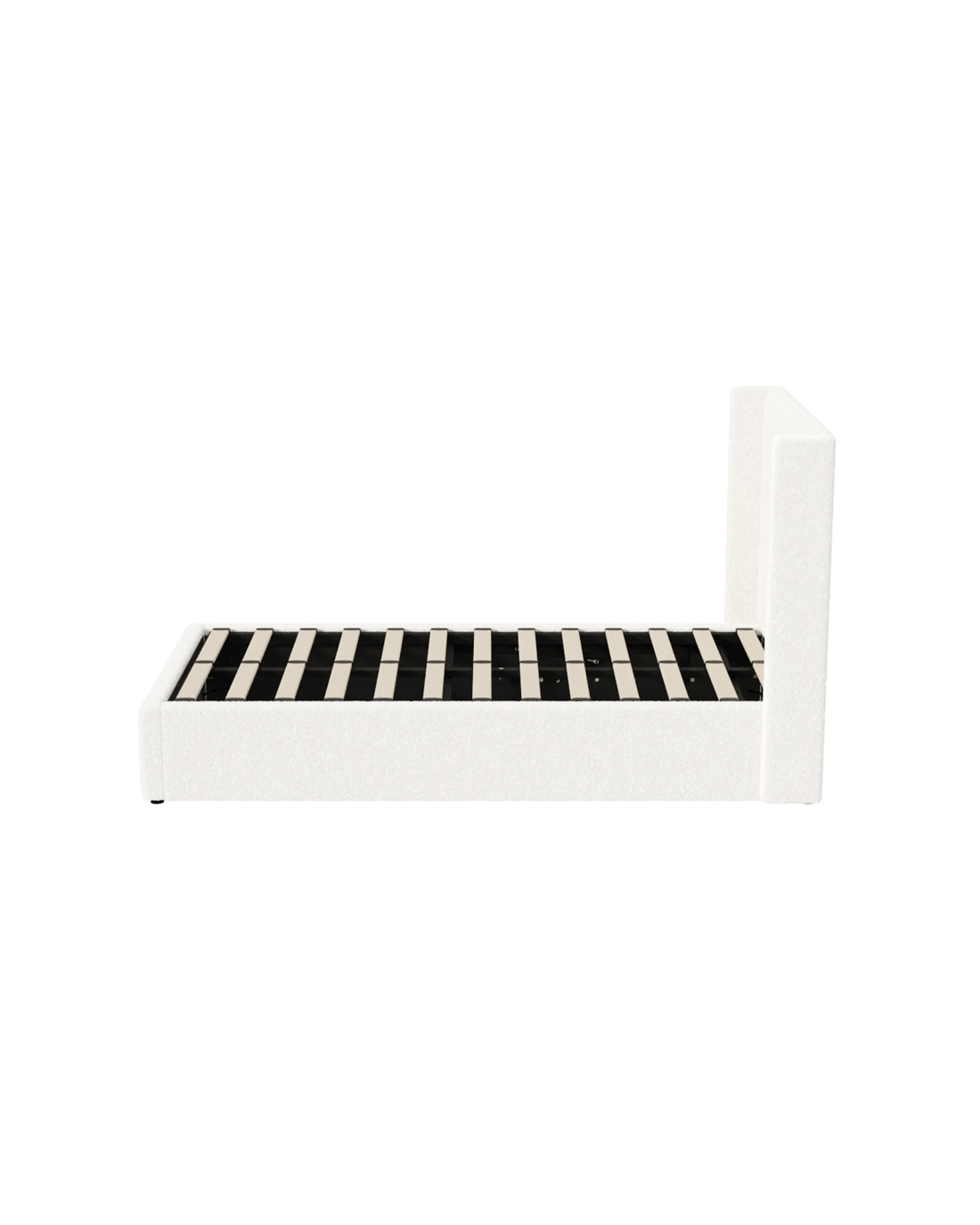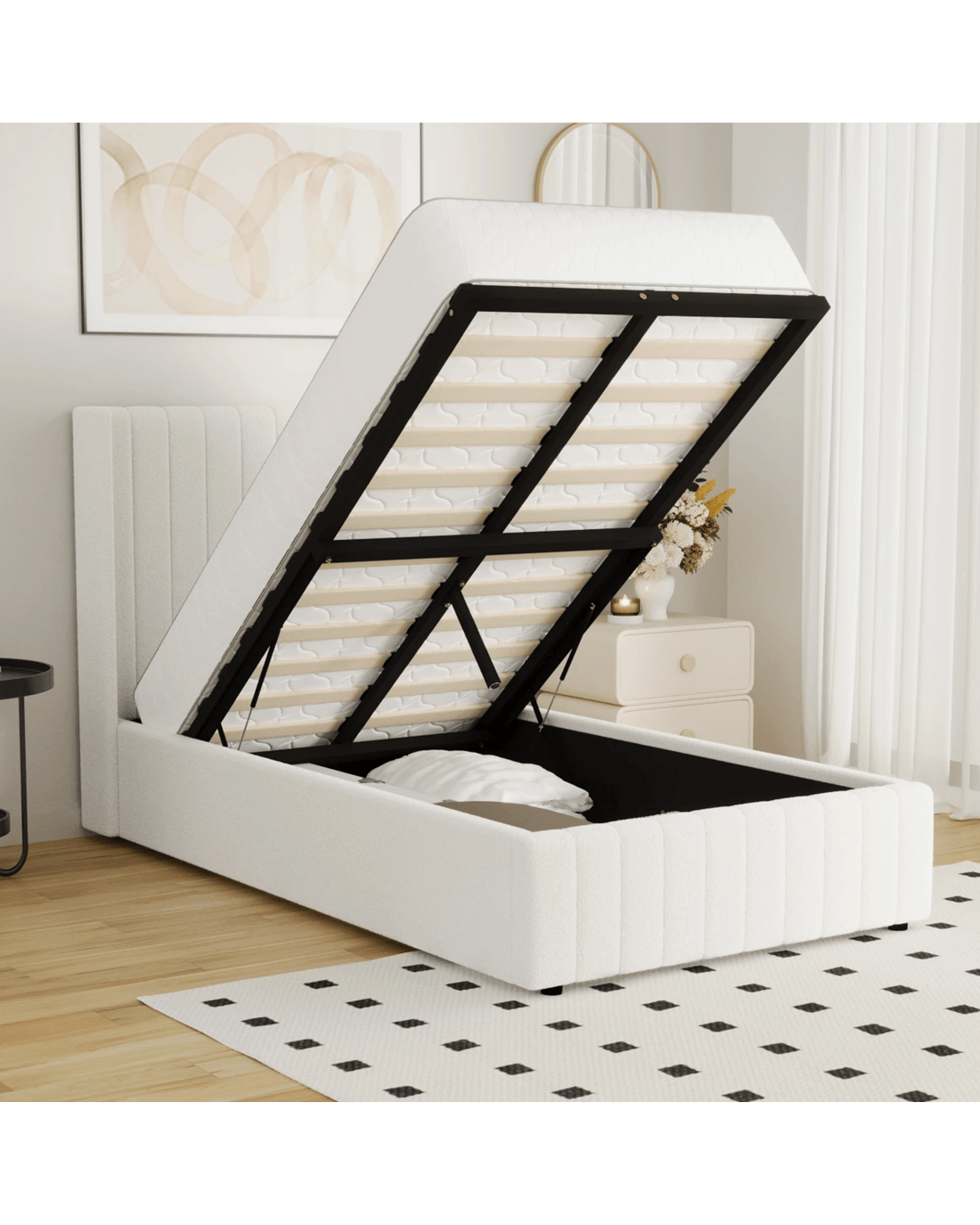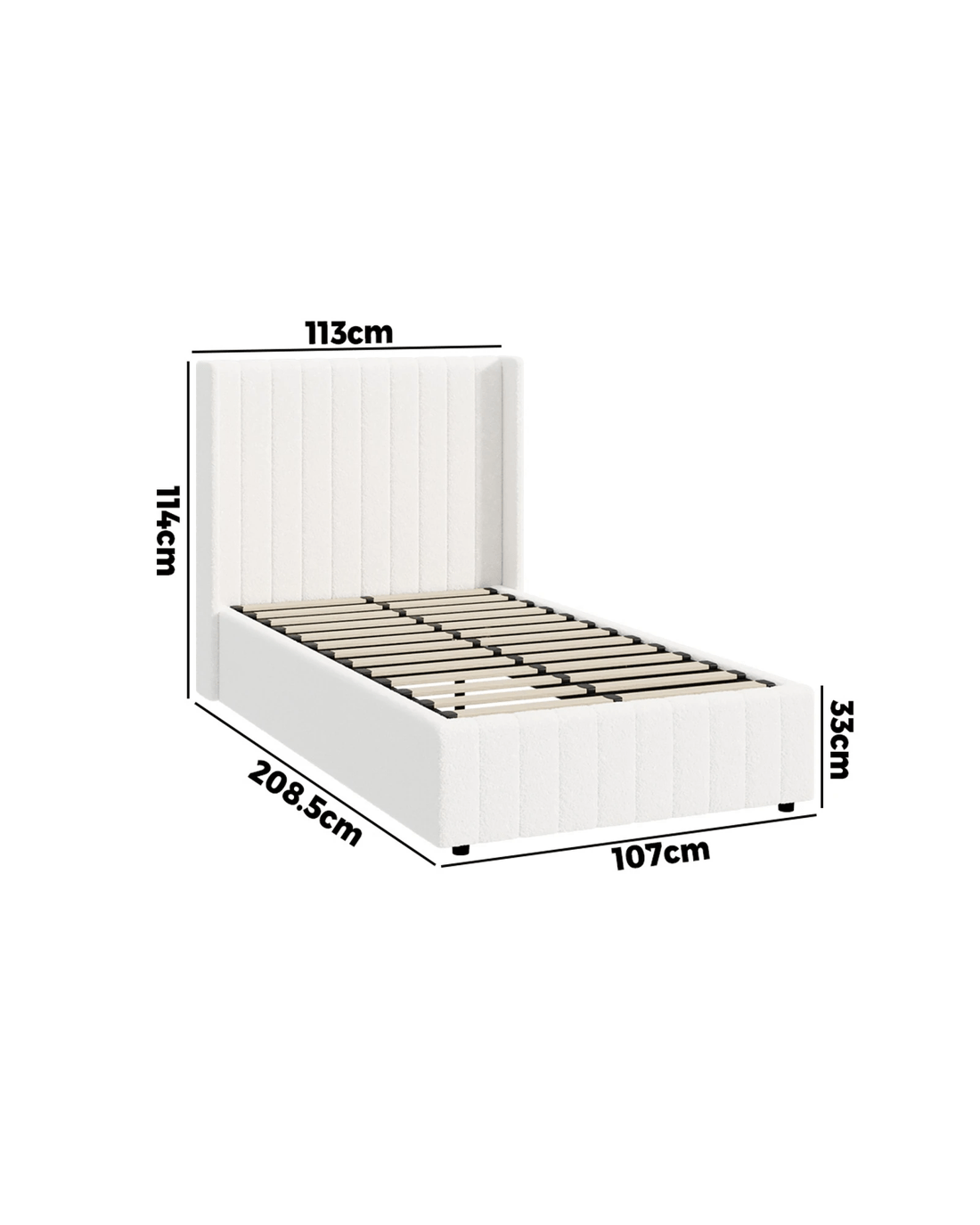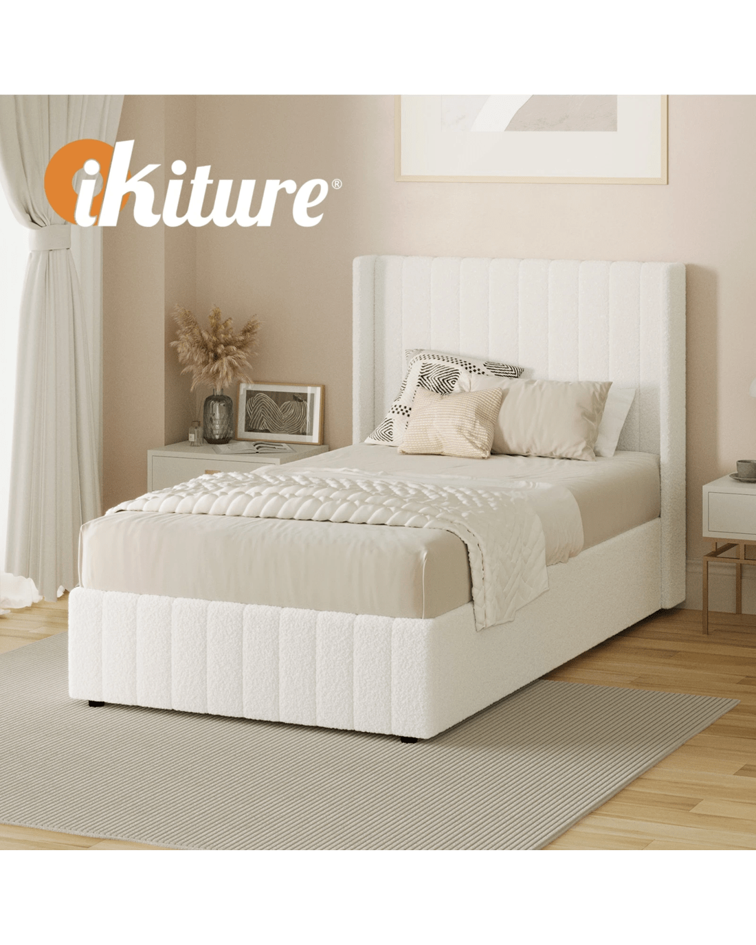 Sold by Kamprad's Oikos 1943Oikiture King Single Bed Frame Gas Lift Base With Storage Boucle Fabric - White