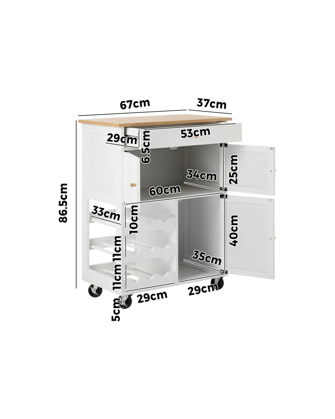 Constructed with sturdy particle board and quality components, the kitchen trolley maintains a good sense of structure and durability. The attention to detail is meticulous, evidenced by the wooden door handles, smooth edges all round, and fine workmanship from top to bottom. Not least, maintaining the kitchen trolley in its pristine condition is just a simple wipe away.
