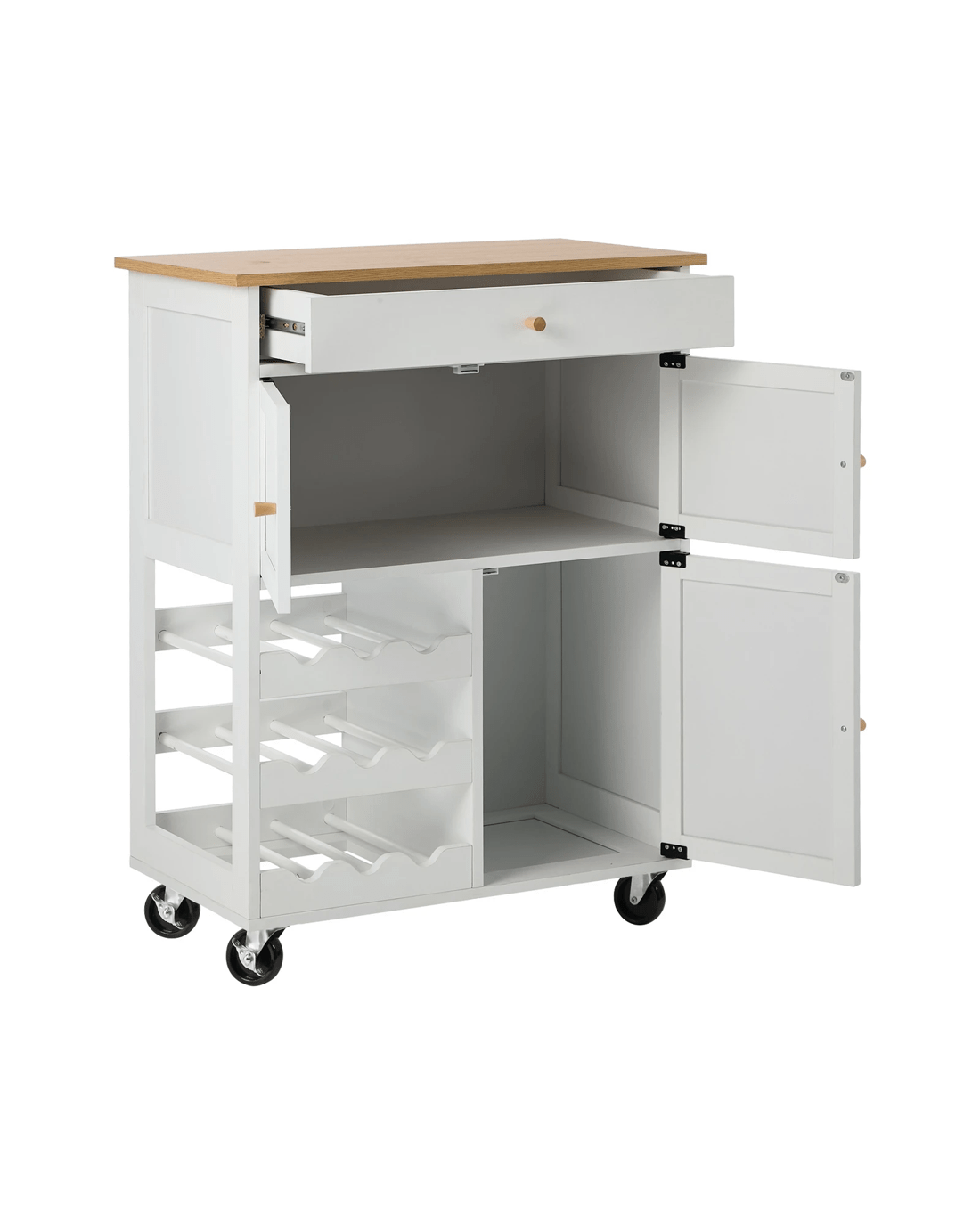 Comprising plenty of closed storage space from the cabinets and drawer, and a handy 3-tier wine rack, the multi-equipped kitchen trolley is the perfect solution to store all your kitchen and dining essentials and of course, your favourite vino too. A large tabletop also allows for fuss-free meal preparation or service. And with four free-spinning caster wheels of which two are lockable, moving the kitchen trolley is never a chore with a safe and stable stationery stance.