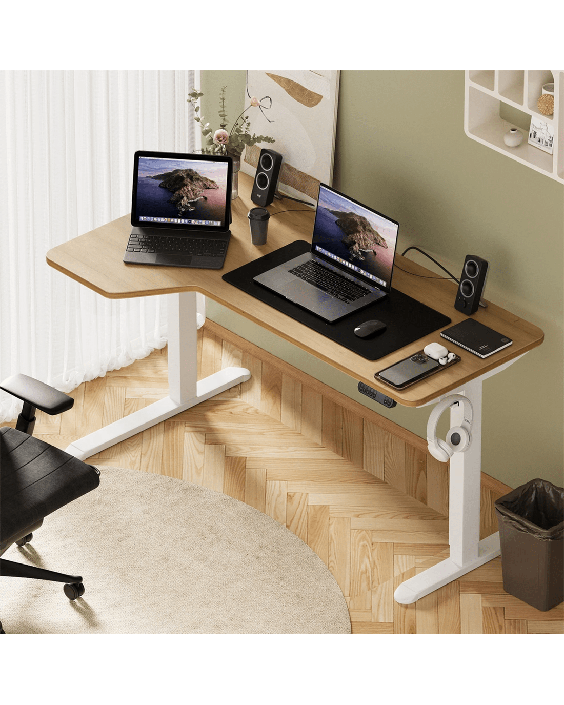 The spacious 1.45m length L-shaped oak-coloured desktop is designed to match the white frame perfectly with all installation holes pre-drilled and factory-aligned for an easy fit. Plus, the 18mm thick desktop is made of non-toxic particle board and given an anti-scratch matt finish that feels absolutely smooth and easy to clean and maintain. The rounded corners ensure no nasty bumps and safe working conditions all around.