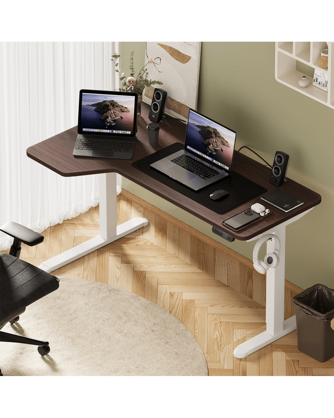 Our sit-stand desk frame features an all-metal construction and a smooth and powerful lifting system that works with incredible stability. No worries about equipment or stationery falling off your desk for sure. The 4-button control panel is easy to use with hassle-free switching between sitting and standing at your fingertips. Standard handy add-ons include a headphones hook and cable management holders to streamline all cable connections for a neat and tidy integrated look.