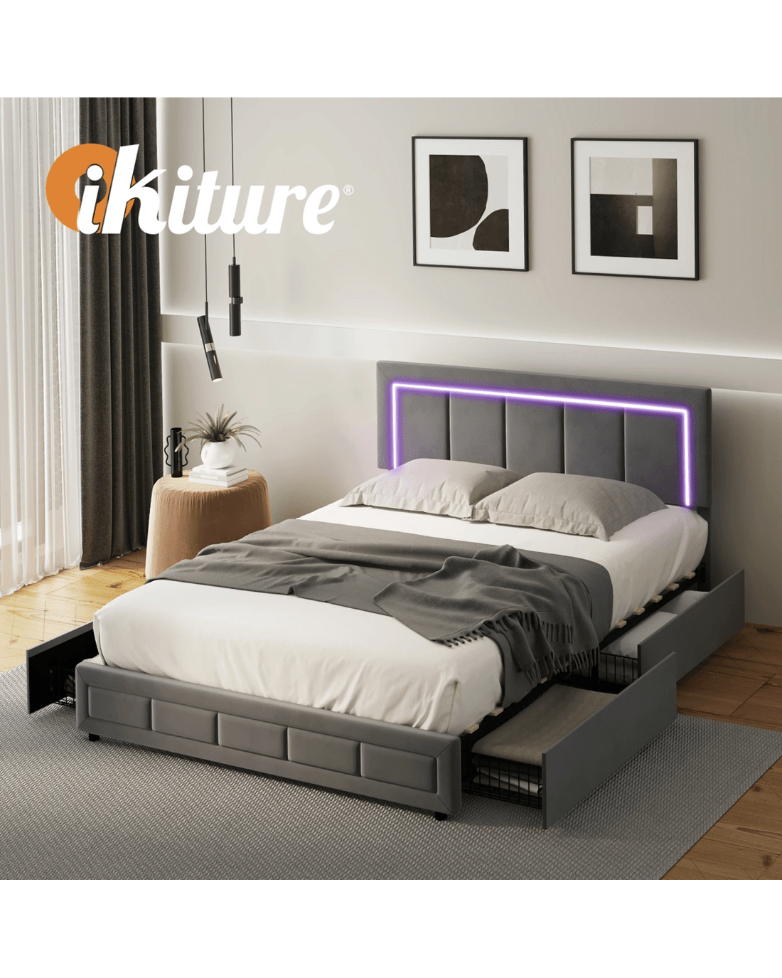 Sold by Kamprad's Oikos 1943Oikiture LED Double Bed Frame With 4 Storage Drawers & Charging Station - Grey