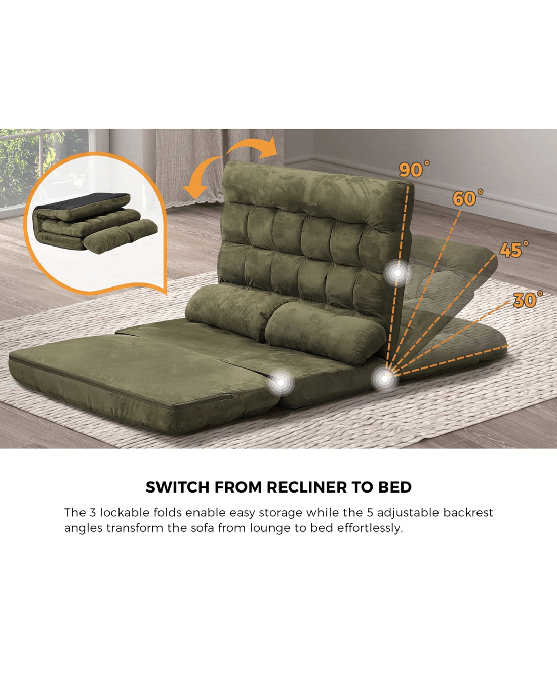 Equipped with three adjustable positions for the backrest, you can turn your lounge sofa bed into the best seat in the house for watching TV, reading, or keeping up with your social media, or nestle it down for relaxation, napping or sleeping. Likewise, when guests and relatives do drop by for an overnight visit, the lounge sofa bed is ready to accommodate them comfortably with a folding mechanism that works ever so effortlessly to transform from lounge sofa to bed in no time at all. Better still, the 3-fold enabled floor lounge sofa bed can be easily folded away for convenient storage. Very useful indeed when space is premium real estate in your home.