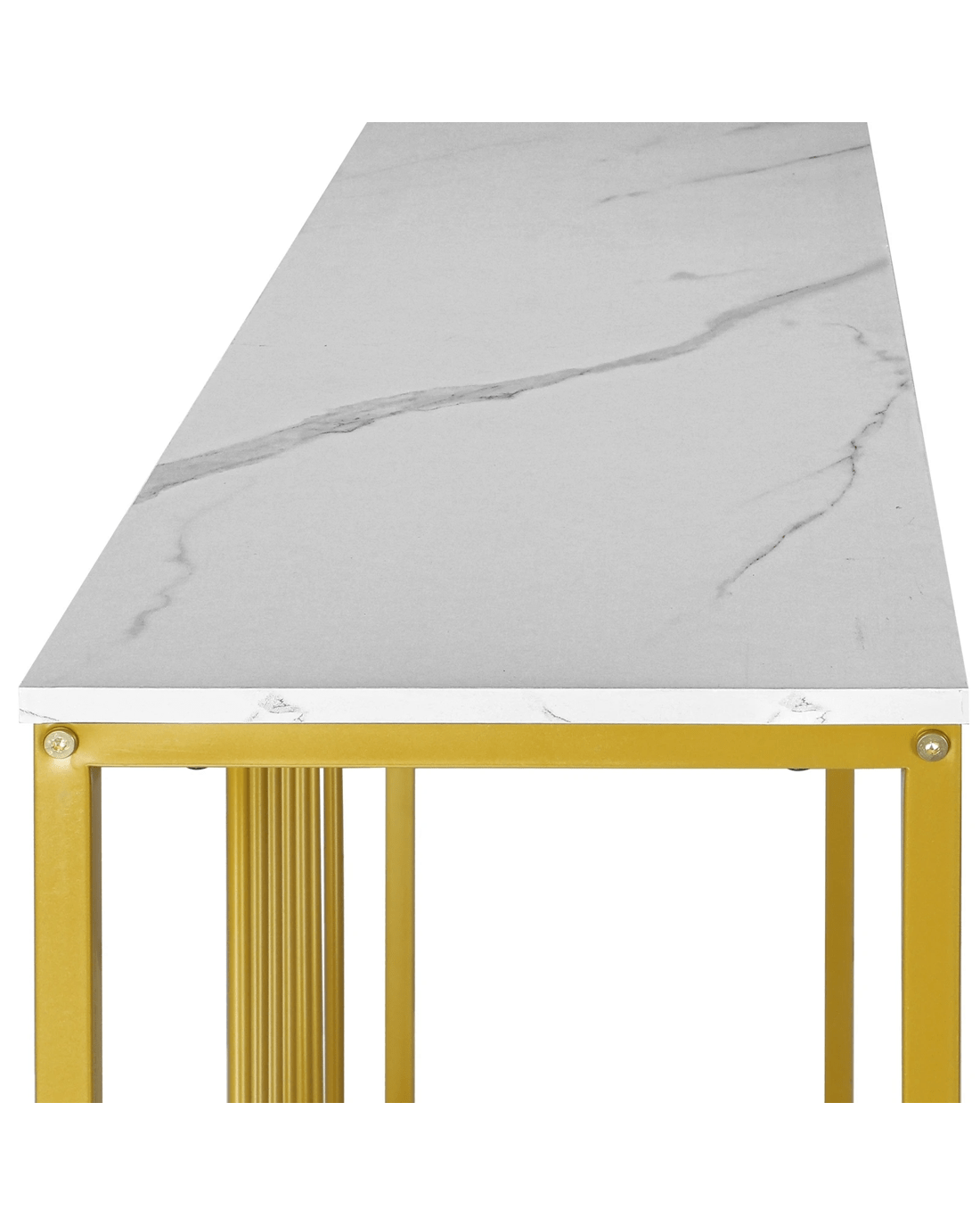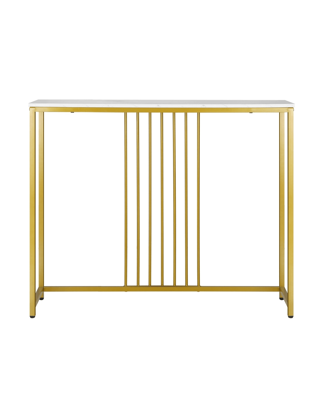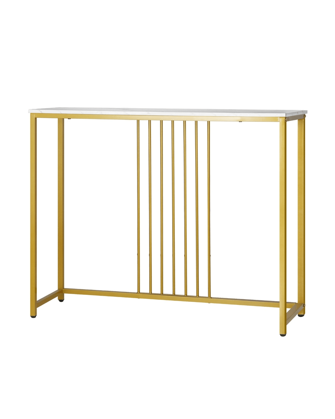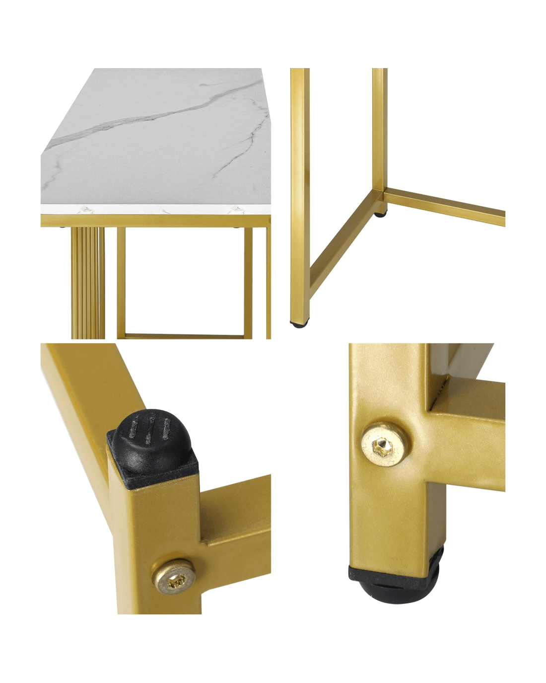 Crafted with high-quality materials and attention to detail, our console table is built to last. The sturdy metal frame provides a solid base for the table, while the smooth and marble-like tabletop offers a sleek and sophisticated surface for displaying decorative items or everyday essentials. The clean lines and modern design will complement any decor style, while the gold color frame make it stand out with your existing furniture.