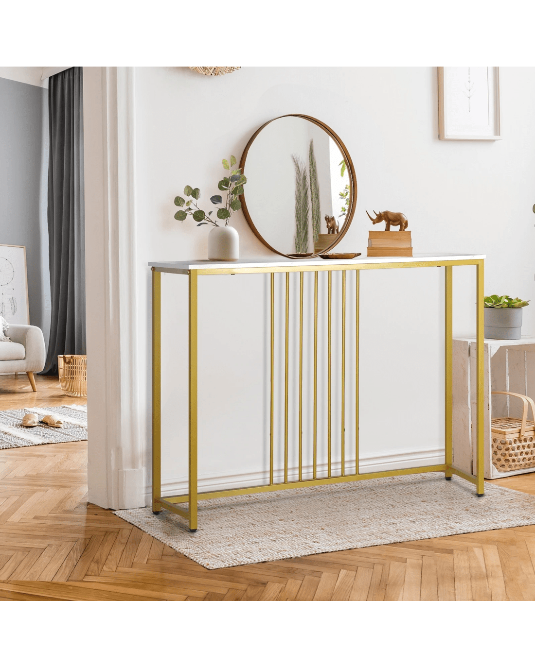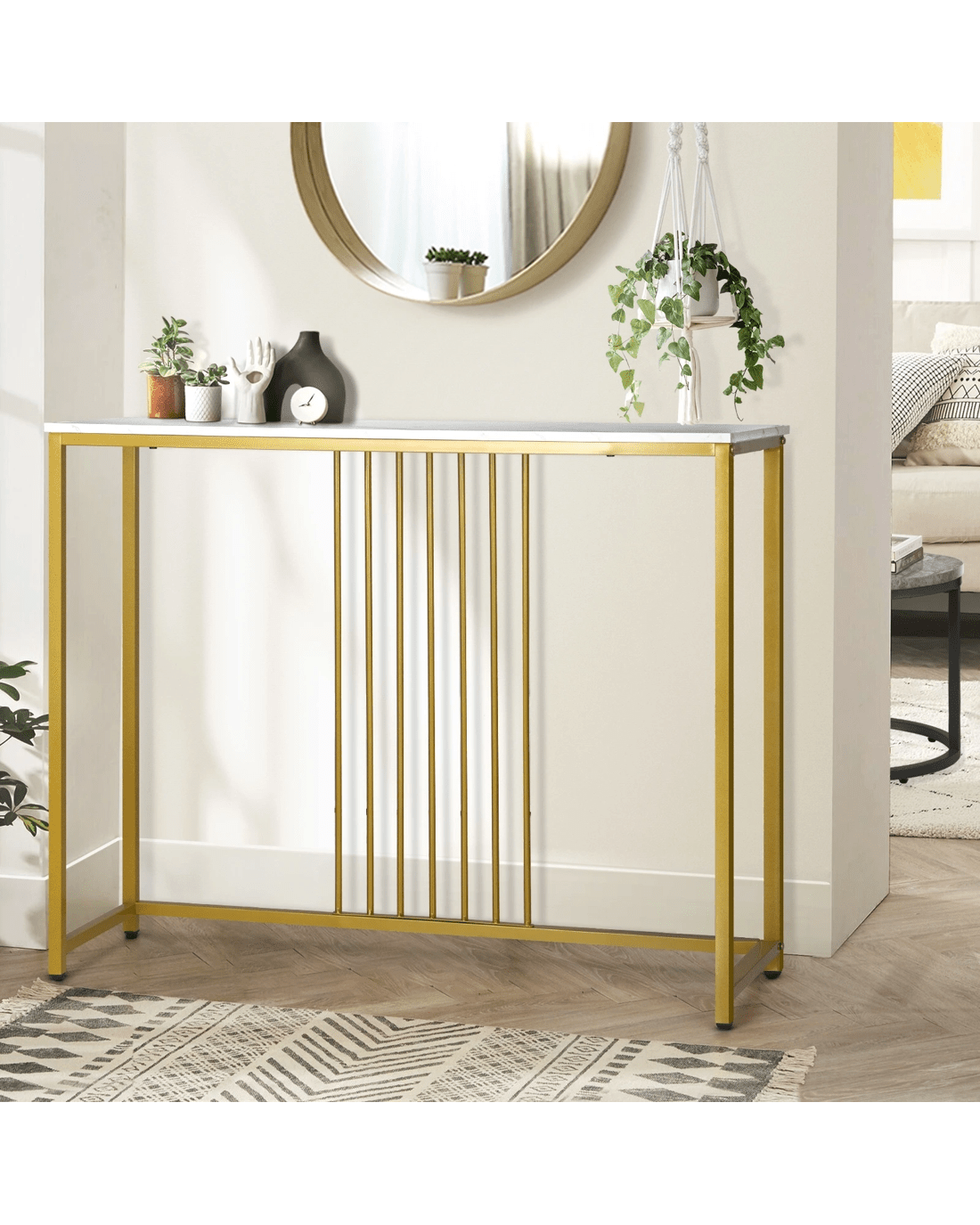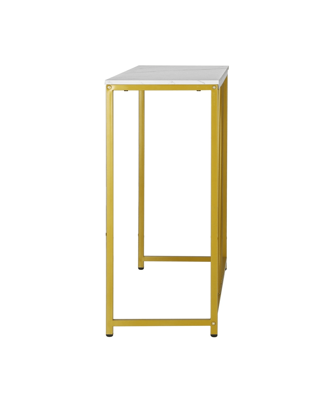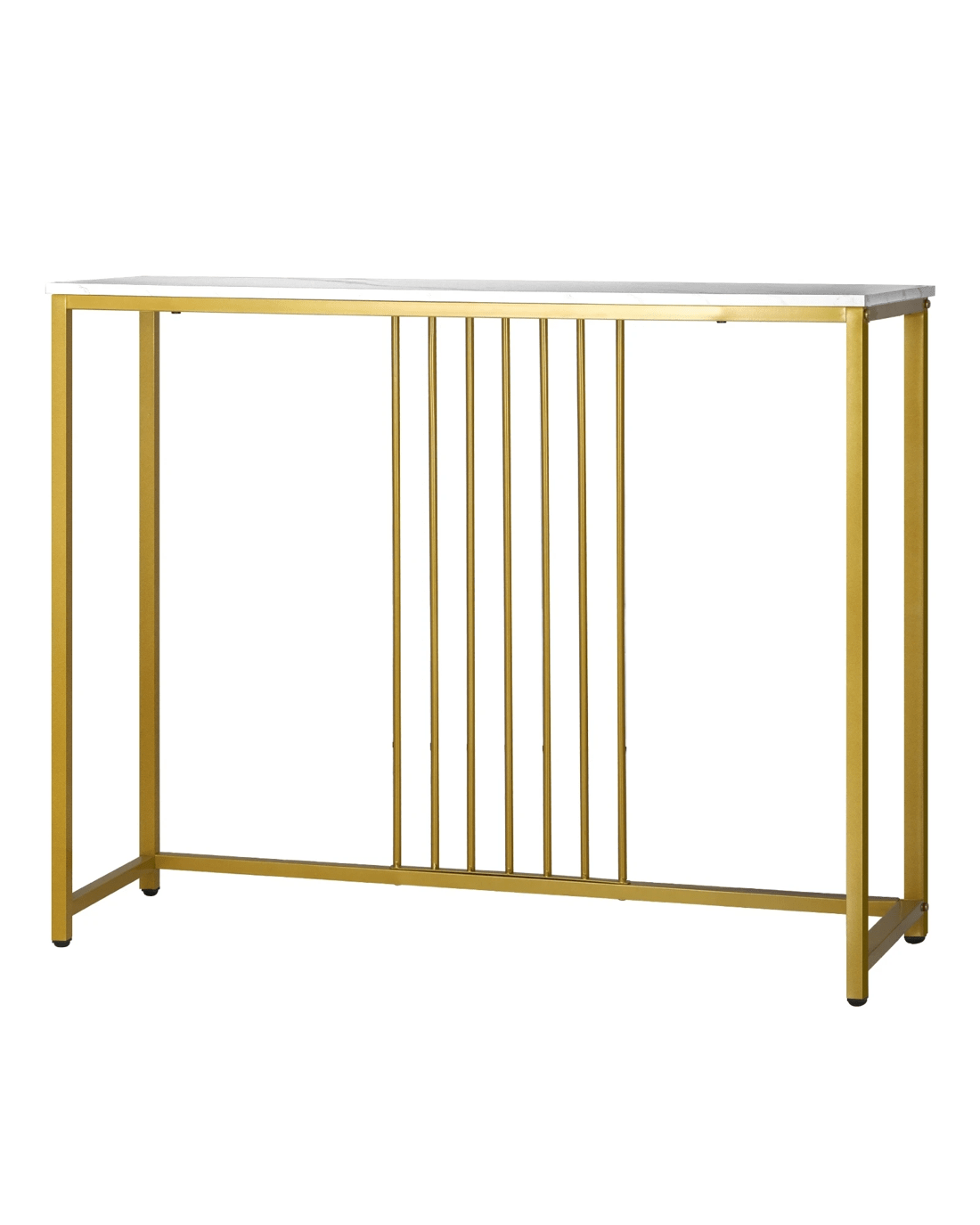 Crafted with high-quality materials and attention to detail, our console table is built to last. The sturdy metal frame provides a solid base for the table, while the smooth and marble-like tabletop offers a sleek and sophisticated surface for displaying decorative items or everyday essentials. The clean lines and modern design will complement any decor style, while the gold color frame make it stand out with your existing furniture.