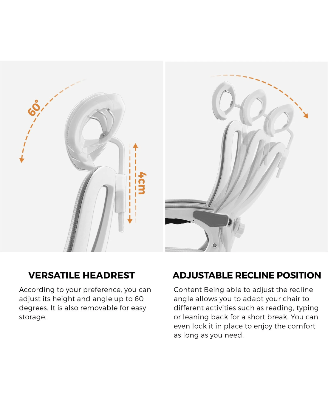 Are you ready to revolutionize your office experience? Our office chair comes with adjustable headrest, adjustable lumbar support, and recline feature and it's here to transform the way you work and relax. Say goodbye to discomfort and hello to a new level of ergonomic luxury.