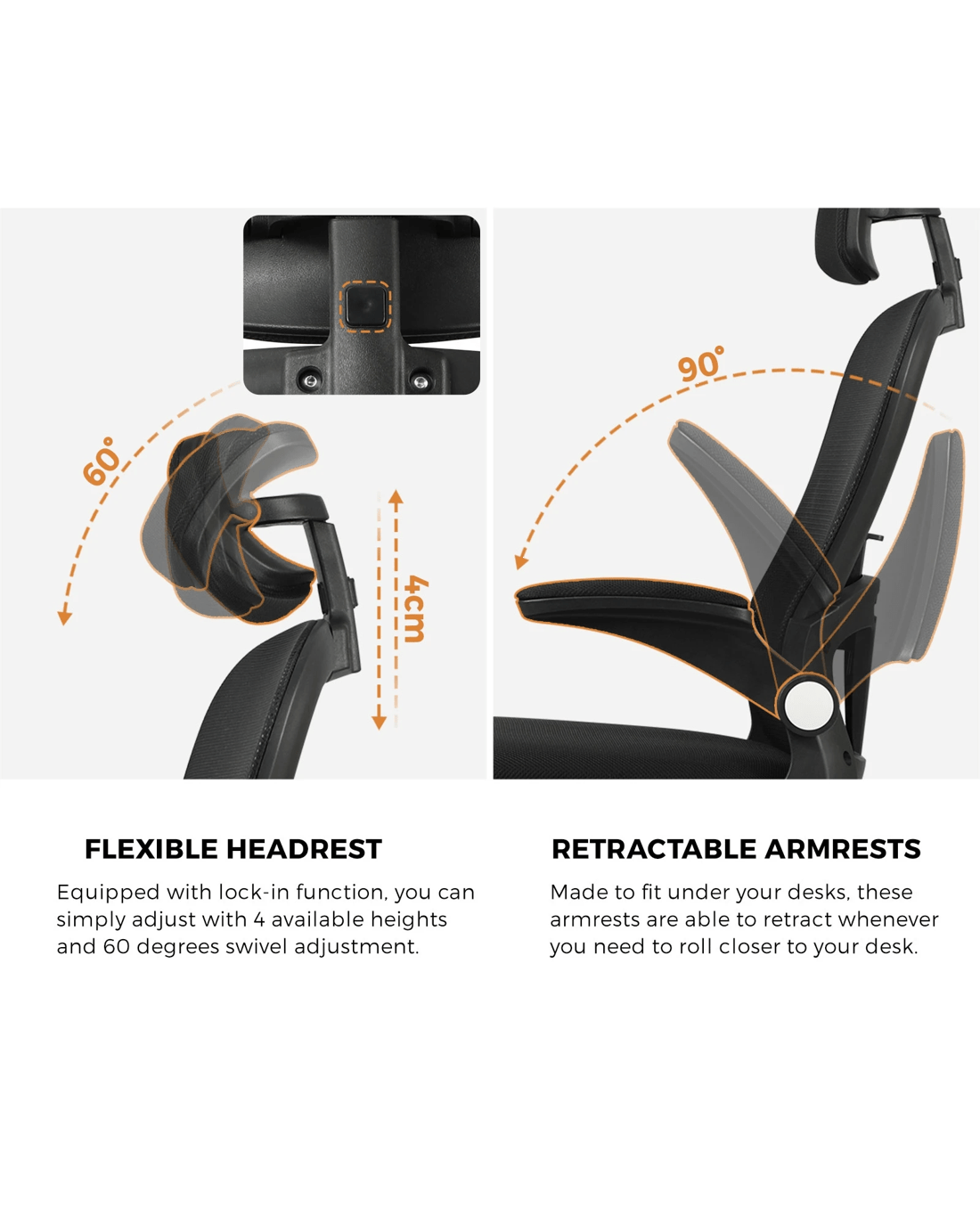 Featuring lock-in mode for headrest, you can simply adjust your desired position and angle and lock it in for the best comfort to rest your head when needed. If you no longer need it, you can simply unscrew it to remove it for a simpler look.