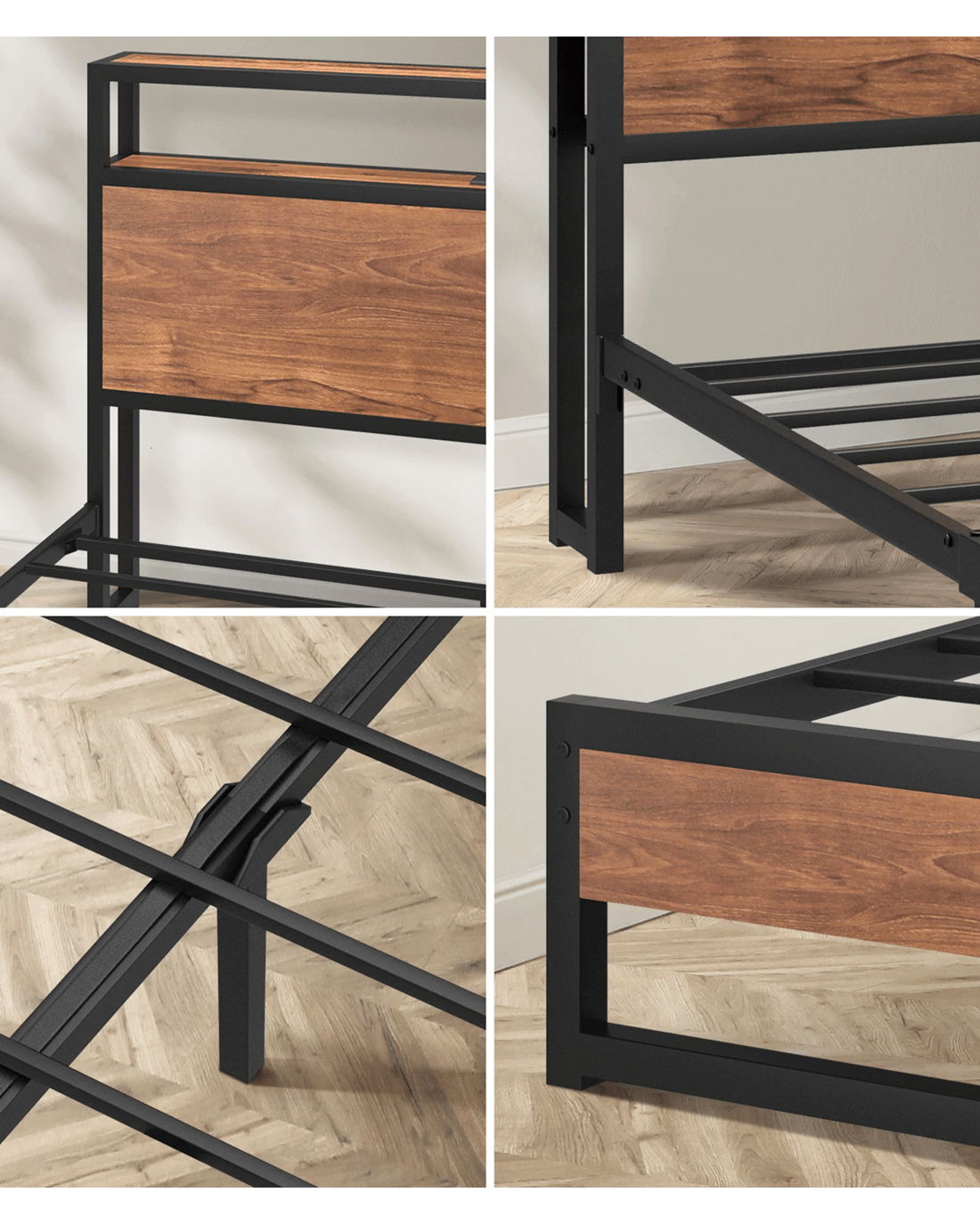First up, the eclectic metal bed frame is crafted in an industrial style that is both chic and swanky. And above the bed head lies a storage display shelf that lets you store all your bedroom essentials and anything else that meets your fancy to have at your bedside. Books, mementos, collectible or media devices. Add to that list anytime.