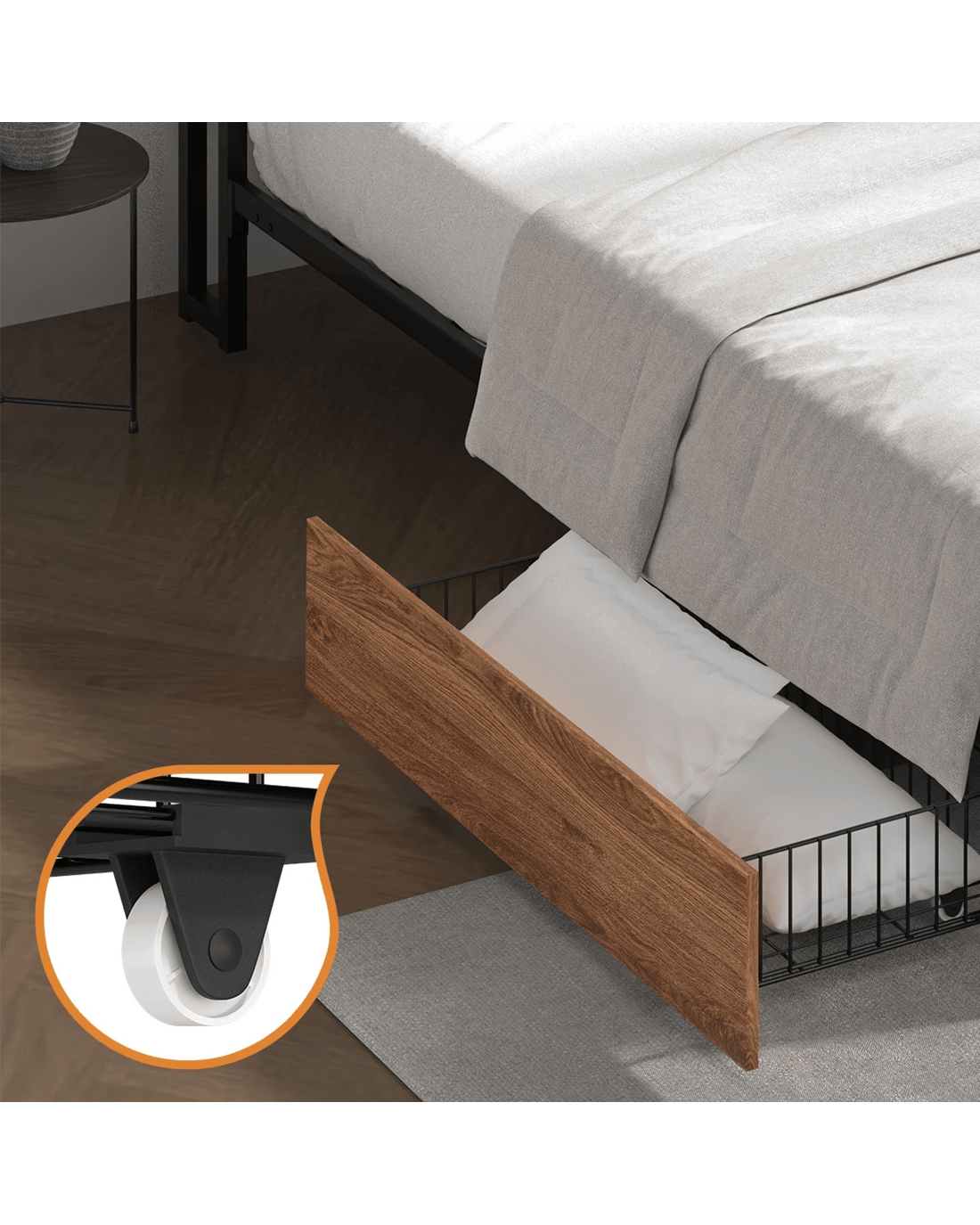 Not to be outdone, what lies beneath the metal bed frame is just as captivating. Smooth-sliding huge drawers for cavernous under-the-bed storage. Save yourself that chest of drawers and use these instead. Ingenious.