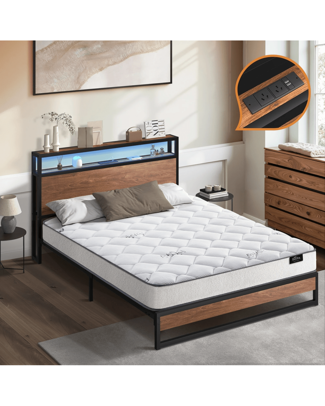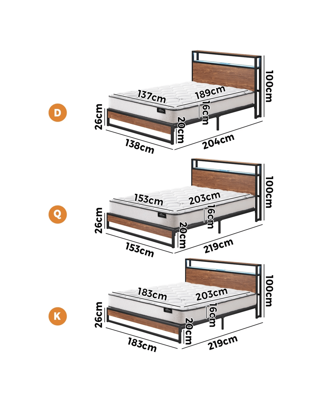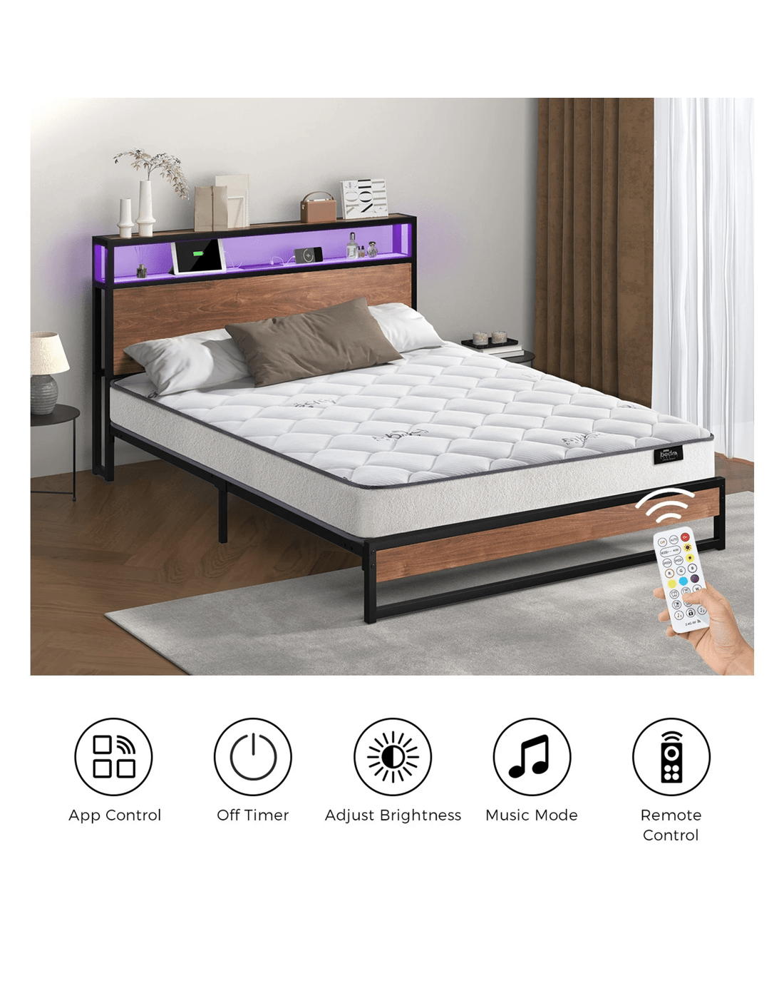 Sold by Kamprad's Oikos 1943Oikiture Metal Bed Frame King Size LED Storage USB with Mattress - Brown