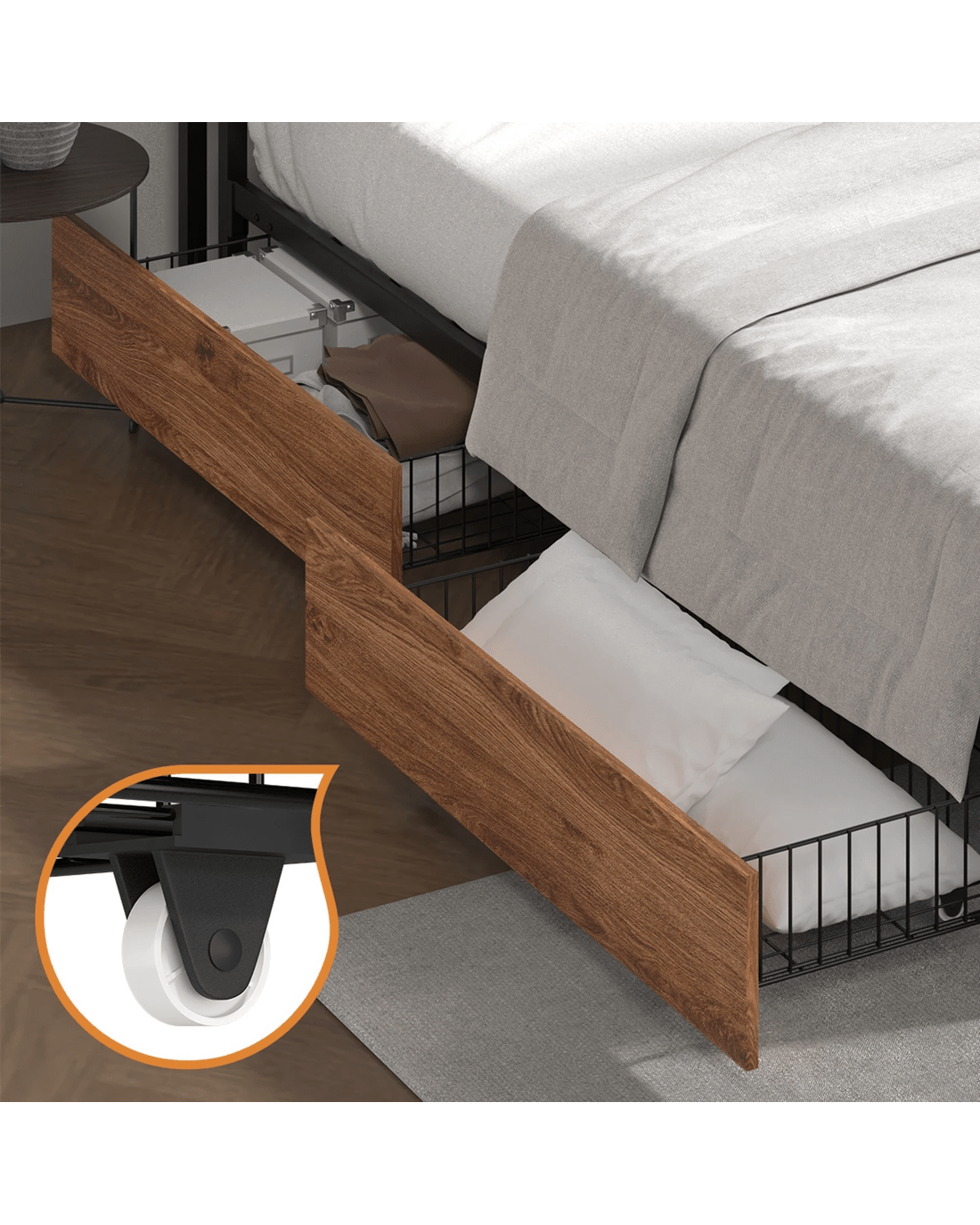 Not to be outdone, what lies beneath the metal bed frame is just as captivating. Smooth-sliding huge drawers for cavernous under-the-bed storage. Save yourself that chest of drawers and use these instead. Ingenious.