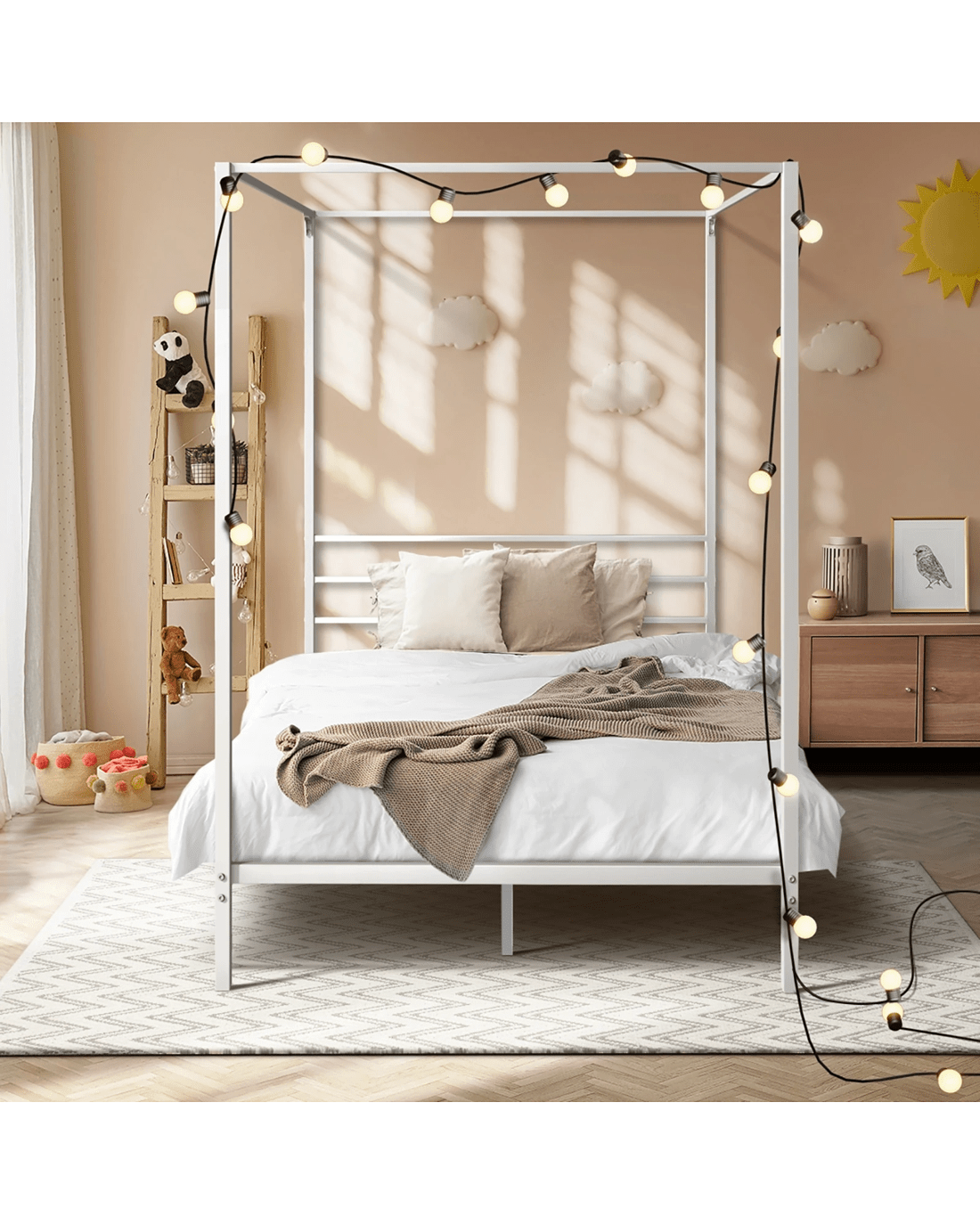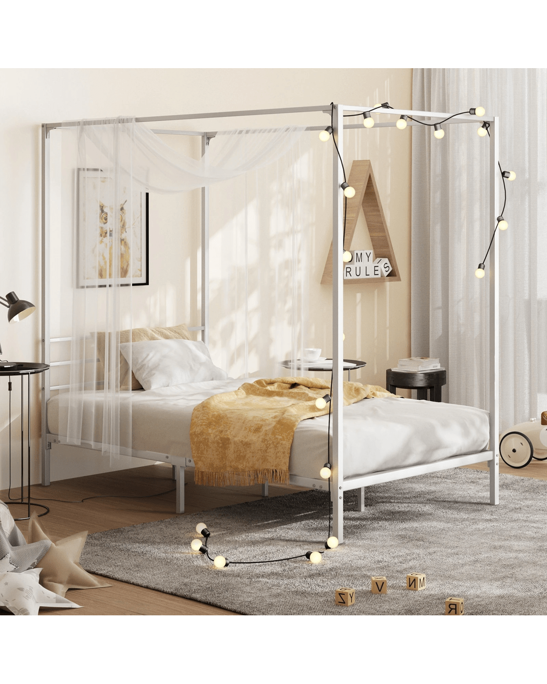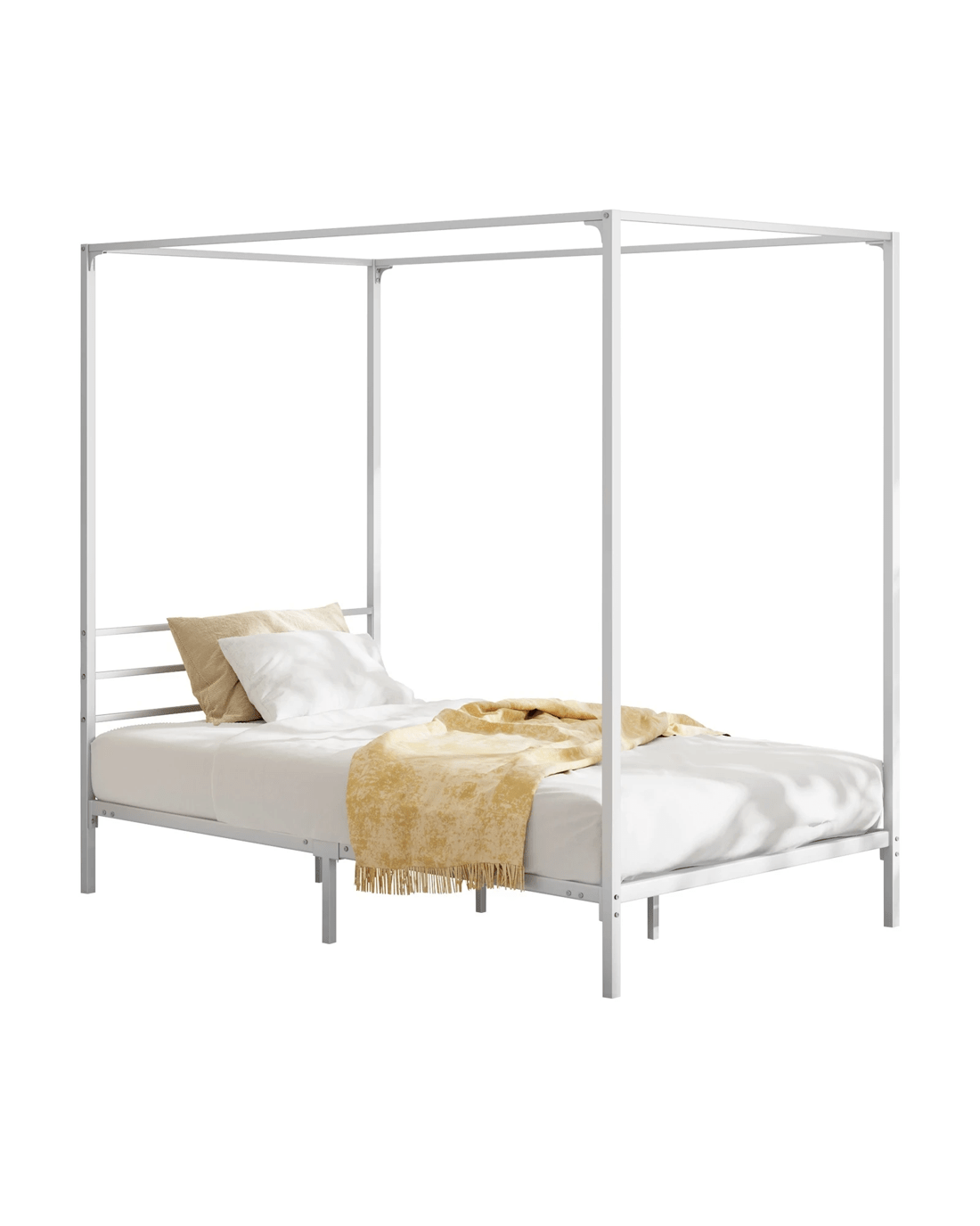 Experience the regal feel of a canopy bed, where the open-frame design not only adds visual height to your room but also creates an inviting cocoon for restful nights. The versatility of this canopy bed allows you to drape sheer fabrics or curtains, customizing the ambiance to suit your preferences. Crafted from high-quality metal, the bed frame ensures durability and stability, providing a reliable foundation for your mattress and ensuring a secure and comfortable night's sleep.
