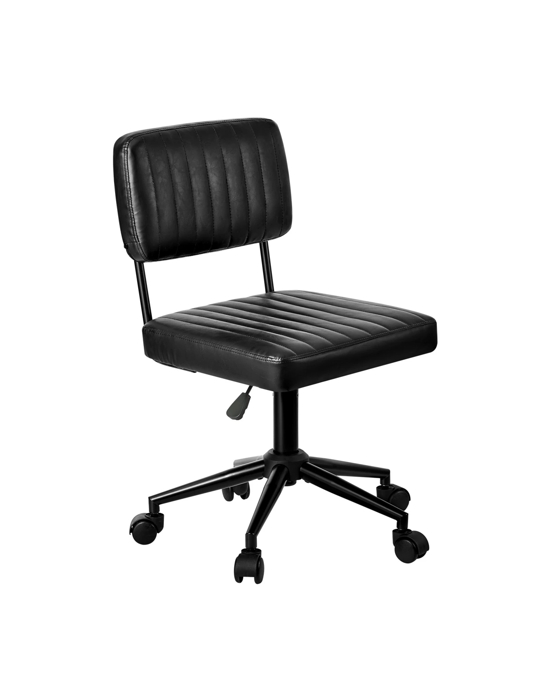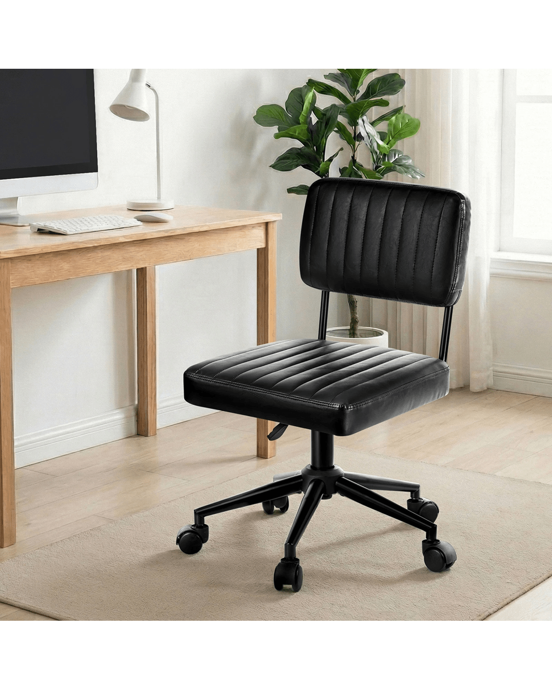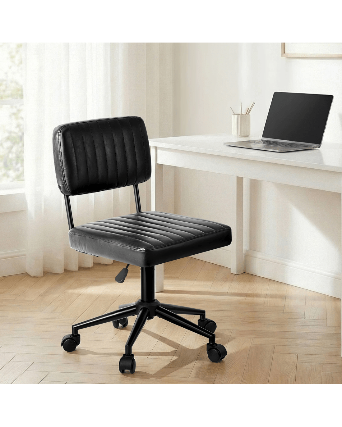 Upholstered in swanky faux leather for both the seat and backrest, the office chair exudes supreme comfort with style. The luxurious office chair features the armless design also allows the office chair to adapt to various spatial layouts, and be easily tucked entirely under the desk to save more floor space.