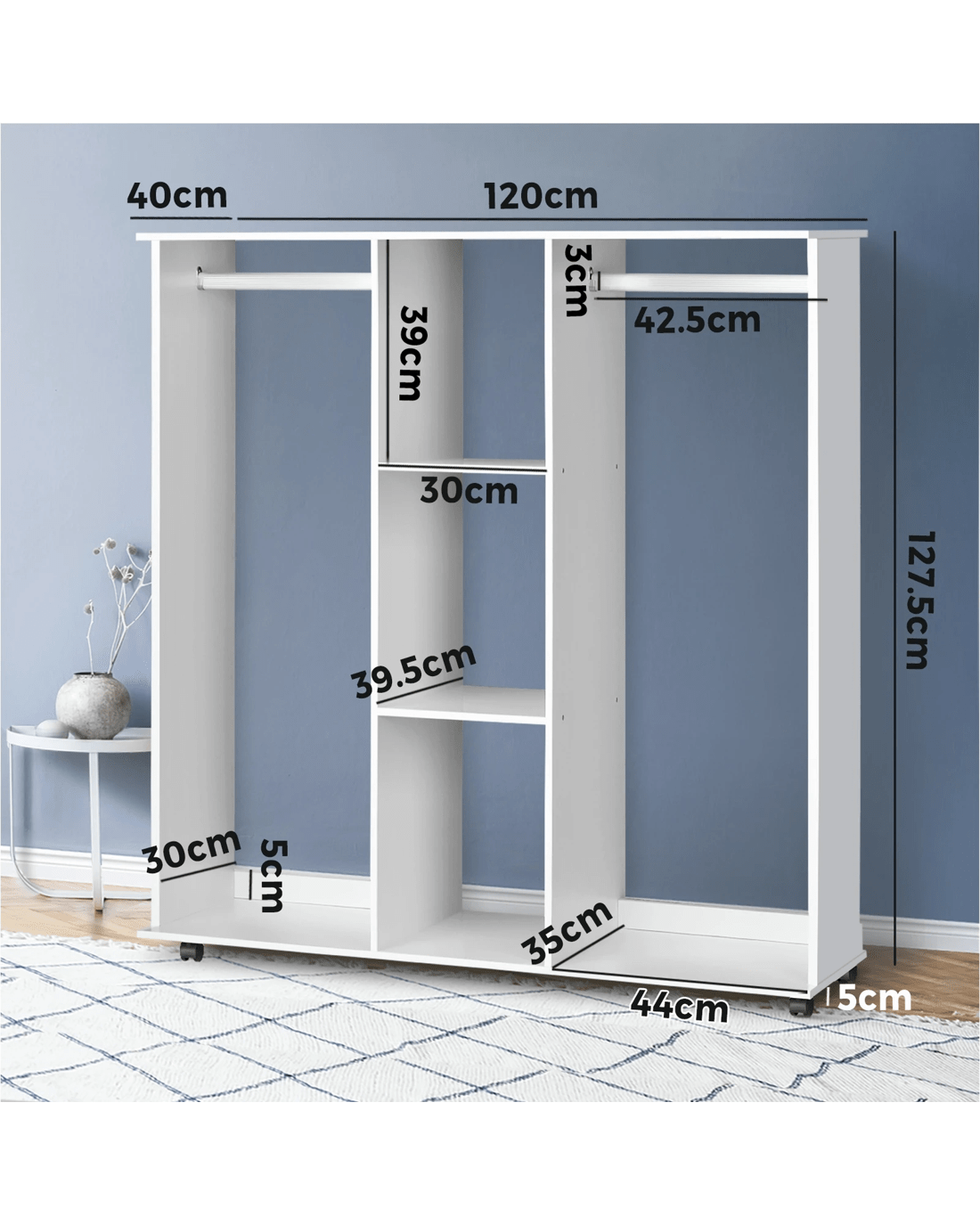 2 hanging rails and 3-tier cube storage