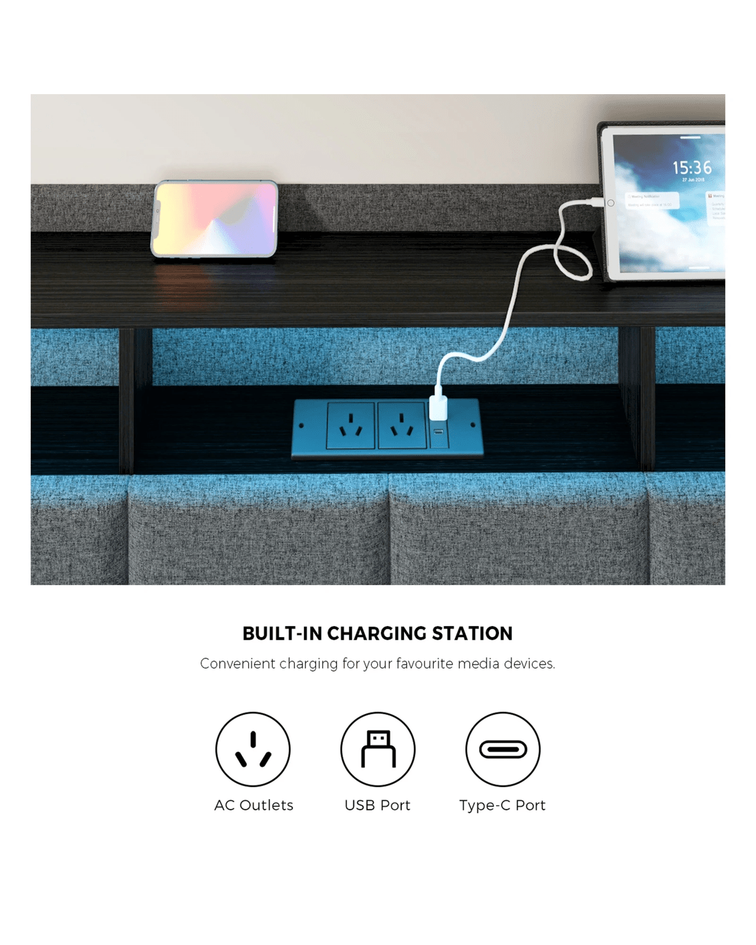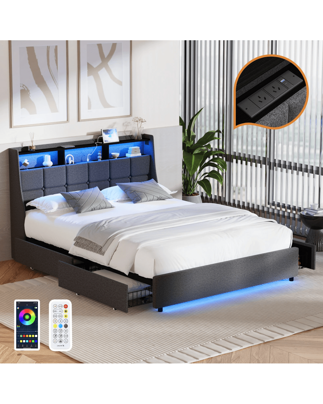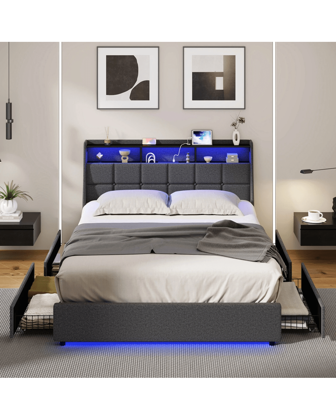Sold by Kamprad's Oikos 1943Oikiture Queen Bed Frame With LED Storage Headboard 2 Drawers & Charging Station - Grey