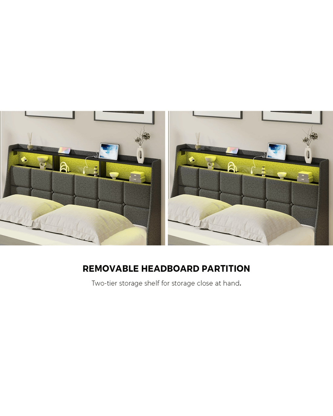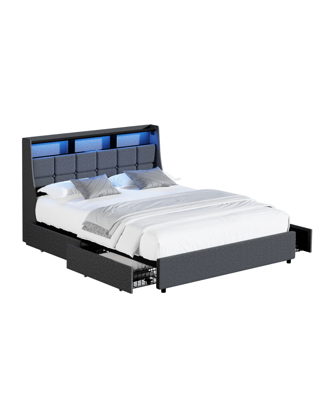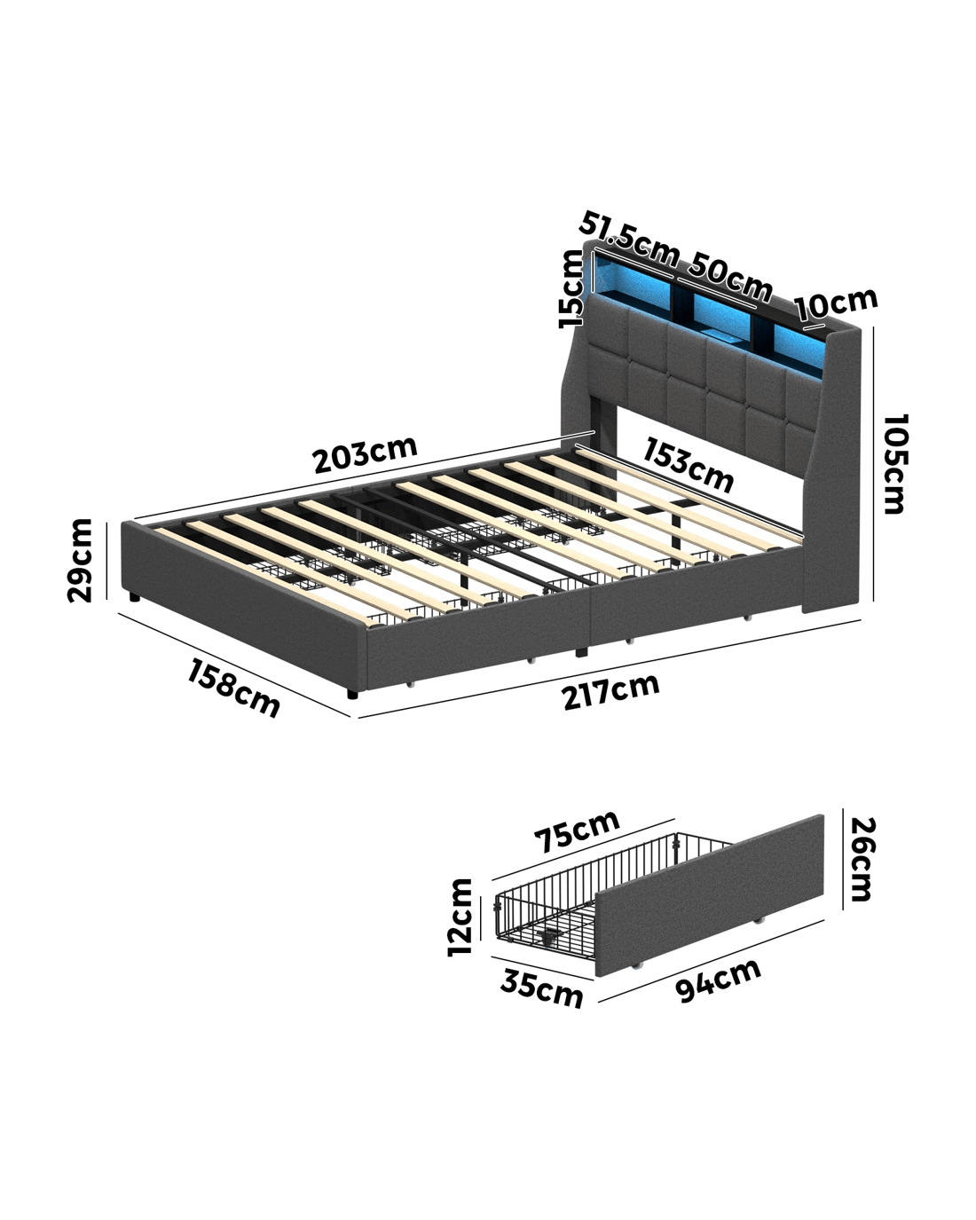 Sold by Kamprad's Oikos 1943Oikiture Queen Bed Frame With LED Storage Headboard 2 Drawers & Charging Station - Grey