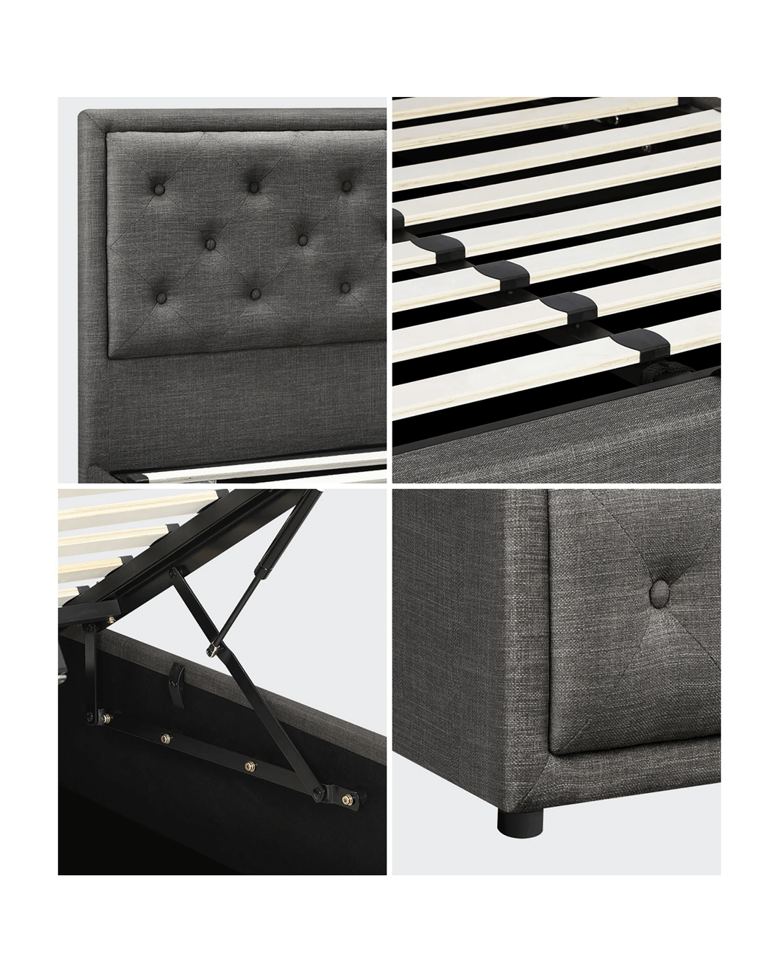 Featuring a well-padded tufted bedhead and bed end design with a PU leather or premium linen fabric option, the Oikiture Gas Lift Bed Frame exudes bespoke elegance and adds a luxurious presence to any bedroom decor. Soft to the touch that lends a swank and intimate aura to accompany your calm and restful sleep. But there's more to the bed frame than just an attractive appearance. The finishing is meticulous with exacting workmanship all round. Inside, the thick 13mm wooded reinforced slats provide end-to-end support for the mattress while the sturdy legs ensure that the bed frame stands up to durable use time and again.