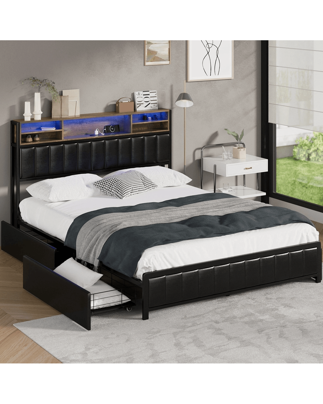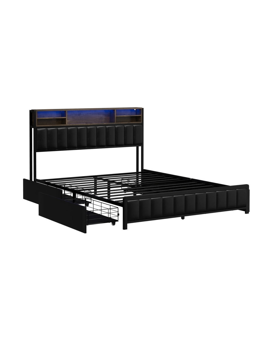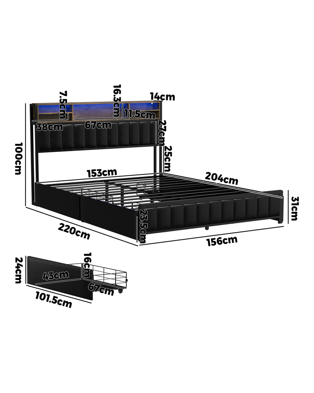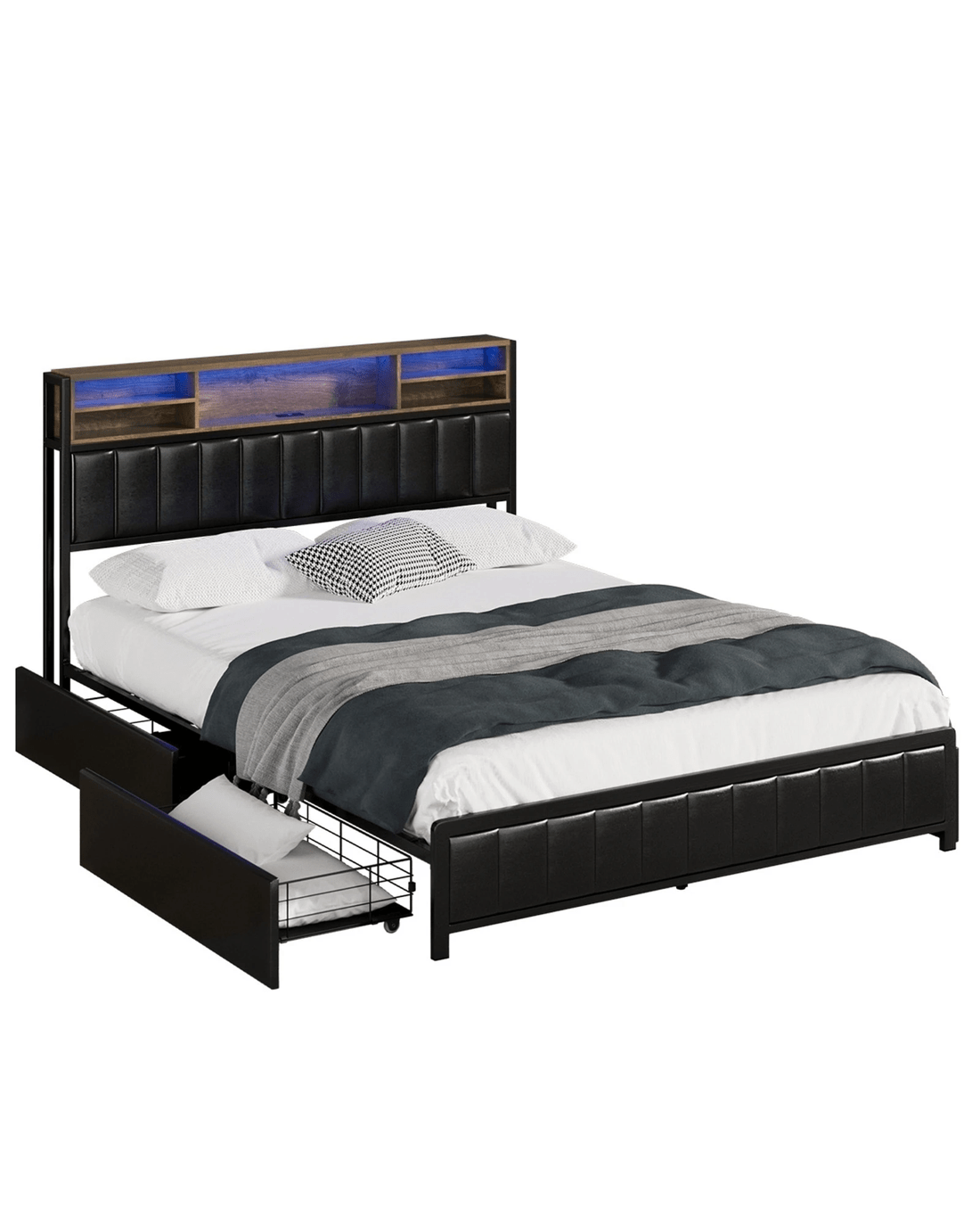 Oikiture Queen Bed With Led Storage Bedhead 4 Drawers Charing Port - Black