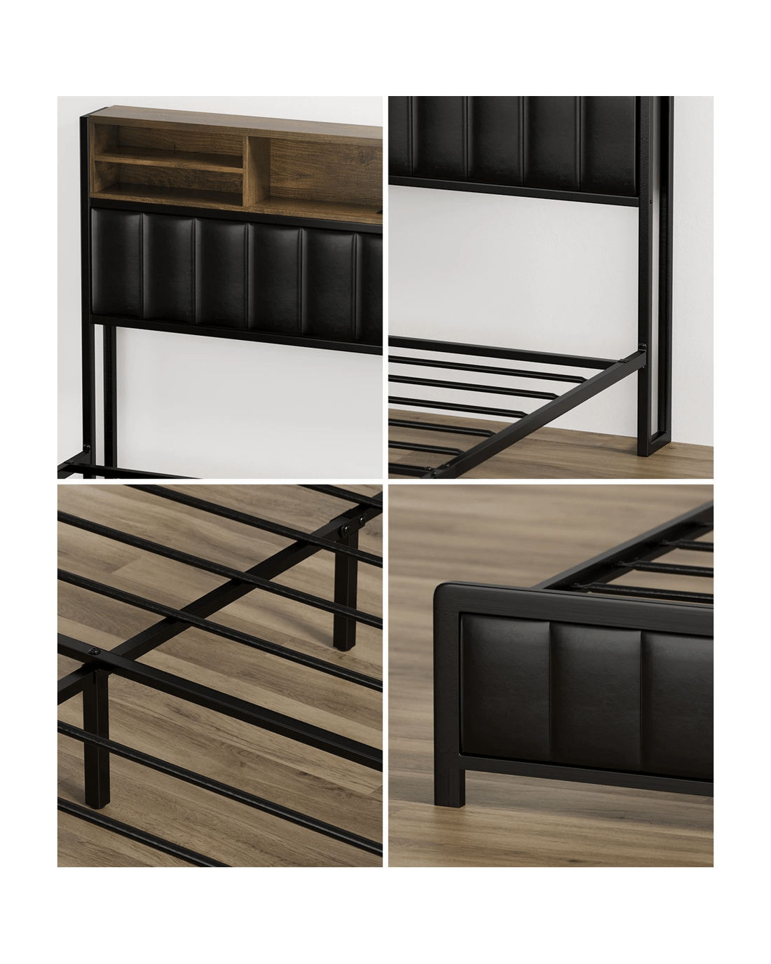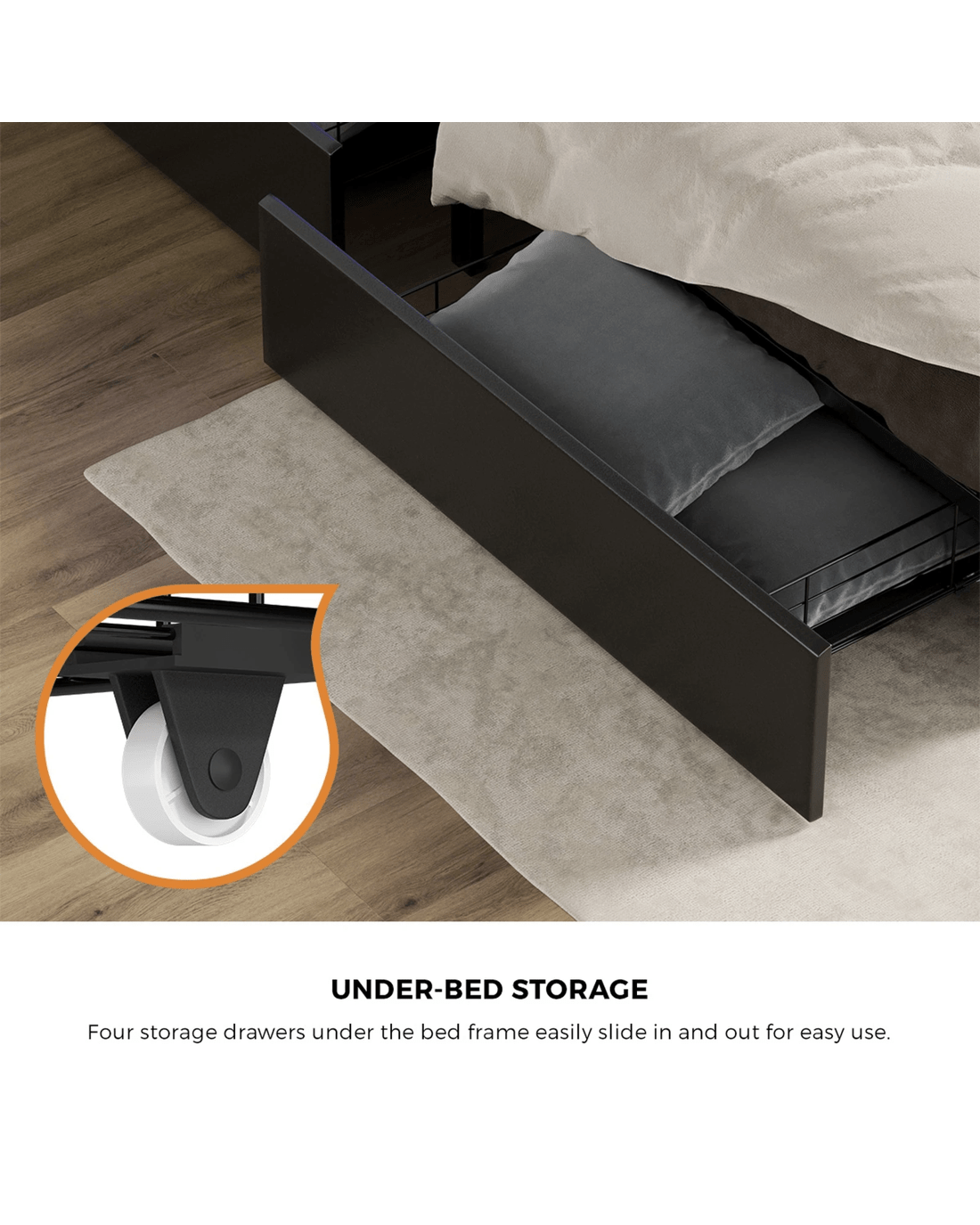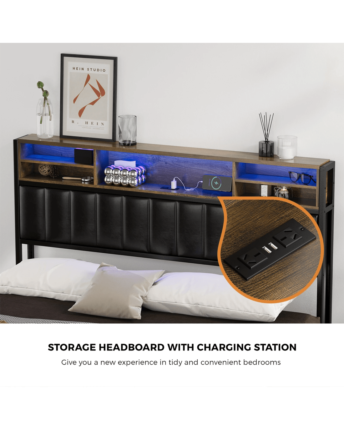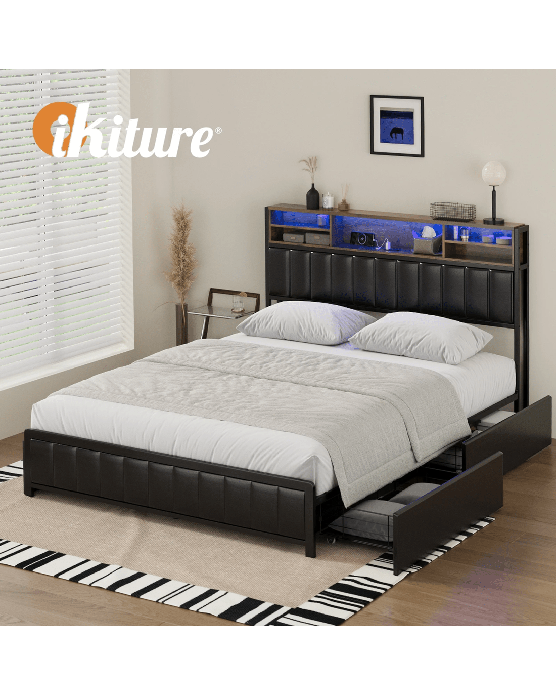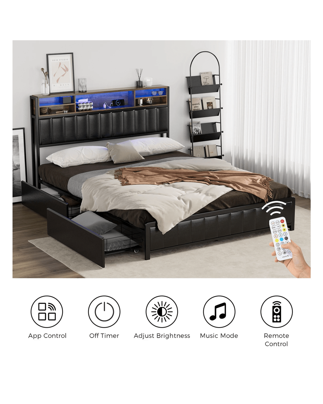 Oikiture Queen Bed With Led Storage Bedhead 4 Drawers Charing Port - Black