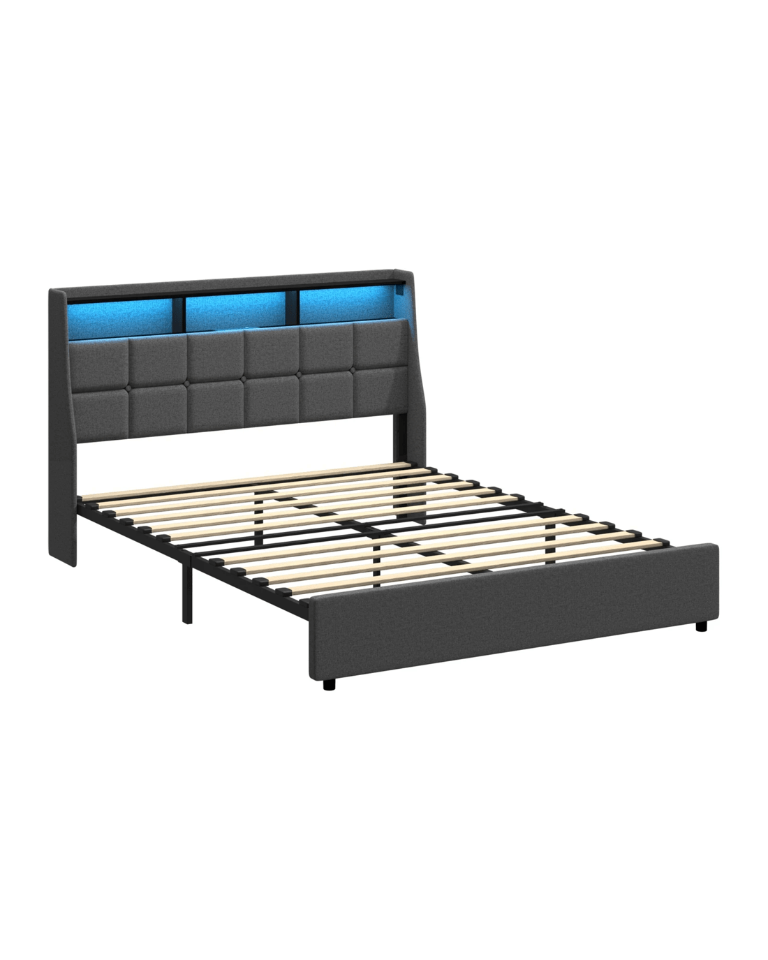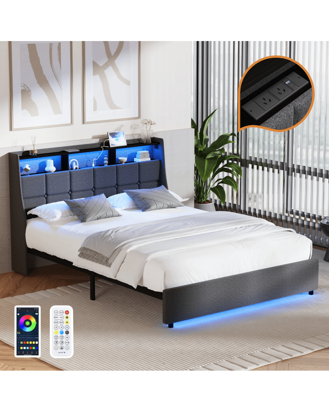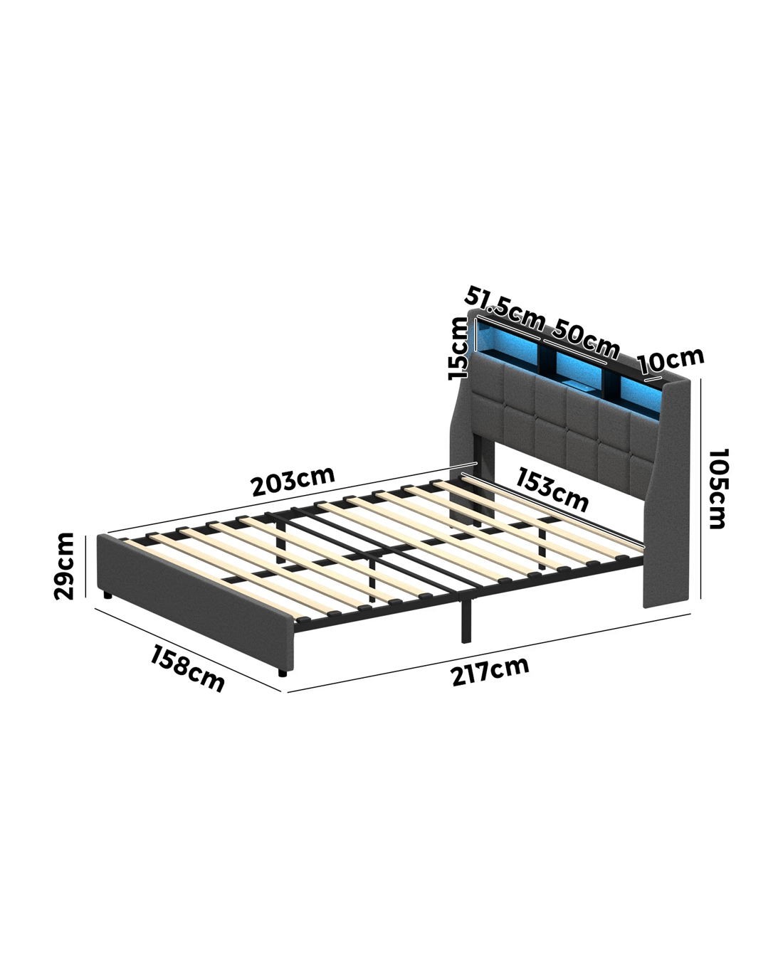 Sold by Kamprad's Oikos 1943Oikiture Queen Size Bed Frame LED Storag Headboard & Charging Station - Grey